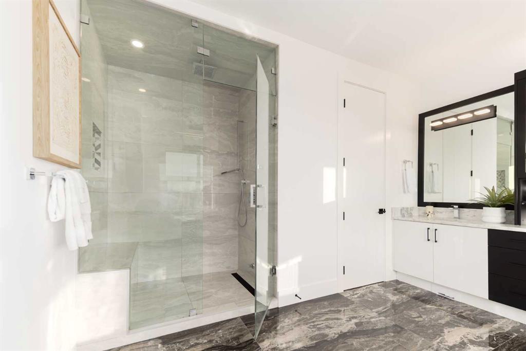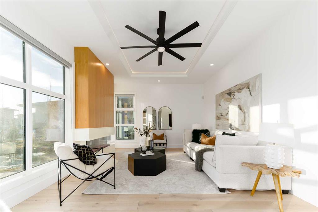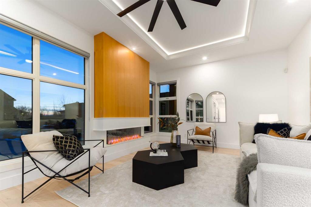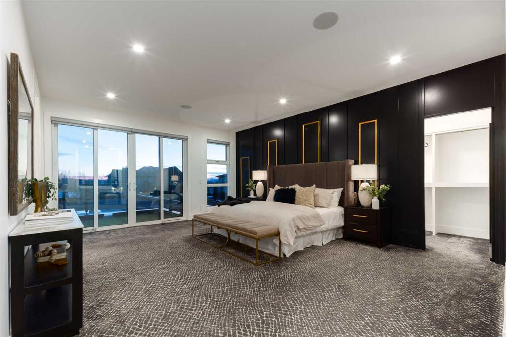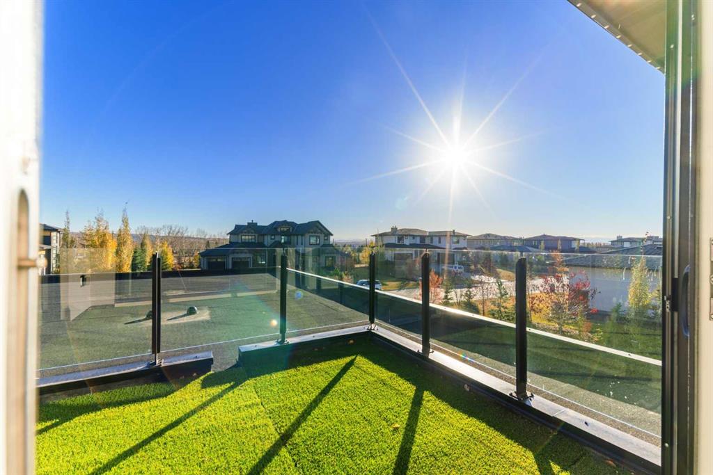 OPEN HOUSE THIS SATURDAY JANUARY 24TH FROM 3:00PM TO 5:00PM! This modern estate in Calgary’s prestigious Watermark community showcases precision construction, advanced systems, and contemporary design spanning throughout over 7600 SF of total developed living space. A heated four-car garage features a durable epoxy floor, radiant in-floor and gas heating, a half bath, and ample space for a workshop or bench setup. Inside, a residential elevator provides full accessibility across all levels, while engineered hardwood flooring, custom millwork, and an open-riser glass staircase define the home’s architectural character. The great room features a tray ceiling with recessed lighting and a linear gas fireplace framed in charcoal tile, blending form and function. The chef’s kitchen is anchored by dual onyx-clad islands, gloss-white cabinetry, brass fixtures, and Jenn-Air professional appliances, complemented by a full prep kitchen with induction cooktop, secondary refrigerator, and dishwasher for seamless entertaining. The formal dining area includes built-in cabinetry, crown detailing, and geometric backsplash, while a front sitting room with a wood-accent fireplace, glass-enclosed office, and powder room with onyx counter and brass accents complete the main level. A well-appointed mudroom offers full-height storage, marbled tile, and a built-in bench for easy transitions. Upstairs, the primary suite includes a private balcony with mountain views, dual walk-in closets, and a spa ensuite with heated floors, dual vanities, steam shower with dual rain heads, and a deep soaker tub. Three additional bedrooms feature walk-in closets, with both Jack & Jill and private ensuite layouts. The upper level also offers a loft, study nook, and laundry room with quartz counters, extending to an outdoor patio finished with glass railings and synthetic turf. The lower level is designed for recreation and fitness, with a quartz wet bar, brass fixtures, beverage fridge, custom shelving, media area, mirrored gym, and two bedrooms with walk-in closets and full baths. Finishes include luxury vinyl plank, recessed lighting, and marbled tile throughout. Mechanical highlights feature radiant in-floor heating throughout the lower level, high-efficiency HVAC, smart lighting controls, and an integrated sound system — combining craftsmanship, durability, and performance in one of Watermark’s most technically refined residences.