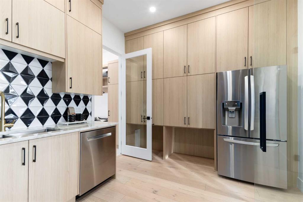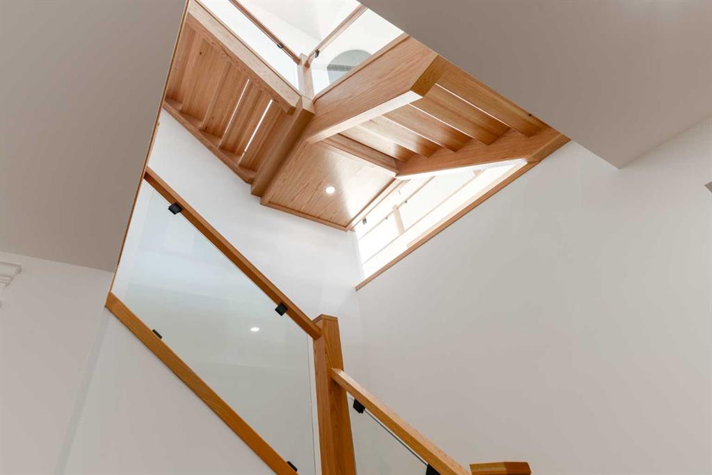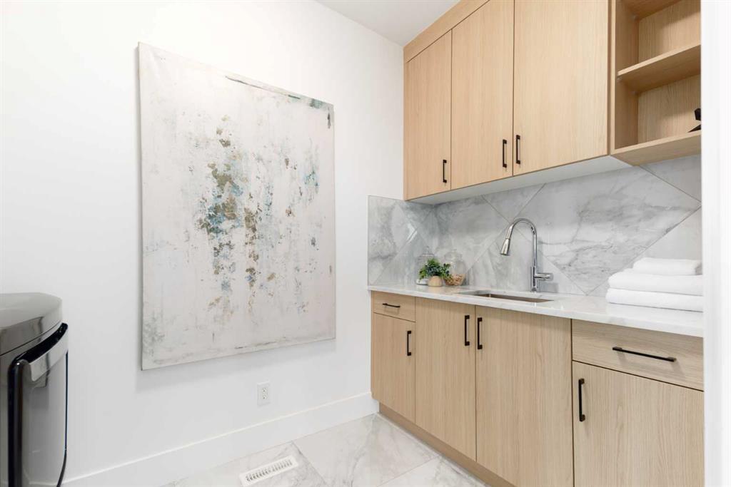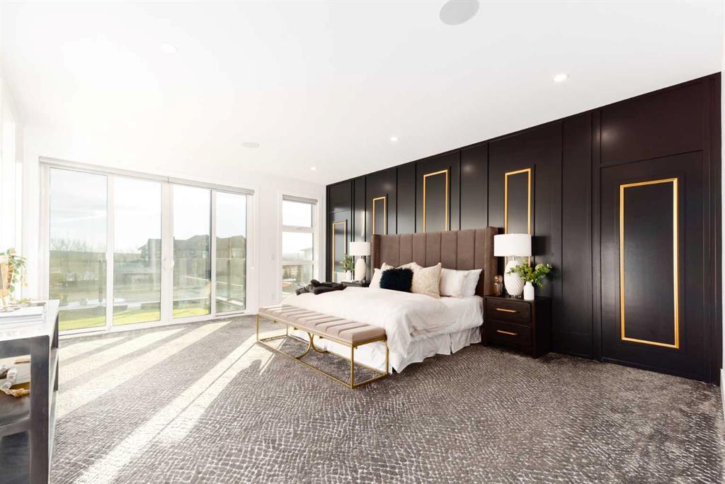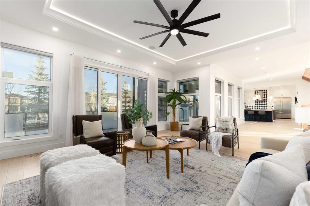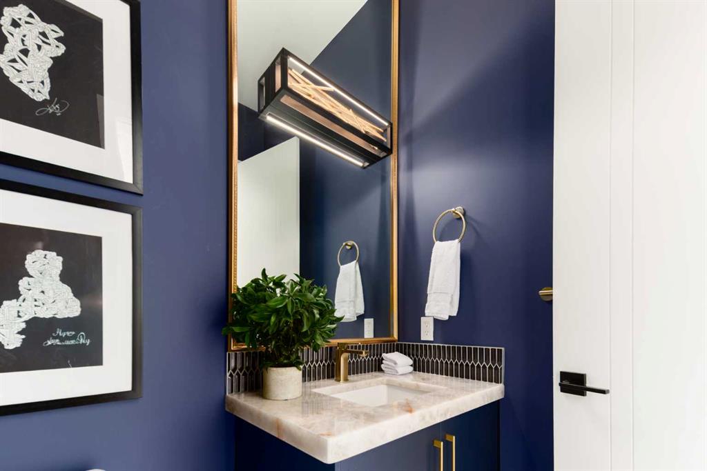 OPEN HOUSE THIS SATURDAY JANUARY 24TH FROM 3:00PM TO 5:00PM! This modern estate in Calgary’s prestigious Watermark community showcases precision construction, advanced systems, and contemporary design spanning throughout over 7600 SF of total developed living space. A heated four-car garage features a durable epoxy floor, radiant in-floor and gas heating, a half bath, and ample space for a workshop or bench setup. Inside, a residential elevator provides full accessibility across all levels, while engineered hardwood flooring, custom millwork, and an open-riser glass staircase define the home’s architectural character. The great room features a tray ceiling with recessed lighting and a linear gas fireplace framed in charcoal tile, blending form and function. The chef’s kitchen is anchored by dual onyx-clad islands, gloss-white cabinetry, brass fixtures, and Jenn-Air professional appliances, complemented by a full prep kitchen with induction cooktop, secondary refrigerator, and dishwasher for seamless entertaining. The formal dining area includes built-in cabinetry, crown detailing, and geometric backsplash, while a front sitting room with a wood-accent fireplace, glass-enclosed office, and powder room with onyx counter and brass accents complete the main level. A well-appointed mudroom offers full-height storage, marbled tile, and a built-in bench for easy transitions. Upstairs, the primary suite includes a private balcony with mountain views, dual walk-in closets, and a spa ensuite with heated floors, dual vanities, steam shower with dual rain heads, and a deep soaker tub. Three additional bedrooms feature walk-in closets, with both Jack & Jill and private ensuite layouts. The upper level also offers a loft, study nook, and laundry room with quartz counters, extending to an outdoor patio finished with glass railings and synthetic turf. The lower level is designed for recreation and fitness, with a quartz wet bar, brass fixtures, beverage fridge, custom shelving, media area, mirrored gym, and two bedrooms with walk-in closets and full baths. Finishes include luxury vinyl plank, recessed lighting, and marbled tile throughout. Mechanical highlights feature radiant in-floor heating throughout the lower level, high-efficiency HVAC, smart lighting controls, and an integrated sound system — combining craftsmanship, durability, and performance in one of Watermark’s most technically refined residences.