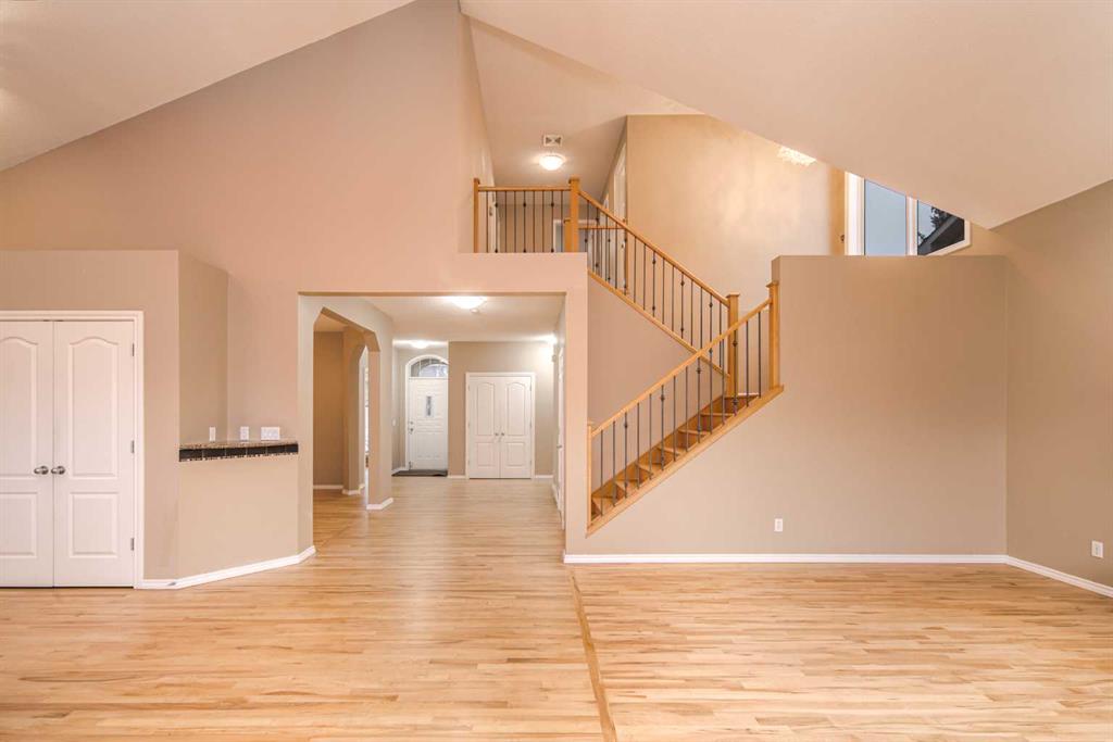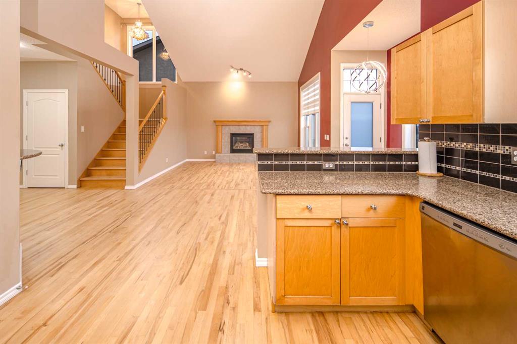 Backing onto a serene green belt, this cozy and well-kept 2-storey home is located in the highly sought-after community of Hanson Ranch. Offering a total of over 2,200 sq. ft. of living space, the main level features an open-concept design starting with a bright den/office, a spacious formal dining area, and a vaulted gourmet kitchen complete with granite countertops and maple cabinetry. The impressive 17-ft open-to-below living room is highlighted by a beautiful fireplace, while maple hardwood floors flow throughout the main floor.