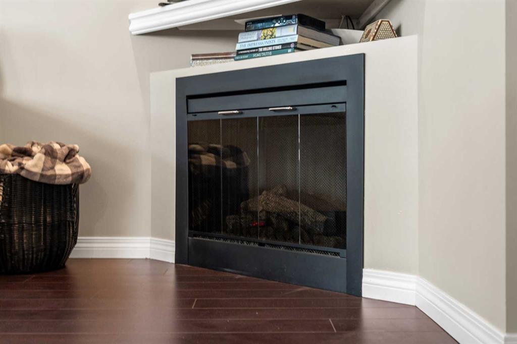 The living room is bright and inviting, anchored by a cozy corner fireplace that makes the space feel comfortable year-round.