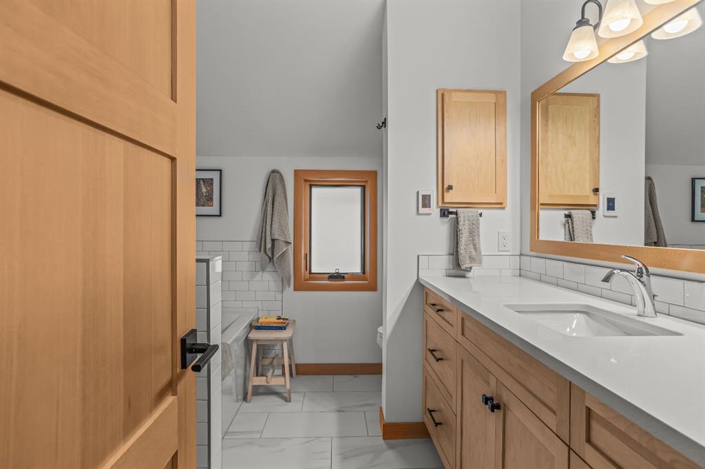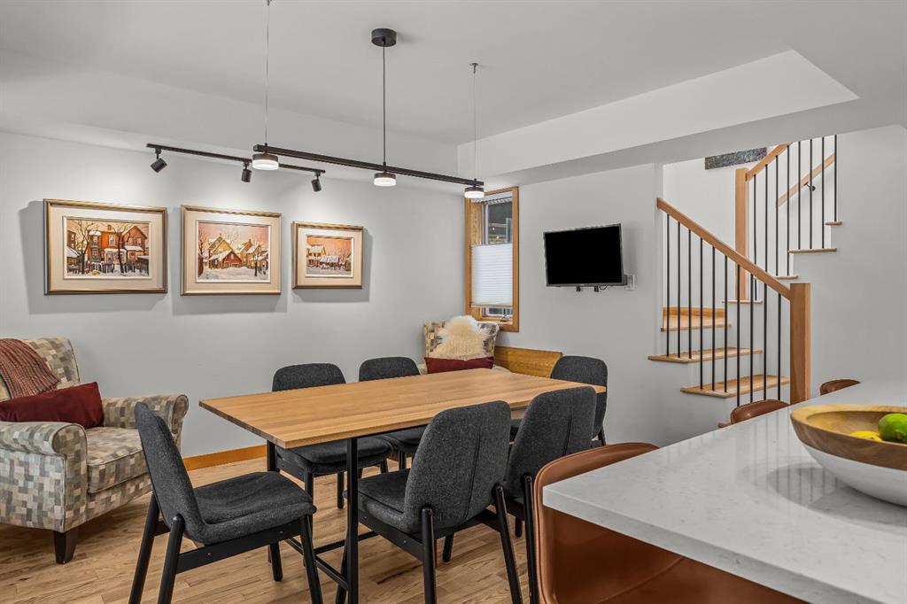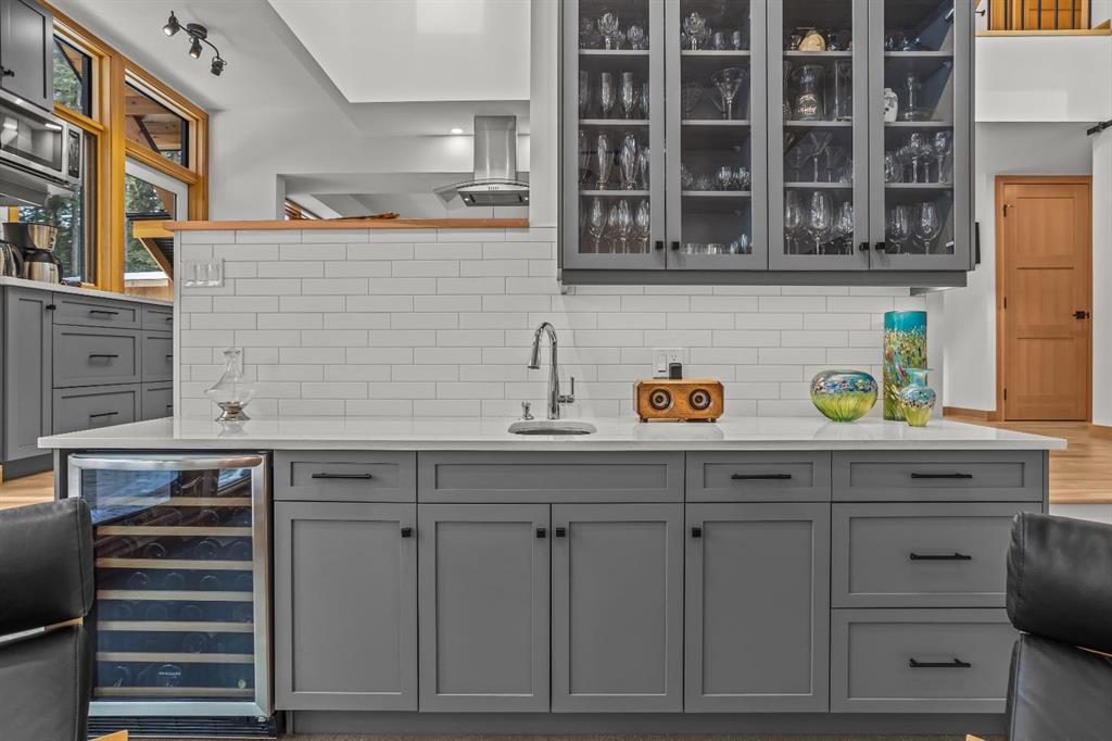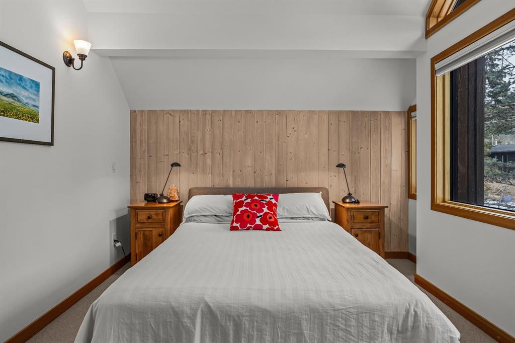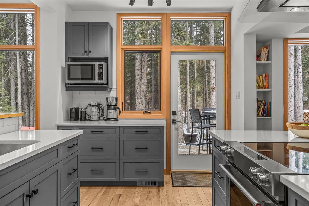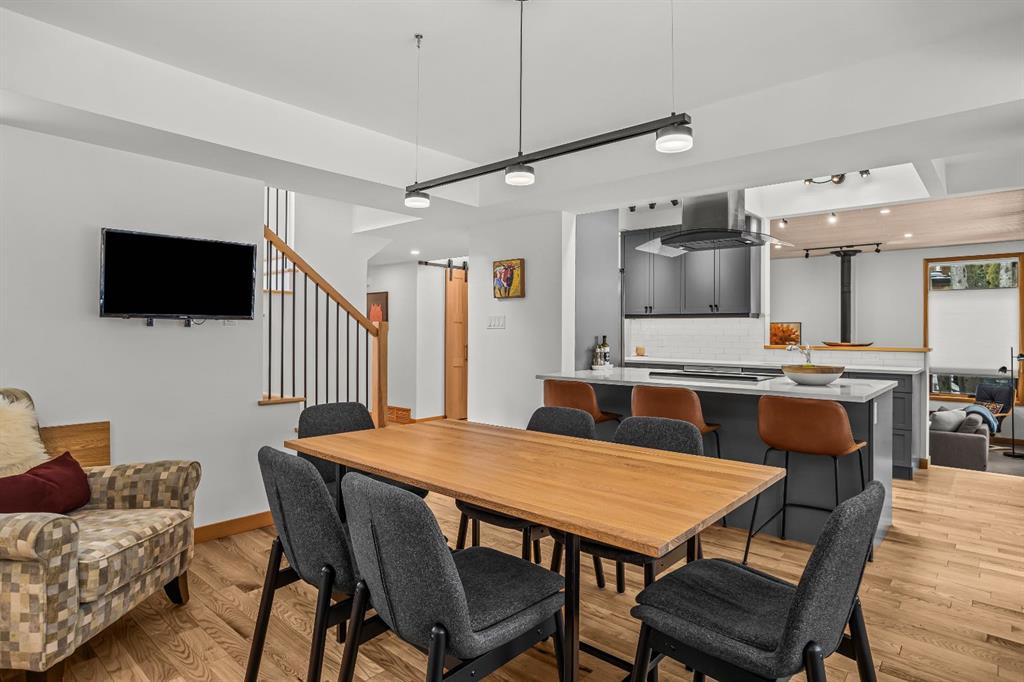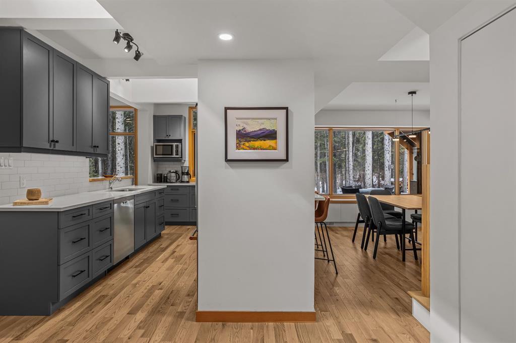 Tucked into the heart of Canmore, this beautifully fully renovated 4-bedroom, 2-bath home offers a rare blend of privacy, walkability, and thoughtful design. Backing directly onto a peaceful treed reserve and creek, the setting feels quiet and secluded – yet you’re just steps from cafés, shops, restaurants, and the town’s extensive pathway network. Completely re-done in 2021, the home showcases warm, modern finishes throughout, including oak hardwood flooring, custom fir millwork, and vaulted ceilings. Large windows frame forest views and fill the home with natural light, while the open-concept layout creates an effortless flow for both everyday living and entertaining. The kitchen is designed with both style and function in mind, featuring quartz countertops, stainless steel appliances, a skylight, and a thoughtfully designed pantry with butcher block workspace. Just beyond, the dining and living areas offer inviting spaces to gather – complete with a wood-burning stove, feature wet bar, and seamless connection to the expansive outdoor deck. Step outside to your private backyard oasis – backing onto nature and designed for year-round enjoyment. With ample space for dining, lounging, and evenings around the fire, plus natural gas hookups and low-maintenance landscaping, it’s the perfect extension of the home. Inside, the four bedrooms offer exceptional flexibility. Built-in Murphy beds allow for easy transformation between guest space, office, or family living, while the upper-level primary retreat features two walk-in closets and a beautifully appointed ensuite with a soaker tub. A private balcony off one of the upper bedrooms provides a quiet place to take in the surrounding forest views. Additional features include a heated concrete slab on the main level, a spacious mudroom with built-in storage, high-efficiency laundry, an oversized heated garage with epoxy floors, and a backyard storage shed. With easy highway access and an unbeatable central location, this is a home that offers both convenience and a true connection to nature – designed to adapt to your lifestyle and elevate everyday living.