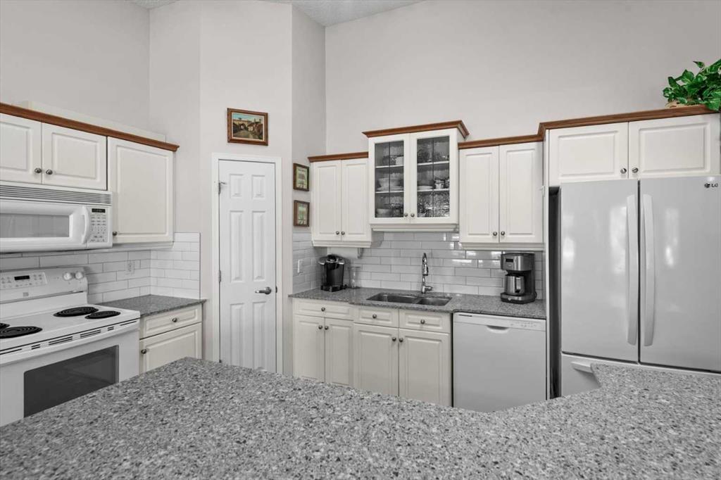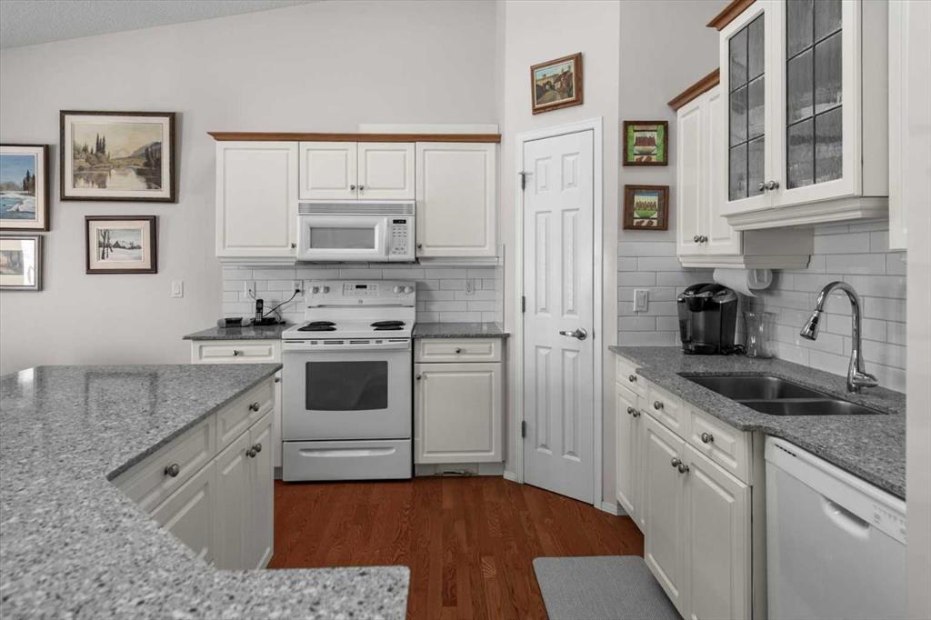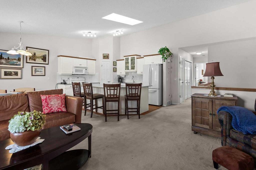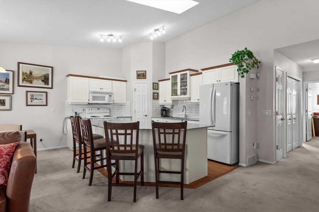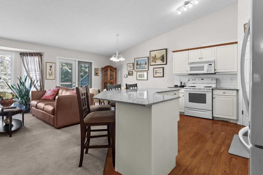 There’s a particular kind of ease that comes with the right home at the right chapter of life. This reverse walkout villa in the Highlands of Valley Ridge has that quality, the kind that’s hard to manufacture but immediately felt the moment you walk through the door. The upper level is where daily life unfolds beautifully. An open-concept kitchen, dining, and living space catches the light generously, anchored by a corner gas fireplace that earns its place as the room’s quiet focal point. The kitchen is thoughtfully laid out — a large island for morning coffee or casual catch-ups, ample cabinetry, a corner pantry, and real counter space to actually cook in. Updated quartz countertops and subway tile backsplash bring a clean, bright energy, the kind of quiet refresh that makes everything feel considered. The dining area opens to a large, tree-shaded deck where morning coffee tastes a little better, summer dinners linger well past sunset, and conversations with longtime friends seem to find their way here naturally. Surrounded by mature trees, it carries the feeling of a mountain retreat without leaving the city.