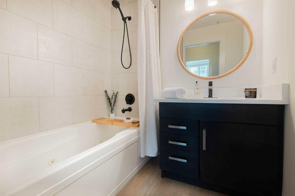 This unit offers two generously sized bedrooms, each with ample closet space, along with two full bathrooms. The primary ensuite features a relaxing jetted tub, perfect for unwinding at the end of the day. A dedicated desk area near the entrance provides the ideal setup for working from home.