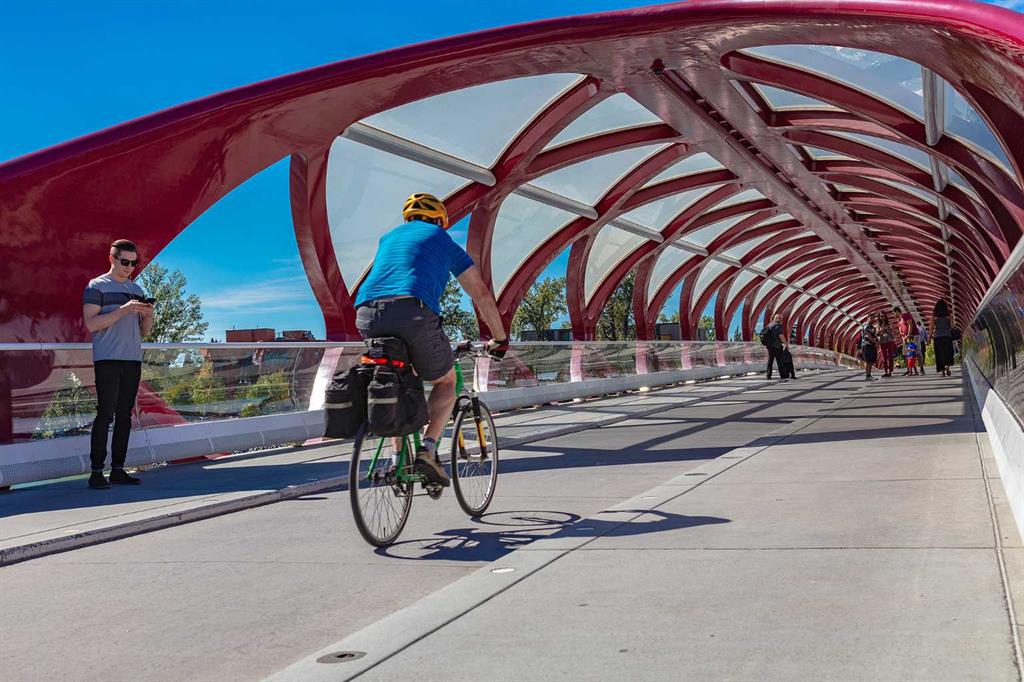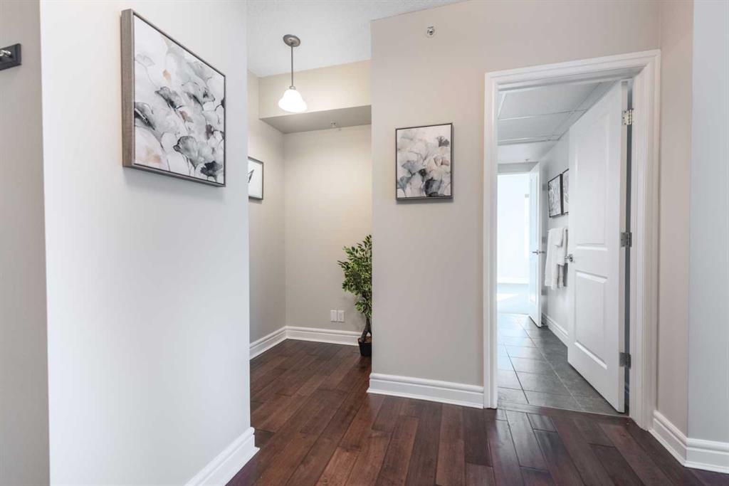 Sophisticated urban condo living is yours in this freshly painted, bright & stylish, very desirable, 2 bdrm + den/2 full bath, south east CORNER, CITY VIEW suite, wrapped in windows, at Five West – one of Calgary’s PREMIER executive condo buildings. You’ll be impressed with the hardwood floors throughout the main living areas and the efficient floor plan as soon as you walk in – spacious front entry with den space, great sized kitchen with luxurious granite counters, sleek stainless steel appliances and lots of cabinets, dining area with glass door to the south facing balcony with gas BBQ line, cozy corner gas fireplace in the living room all surrounded in windows! Primary bedroom offers lots of space to easily accommodate a king-sized bedroom, walk in closet and 4 pc main ensuite. Second bedroom, set apart from the primary, offers a cheater ensuite bath – so convenient for a room mate or guests. The abundance of natural light throughout the suite is truly memorable! There is of course central air conditioning, an in-suite laundry room with extra storage area, extra storage locker and one titled parking stall is included. Five West building amenities incl. concierge service (so nice!), owners lounge, car wash bay & indoor visitor parking for when friends stop by for a drink or dinner. The location is superb, an easy walk to your DT work, restaurants & coffee shops, 2 blocks from the LRT free downtown zone. The river pathway is a block away for a walk, jog or bike ride at the end of the day or to enjoy your weekend, and just across the bridge is the vibrancy of all Kensington has to offer. This suite is move in ready – Call to view today!