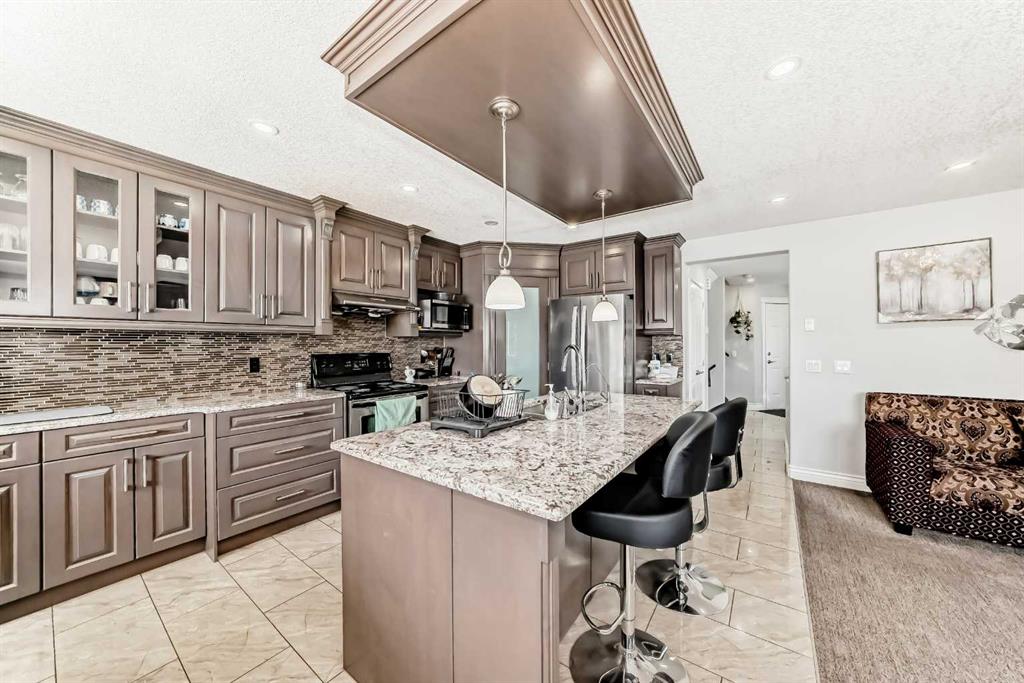Fully upgraded and well-maintained home featuring numerous recent improvements, including a stucco exterior, new asphalt shingles, new Lux windows, upgraded carpet, ceramic tile flooring, modern pot lights, custom TV unit, closet organizers, and top-of-the-line stainless steel appliances. The beautiful kitchen offers full-height maple cabinetry, a large island, ample counter space, and premium granite countertops.