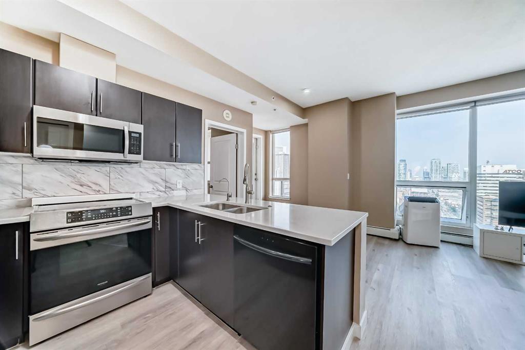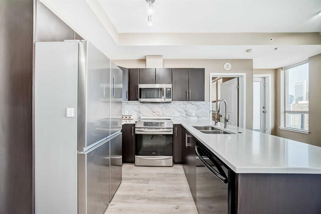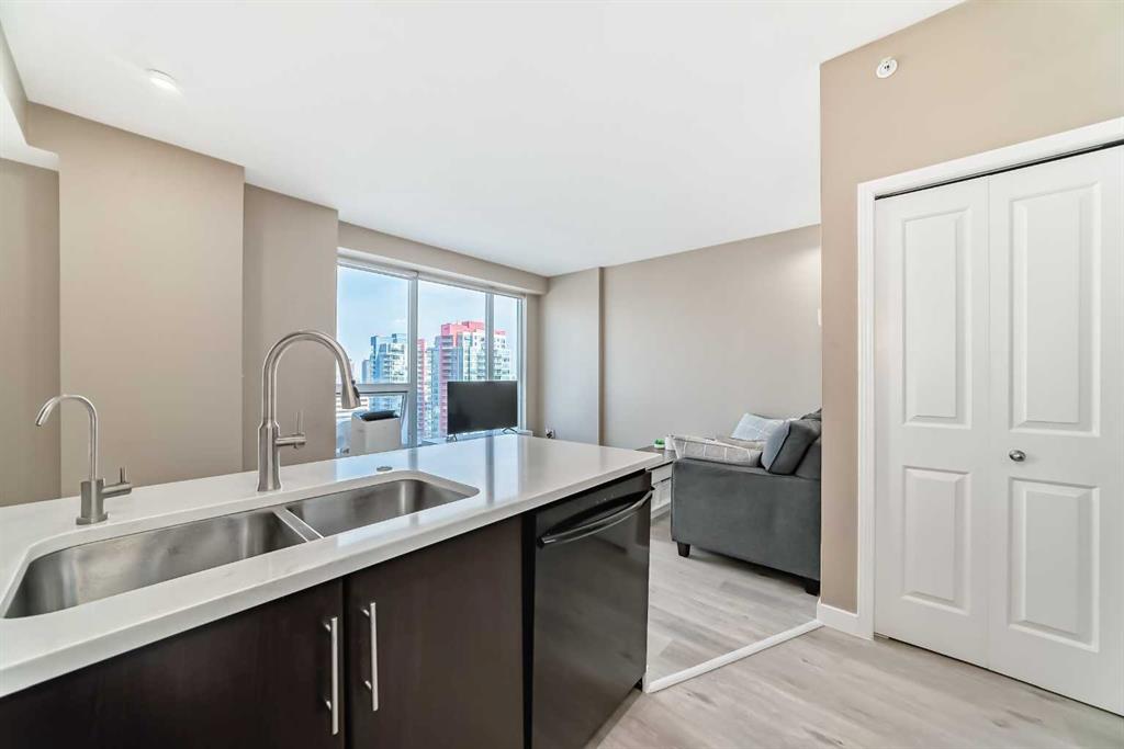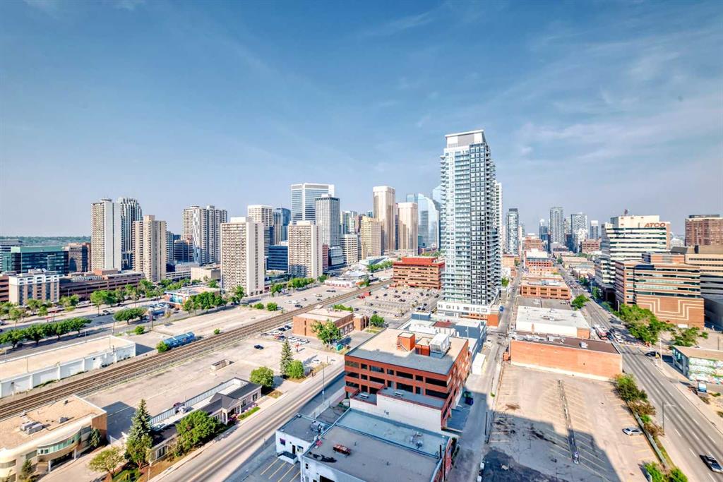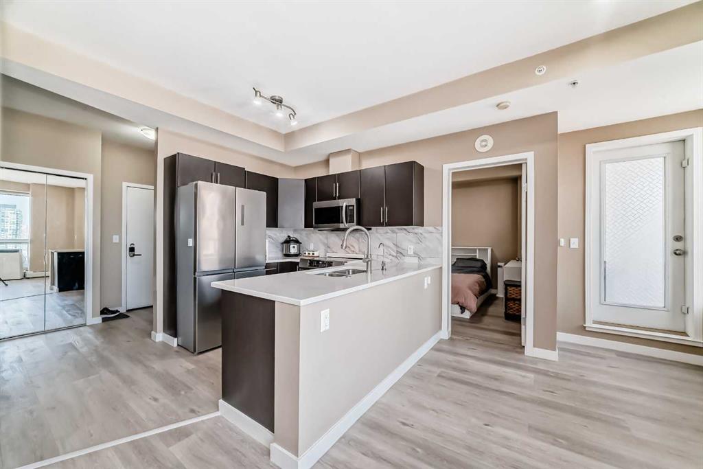 This 1-Bedroom plus office/den space Condo in the Heart of Calgary’s Beltline. Welcome to this beautifully appointed 1-bedroom and den condo, ideally located on the 18th floor, with views, in the vibrant Beltline community of Calgary. I’ve seen more condos than I can remember, but this is one of my favourite floor plans. The kitchen has everything you need and the space to make a full dinner: SS appliances, including an oversized double-door refrigerator, Quartz counters, and ample counter space. Newer luxury vinyl plank flooring throughout, and large windows allow the natural light to cascade in and offers you a beautiful view of the Calgary city skyline. There’s a space for an office, and you can relax on your private balcony and enjoy morning coffees or dinners with the view. Just steps away on the back side of the building is a Major grocery store, a Co-op, Asian and organic grocery options. Conveniently located to famous 17th Ave in Calgary, which offers the best dining options for the Calgary Food Scene. Don’t forget to take advantage of the free downtown light rail system, which is conveniently located mere blocks away from the apartment. Located steps away from the Bow River, you’ll enjoy easy access to scenic strolls, cycling, walking, and nearby parks such as the famous Princess Island Park. This condo comes with one titled underground parking stall #260; your vehicle is protected year-round. The building also offers secure access, providing residents with peace of mind. The gym is on the second floor. Condo fees include heat, water, and electricity. The building has security cameras and 4 main elevators for ease of access. THIS CONDO HAS EVERYTHING YOU NEED TO MAKE IT AN IDEAL 1ST HOME OR FOR AN INVESTMENT. Pets allowed with approval.