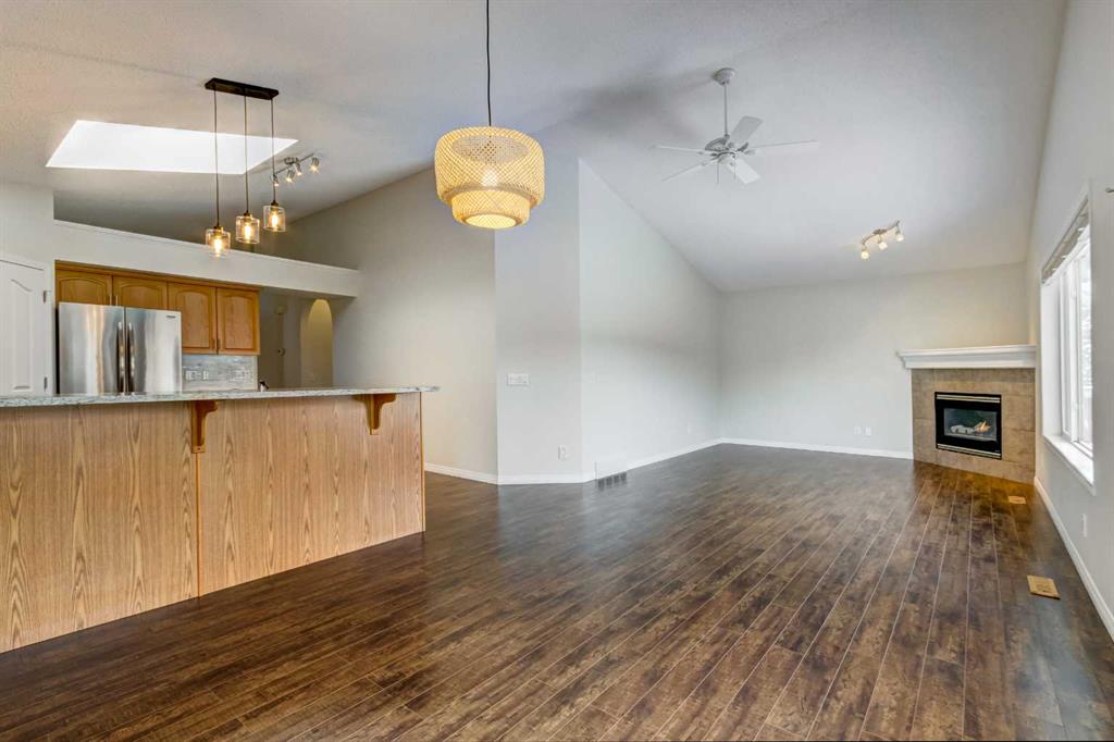 The kitchen is designed with both everyday living and entertaining in mind. Abundant counter space, generous cabinetry, and a convenient corner pantry provide excellent storage and functionality. Granite countertops, a gas stove, and a vaulted ceiling with an overhead skylight create a light-filled, welcoming space where family and friends will naturally gather. The open-concept layout flows seamlessly into the dining area and main living room, making hosting effortless.