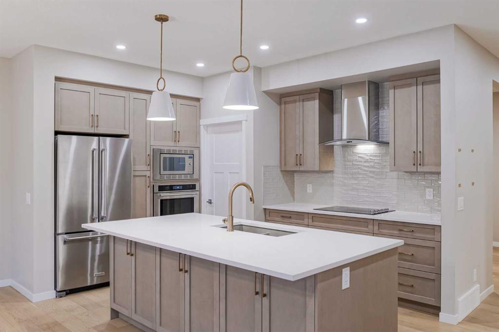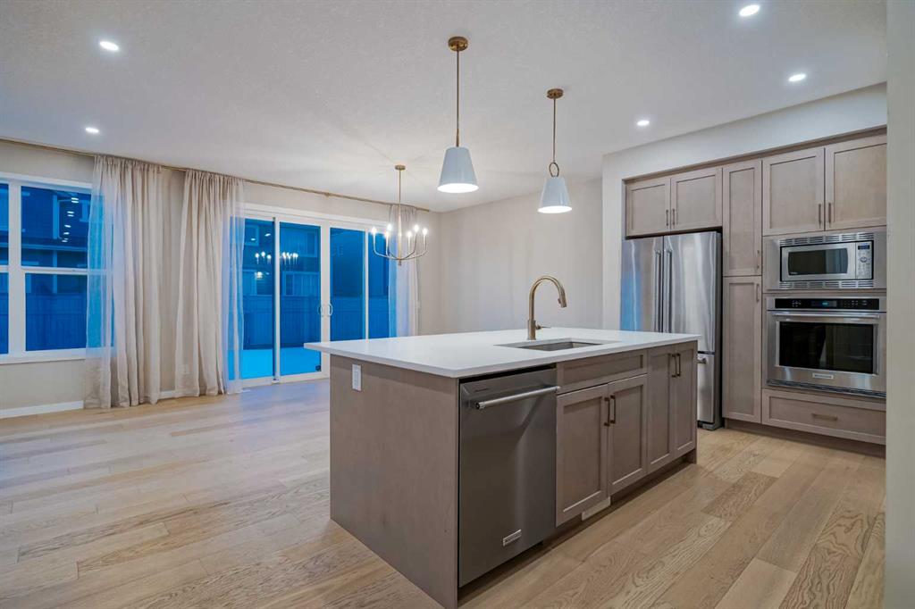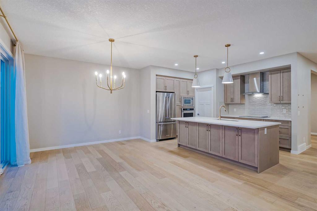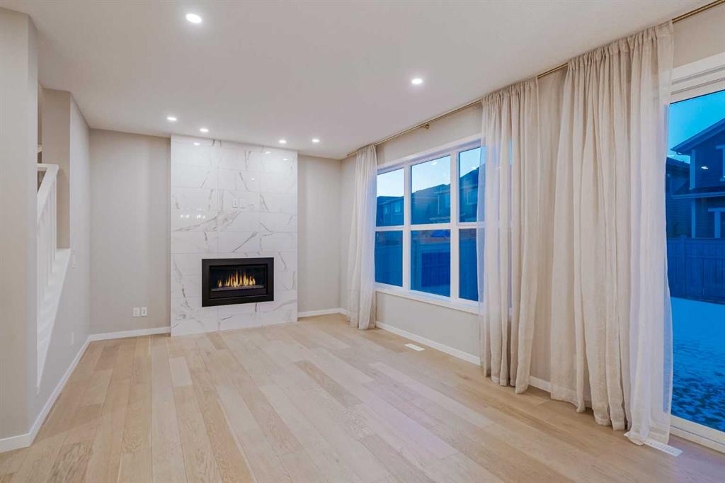 Welcome to 184 Magnolia Terrace, a former showhome where luxury, comfort, and thoughtful design come together in the most breathtaking way. This 6 bedroom masterpiece is not just a house, it is an experience. From the moment you step inside, you are greeted by rich European Oak hardwood floors stretching across the main level, beautifully contrasted by champagne gold hardware, designer lighting, and warm putty cabinetry that creates an elevated yet inviting ambiance. Every detail was carefully curated as a showhome, showcasing premium upgrades, refined finishes, and exceptional craftsmanship throughout. A versatile front flex room offers endless possibilities, whether you envision quiet mornings with coffee and a book, a stylish home office, or the perfect playroom. The heart of the home was designed to impress with an alternate kitchen layout featuring upgraded appliances, a built in oven and microwave, countertop stove, quartz counters, and a statement chimney hoodfan wrapped in timeless subway tile. The entire back wall is nearly all glass, flooding the space with natural light and creating a seamless connection to the outdoors. The dining area easily accommodates large gatherings, while sliding French patio doors extend your entertaining space outside on warm summer evenings. The living room is anchored by a dramatic floor to ceiling Carrara marble style tile fireplace, creating the perfect backdrop for cozy winter nights and elegant holiday décor. Upstairs, designer lighting and a modern wood railing lead to a stunning central bonus room with tray ceiling detail that thoughtfully separates the primary suite from the kids wing, offering both privacy and connection. The oversized primary retreat is filled with natural light and features a luxurious five piece ensuite with a freestanding tub centered between dual vanities, marble style tile, a glass shower, and elevated finishes that make every evening feel like a luxury hotel stay. The oversized walk in closet connects directly to the laundry room complete with sink, adding effortless convenience to everyday living. On the opposite side of the bonus room, three spacious bedrooms ensure no one is left out. The fully finished basement expands your living space even further with an oversized recreation room and two additional bedrooms, bringing the total to six and making this home perfect for guests, teenagers, or multi generational living. Imagine waking up here, hosting unforgettable gatherings, and watching your family grow in a home where every corner feels intentional and every day feels elevated. You will be proud to call 184 Magnolia Terrace home.