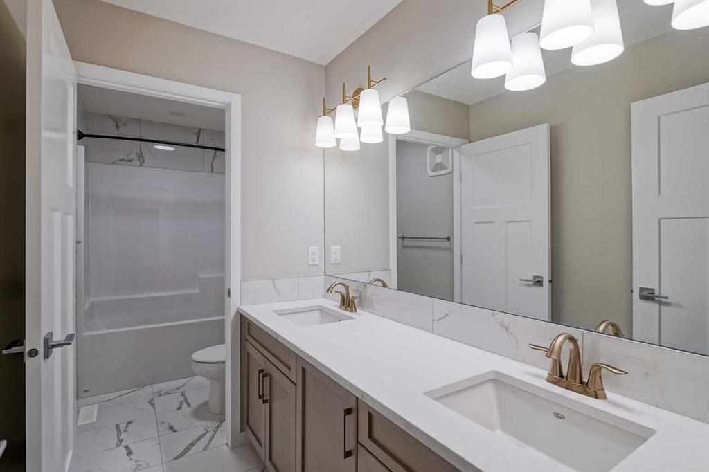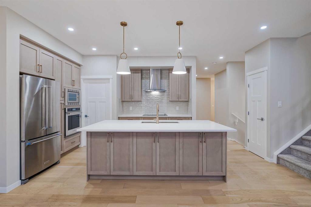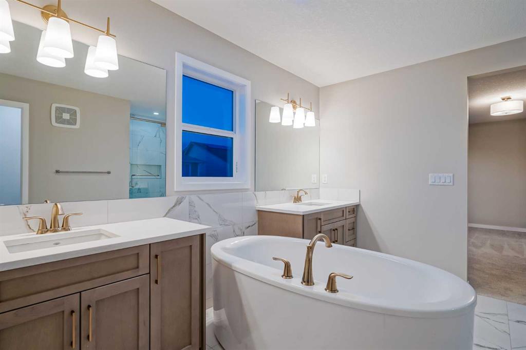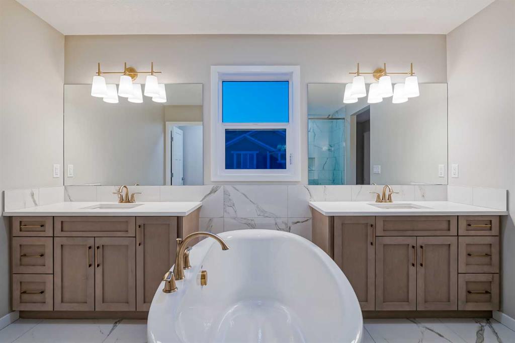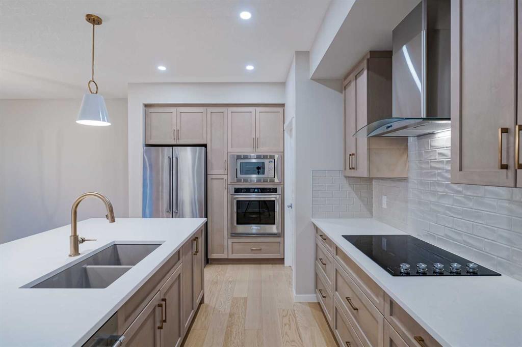 Welcome to 184 Magnolia Terrace, a former showhome where luxury, comfort, and thoughtful design come together in the most breathtaking way. This 6 bedroom masterpiece is not just a house, it is an experience. From the moment you step inside, you are greeted by rich European Oak hardwood floors stretching across the main level, beautifully contrasted by champagne gold hardware, designer lighting, and warm putty cabinetry that creates an elevated yet inviting ambiance. Every detail was carefully curated as a showhome, showcasing premium upgrades, refined finishes, and exceptional craftsmanship throughout. A versatile front flex room offers endless possibilities, whether you envision quiet mornings with coffee and a book, a stylish home office, or the perfect playroom. The heart of the home was designed to impress with an alternate kitchen layout featuring upgraded appliances, a built in oven and microwave, countertop stove, quartz counters, and a statement chimney hoodfan wrapped in timeless subway tile. The entire back wall is nearly all glass, flooding the space with natural light and creating a seamless connection to the outdoors. The dining area easily accommodates large gatherings, while sliding French patio doors extend your entertaining space outside on warm summer evenings. The living room is anchored by a dramatic floor to ceiling Carrara marble style tile fireplace, creating the perfect backdrop for cozy winter nights and elegant holiday décor. Upstairs, designer lighting and a modern wood railing lead to a stunning central bonus room with tray ceiling detail that thoughtfully separates the primary suite from the kids wing, offering both privacy and connection. The oversized primary retreat is filled with natural light and features a luxurious five piece ensuite with a freestanding tub centered between dual vanities, marble style tile, a glass shower, and elevated finishes that make every evening feel like a luxury hotel stay. The oversized walk in closet connects directly to the laundry room complete with sink, adding effortless convenience to everyday living. On the opposite side of the bonus room, three spacious bedrooms ensure no one is left out. The fully finished basement expands your living space even further with an oversized recreation room and two additional bedrooms, bringing the total to six and making this home perfect for guests, teenagers, or multi generational living. Imagine waking up here, hosting unforgettable gatherings, and watching your family grow in a home where every corner feels intentional and every day feels elevated. You will be proud to call 184 Magnolia Terrace home.