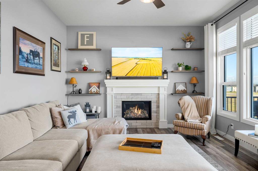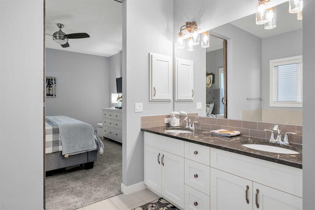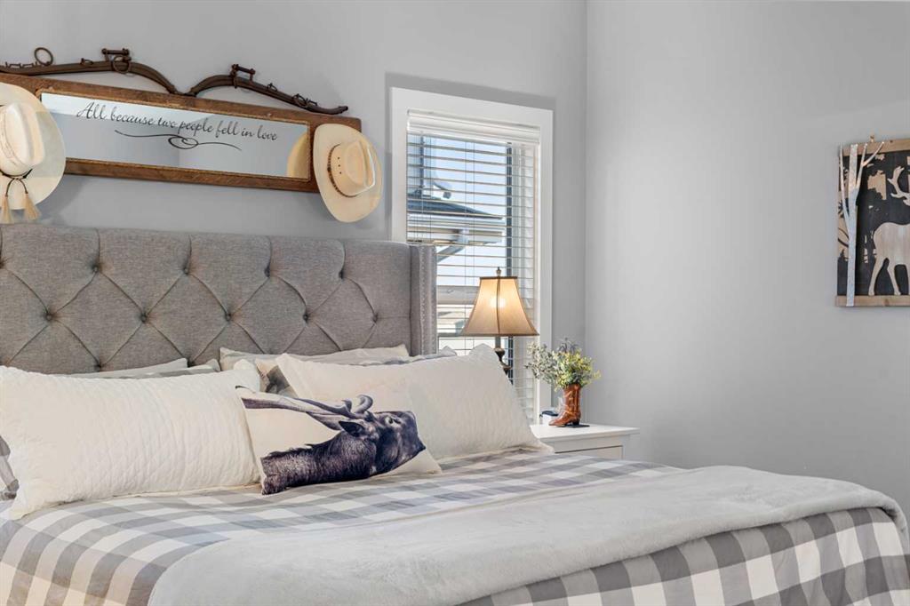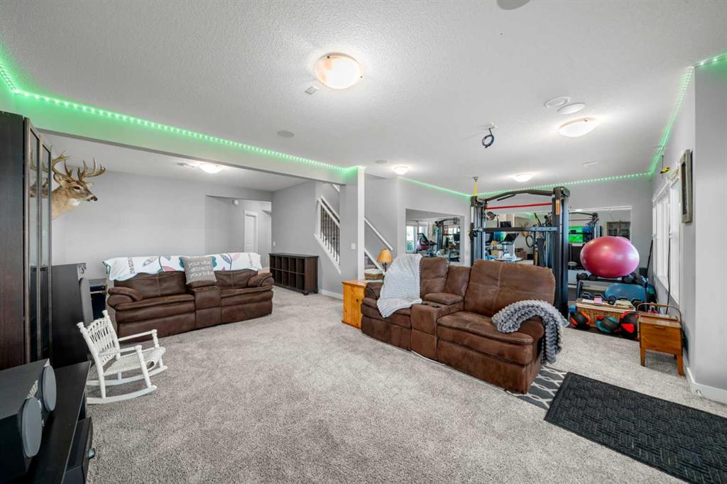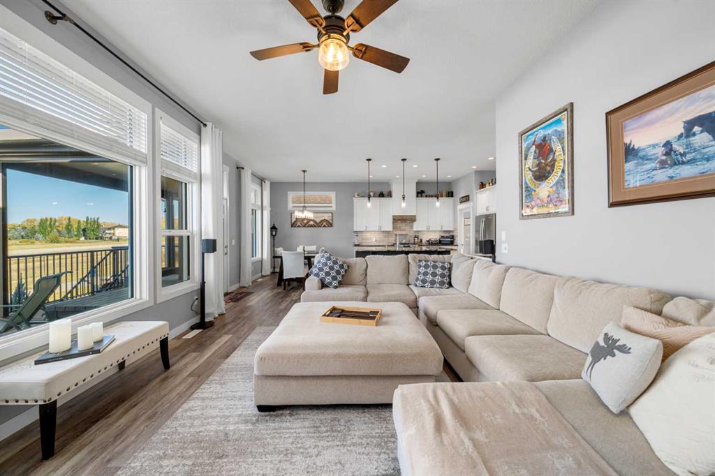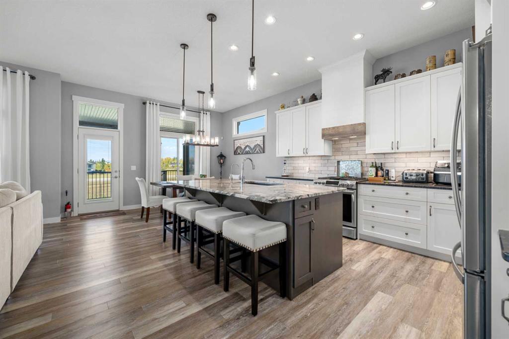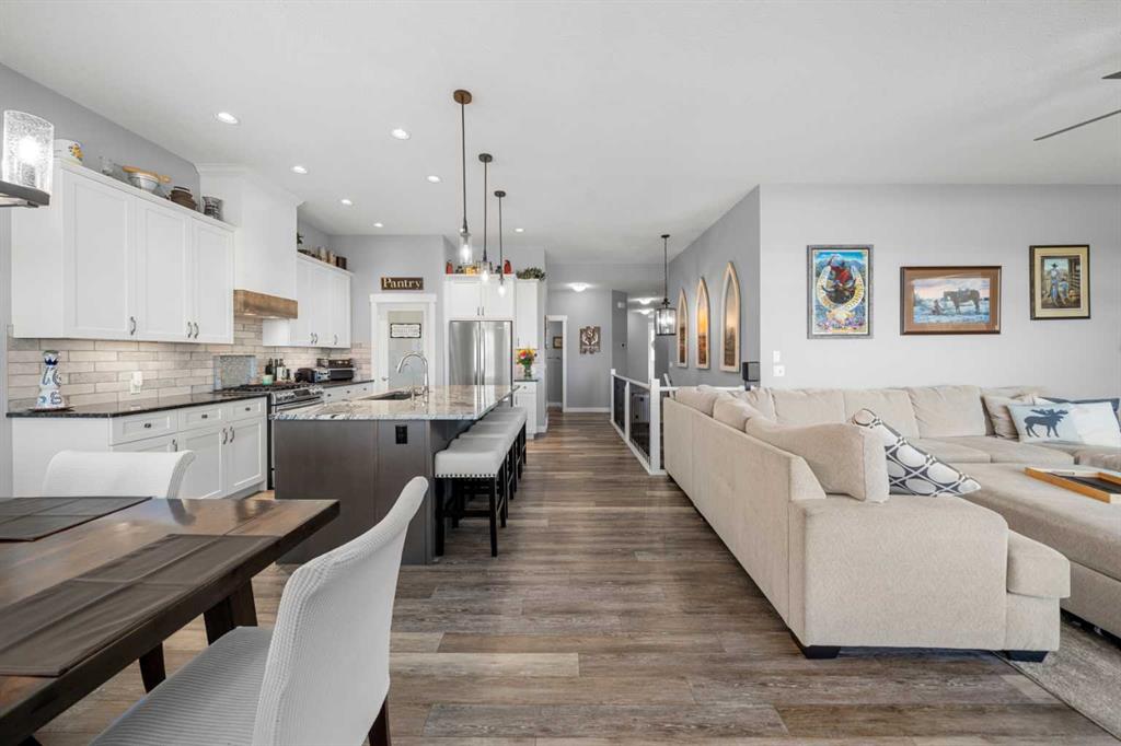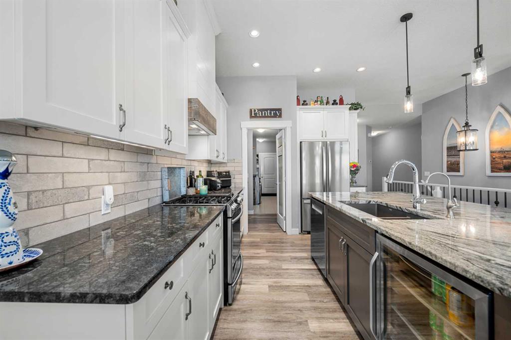 Gorgeous upgraded walkout 3 bedroom bungalow backing onto greenspace with great mountain views. This beautiful home has central air conditioning, epoxy flooring in a heated oversized garage, underground sprinklers, amazing landscaping, a full width deck with a gazebo and remote control screens, gemstone lighting and many other upgrades. As you drive up to the property you will love the low maintenance front yard and the great curb appeal on this home. Inside you will find beautiful LVP flooring, high ceilings and a fabulous layout. This home was designed to take full advantage of the west facing views, featuring huge windows throughout the back of the property, providing tons of natural light and allowing you a great view of our awesome sunsets. The spacious living room has a gas fireplace – making it a great place to relax after a long day! Entertain in the large dining room or step out side onto the massive deck and then you can choose whether to sit in the covered, screened area or be out in the open enjoying your BBQ! The kitchen is stunning and features a huge granite island with room for 4 bar stools, stainless steel appliances, including a gas stove, extended height white cabinets and a walkthrough pantry. The laundry room has a lovely barn wood counter above the washer and dryer, a sink with granite counter, drink fridge and a useful built in storage bench. The spacious master bedroom has a walk in closet and features a beautiful barn wood door leading to the 5 piece ensuite with large shower, soaker tub and dual sinks with granite counter. Completing this level is a half bathroom. In the fully finished walkout basement there is a large family/games room with built in speakers and lots of natural light from the large windows. There is a gym area with rubber flooring and mirrors – perfect for the fitness enthusiast or for a children’s play area. There are 2 large bedrooms both with great sized closets and a 3 piece bathroom with a large shower. The furnace room has lots of storage with built in shelving. Did I mention this home has a water softener, a reverse osmosis system for your drinking water and gemstone lights both front and back? The yard has beautiful landscaping and includes a large concrete pad outside of the walkout basement, a paved patio area, a gravel firepit area, underground sprinklers and beautiful flower beds and trees. The 22x24ft heated garage features high ceilings, epoxy flooring, slat walls, tire rack and a bicycle pulley system – a garage to be proud of! This home is stunning and should be viewed to be appreciated! View 3D tour/Multi Media/virtual tour.