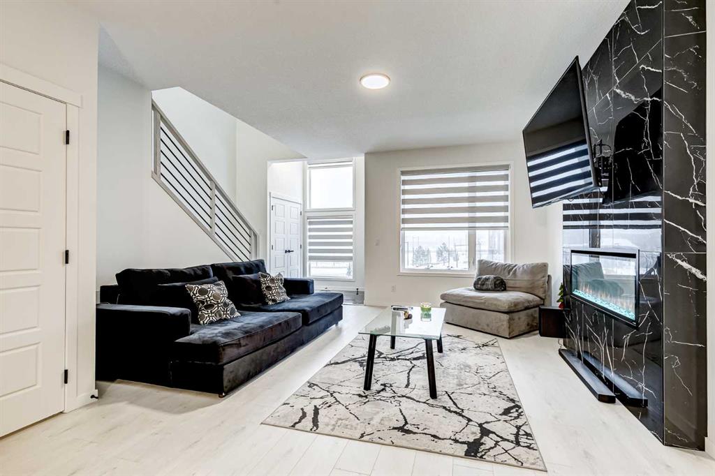 The welcoming living room showcases a sleek electric fireplace with contemporary marble looking 24″ x 48″ tile, an impressive focal point. A bright dining area flows effortlessly into a versatile flex space, ideal for an office, coffee bar, or play area. Additional main-floor highlights include a stylish half bath with a full-height tile backsplash, a functional pantry, and a rear entrance with a built-in bench and closet. The home also offers the convenience of a separate side entrance.