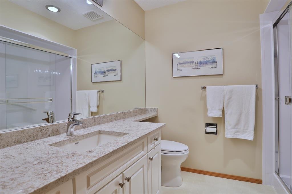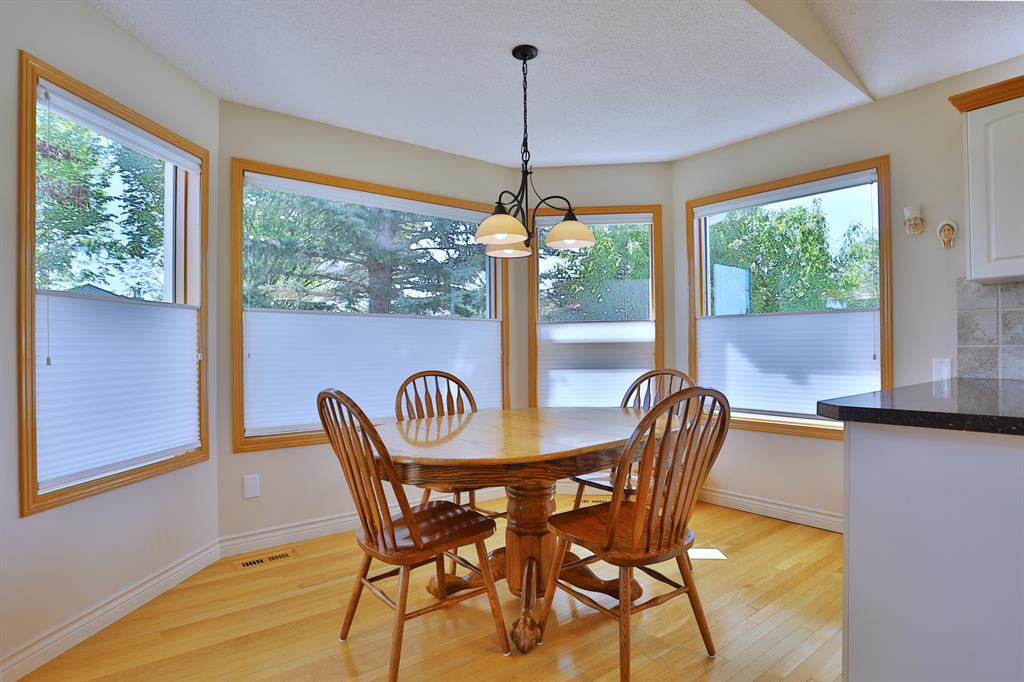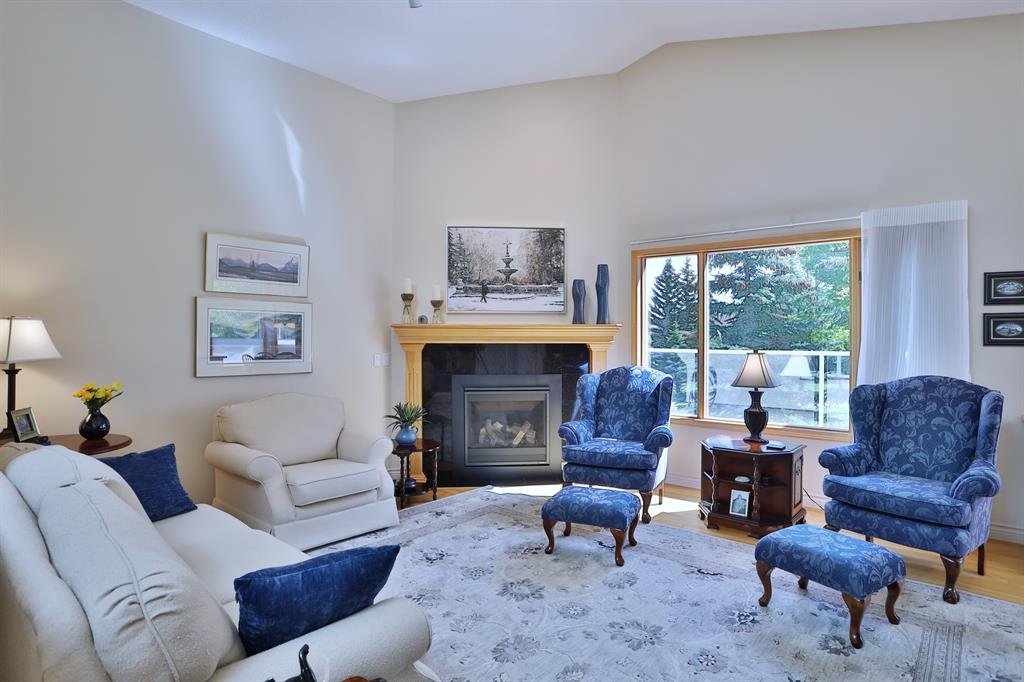 Backing onto a park in exclusive Hamptons Square is where you’ll find this beautifully maintained home in the highly-desirable golf course community of the Hamptons. Built by Calbridge on this wonderful corner lot, this mint condition walkout bungalow enjoys gleaming hardwood floors & skylights, 4 bedrooms & 3 full bathrooms, renovated white kitchen with granite countertops & fabulous walkout level with sensational enclosed patio. You will just love the warm & inviting design of the air-conditioned main floor with its expanse of vaulted ceilings & windows, featuring the West-facing living room with wraparound windows, open concept formal dining room with bay window & sun-drenched family room with new fireplace (2022). The beautiful updated kitchen has granite counters, walk-in pantry & the upgraded appliances include cooktop stove, double built-in convection ovens & Bosch dishwasher. Two bedrooms & 2 full baths on the main floor highlighted by the private owners’ retreat with large walk-in closet & jetted tub ensuite with heated floors, skylight & separate shower. The 2nd bathroom – also with heated floors, is conveniently right across from the 2nd bedroom. The walkout level is finished with 2 big bedrooms, full bath with oversized walk-in shower, huge open games/rec room with fireplace & fabulous enclosed patio with access onto a 2nd patio in the private treed backyard. Main floor laundry room complete wit sink, lots of closet space & Bosch washer & dryer. Additional features & extras include Hunter Douglas blinds, NEST thermostats & CO/smoke detectors, motion & hue lights, underground sprinklers, heat lamps in the main & walkout bathrooms, oversized 2 car garage with built-in cabinets & central vacuflo system with 3 hoses (2 for the house & 1 for the garage). Other improvements: clay tile roof (2022), renovated bathrooms with quartz counters (2015), hot water tank (2019), both furnaces (2017), water softener (2014) & window glass (2017). Prime location within walking distance to bus stops & tennis courts, only a few short minutes to shopping at Hamptons Co-op & Edgemont Superstore, plus quick easy access to Nose Hill Park, Crowfoot Centre & LRT, major retail centers, University of Calgary, hospitals & downtown.