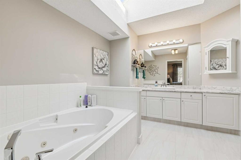 The one you’ve been waiting for – just 2 blocks from the Lake. Offering over 3000+ SF of refined living space, this one-owner home has been meticulously cared for and thoughtfully updated. The main level showcases a renovated kitchen with ceiling height cabinetry, quartz counter tops, stainless steel appliances and corner pantry. A zen living room complete with gas fireplace & large picture window with views of yard + a spacious dining area for all the family to enjoy! The front flex room ensures a private home office or elevated formal dining room. Sleek 2-piece guest bath, roomy laundry area and gorgeous engineered hardwood flooring underfoot! Upstairs delights with a huge bonus room + vaulted ceilings (engineered hardwood flooring too), a serene primary suite complete with large walk-in closet and spa-like ensuite bath. Enjoy a soaking tub, separate shower, skylight and stunning vanity with smart storage. Two more large family bedrooms (one with built-in study area) and modern family bath. The fully finished basement adds 2 more large bedrooms, family room + bathroom rough-in, ready for your finishing vision. Step outside to your beautifully treed west-facing backyard, offering privacy, glorious mature trees, underground irrigation, gas BBQ hook up – a setting that’s increasingly hard to find. Perfectly positioned near schools, walking paths and one of the BEST lake areas in Calgary, this home delivers space, updates, Central Air and lifestyle—at a price that sets it apart. So many quality improvements including: Hi-eff furnace/Hot water tank/Central Air (2021), Roof with hail resistant shingles (2021), Washer/dryer (2022), Fridge/Microwave Hood Fan (2025), Dishwasher (2021), Bathroom renovated (2021), Kitchen (2012)+ ALL Poly B removed in 2021. Your new home comes with access to the private lake offering year-round amenities: swimming, tennis, pickleball, volleyball, beach, fireworks, fishing, community events and community centre. You don’t want to miss this one!!