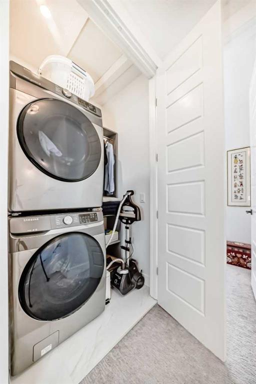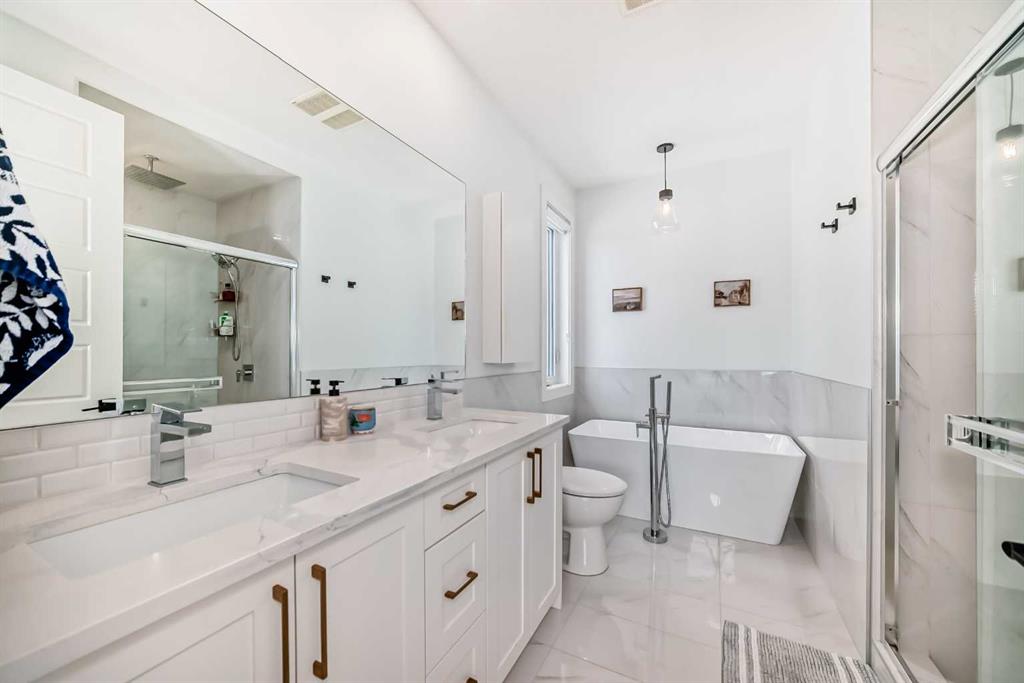 Upstairs includes two primary bedrooms. The main suite offers a huge walk-in closet and 5-piece ensuite with soaker tub and separate shower. Second bedroom also includes a walk-through closet and 4-piece ensuite. Stacking laundry in upper hallway.