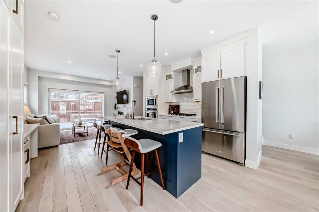 Main floor features an open concept design with hardwood flooring, large windows, and a well-appointed kitchen with quartz counters, gas range, full-height pantry, and breakfast bar. Living room with gas fireplace and direct access to the back deck with natural gas hookup.