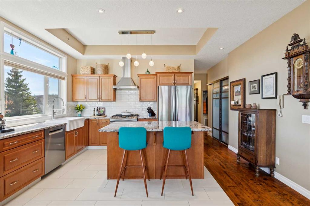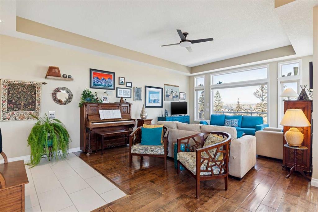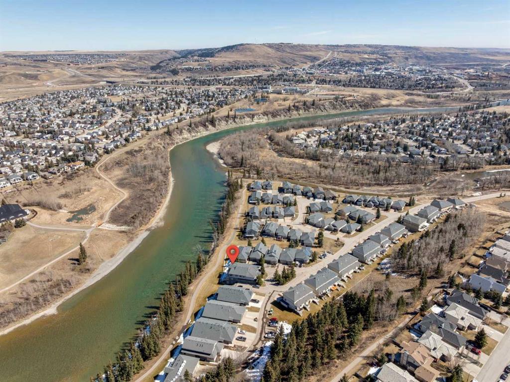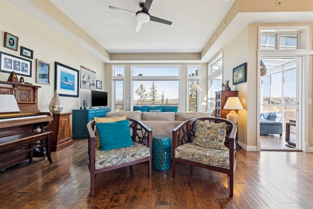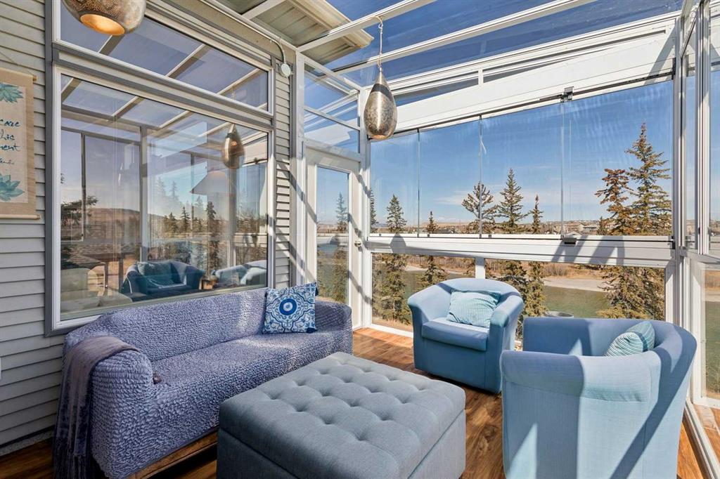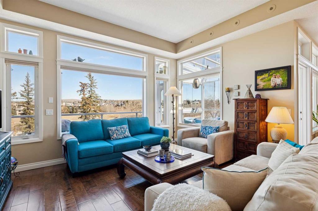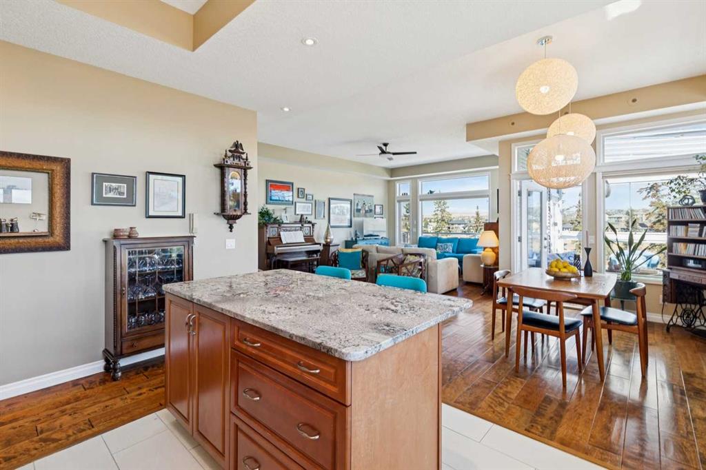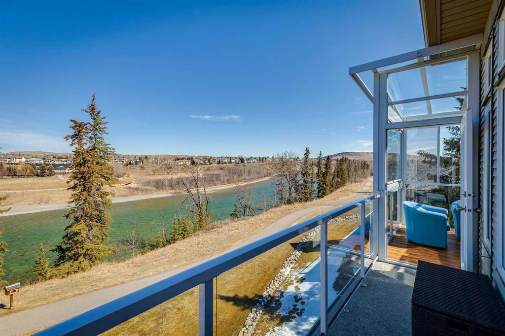 WOW! Prepare to be impressed by this stunning, ultra-stylish, recently updated TOP FLOOR condo offering breathtaking, UNOBSTRUCTED VIEWS of the Bow River, River valley and ROCKY MOUNTAINS! This exceptional home delivers a truly unique lifestyle, featuring a PRIVATE ELEVATOR with direct access to your unit and a HEATED DOUBLE GARAGE with additional storage. Nestled along the Bow River and Jumping Pound Creek, this tranquil setting is surrounded by scenic pathways, creating the perfect backdrop for relaxing, entertaining, and enjoying the outdoors year-round. Inside, the home is flooded with natural light, showcasing soaring 10-foot ceilings and beautiful engineered flooring throughout. The open-concept main living area is both elegant and functional, highlighted by a modern kitchen complete with a gas stove, stainless steel appliances, and granite countertops—ideal for hosting or everyday living.
