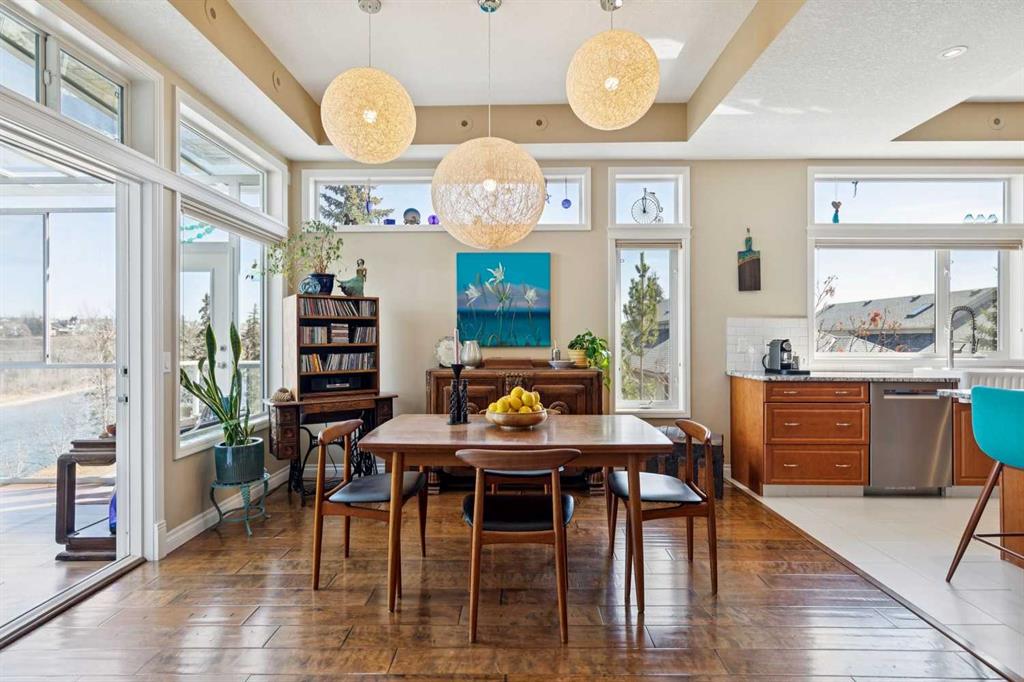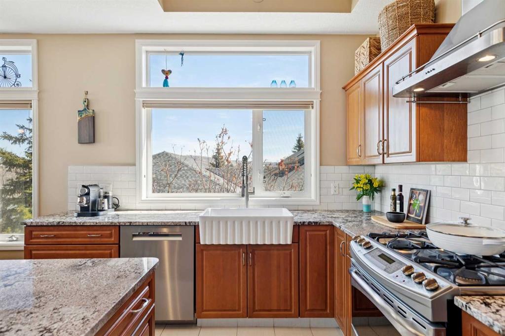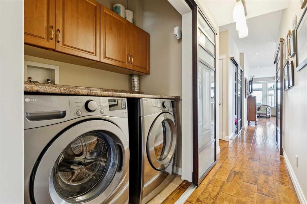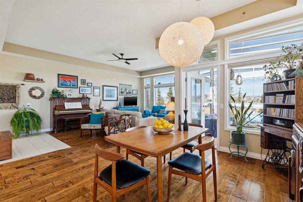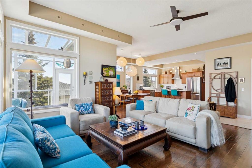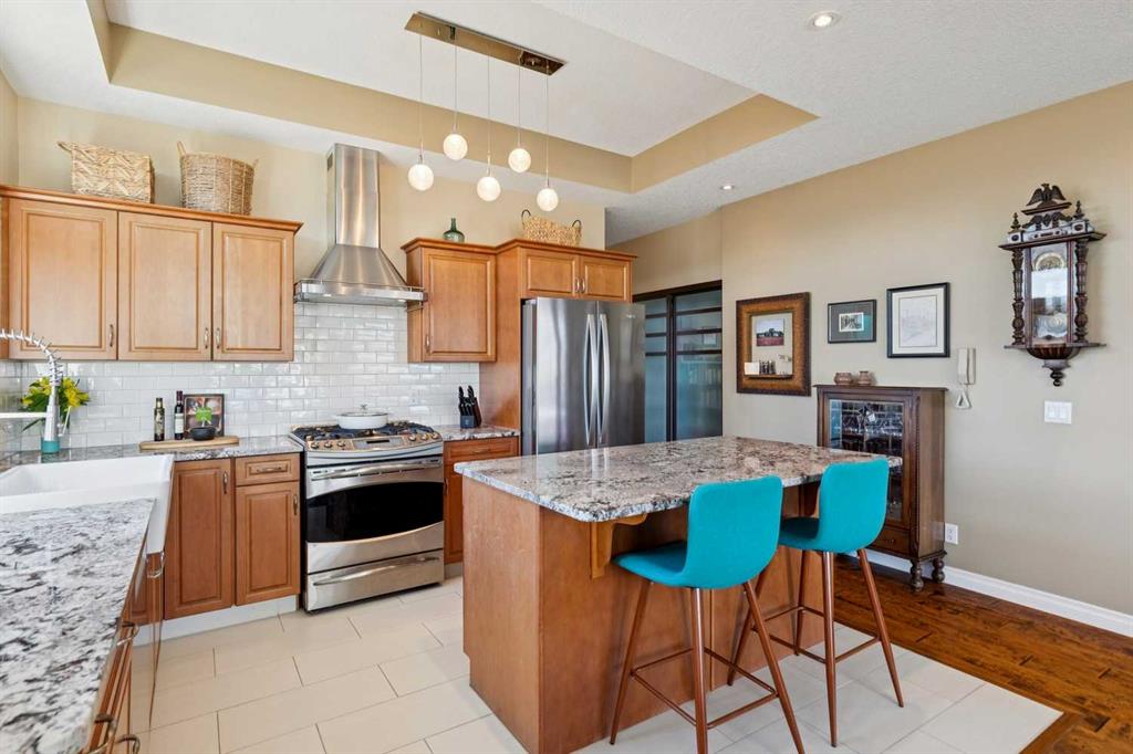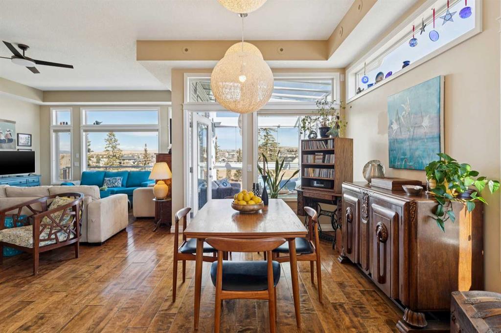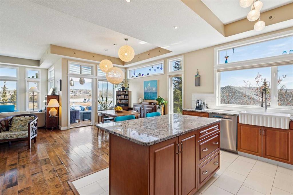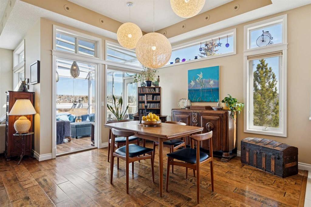 WOW! Prepare to be impressed by this stunning, ultra-stylish, recently updated TOP FLOOR condo offering breathtaking, UNOBSTRUCTED VIEWS of the Bow River, River valley and ROCKY MOUNTAINS! This exceptional home delivers a truly unique lifestyle, featuring a PRIVATE ELEVATOR with direct access to your unit and a HEATED DOUBLE GARAGE with additional storage. Nestled along the Bow River and Jumping Pound Creek, this tranquil setting is surrounded by scenic pathways, creating the perfect backdrop for relaxing, entertaining, and enjoying the outdoors year-round. Inside, the home is flooded with natural light, showcasing soaring 10-foot ceilings and beautiful engineered flooring throughout. The open-concept main living area is both elegant and functional, highlighted by a modern kitchen complete with a gas stove, stainless steel appliances, and granite countertops—ideal for hosting or everyday living.