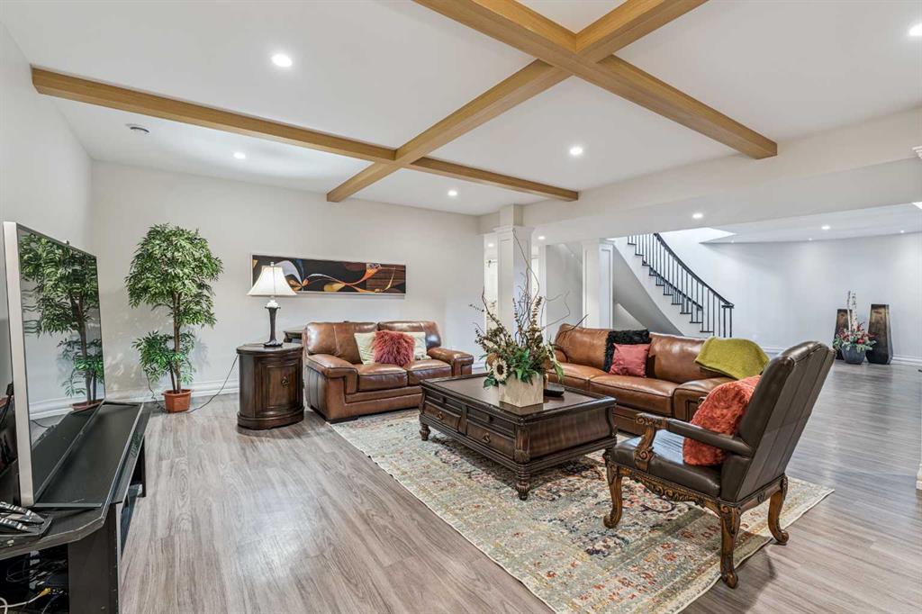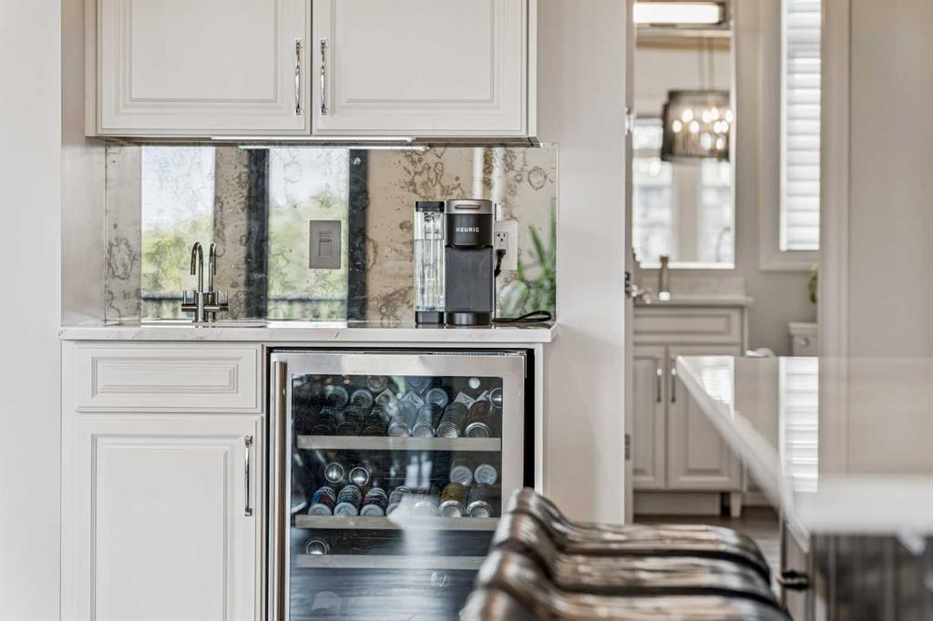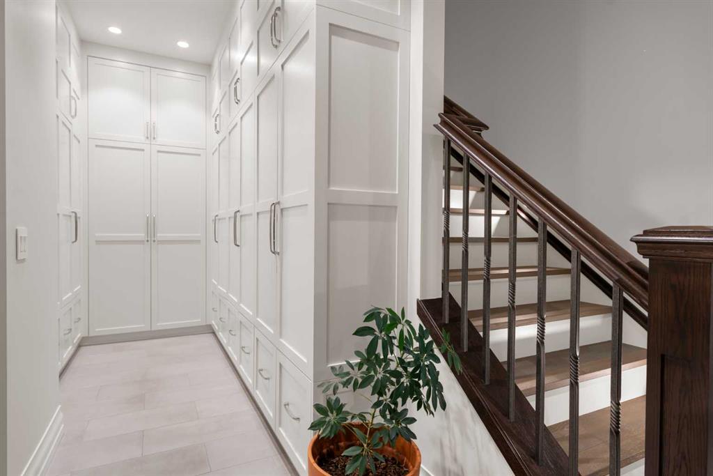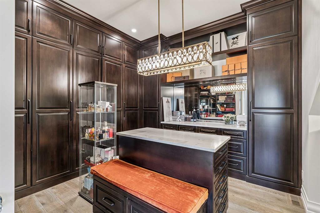 At the heart of the home is a chef-inspired gourmet kitchen featuring custom ceiling-height cabinetry, a large quartz island, and premium appliances including a Miele panelled fridge/freezer, as well as additional Wolf and Bosch appliances. A fully equipped spice kitchen with walk-in pantry provides added convenience for entertaining and everyday cooking. Luxury and comfort continue throughout the home with thoughtful features such as solar-powered blinds, central air conditioning, heated basement floors, ceramic-tiled bathrooms and laundry rooms, and a central vacuum system.