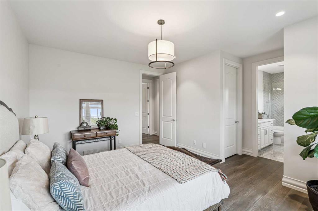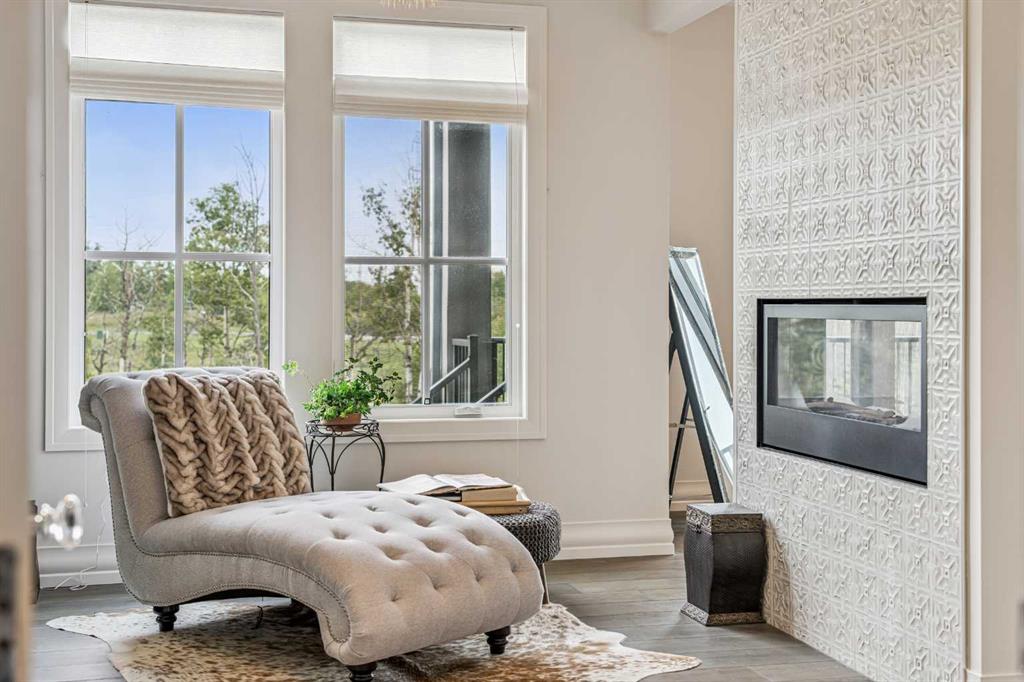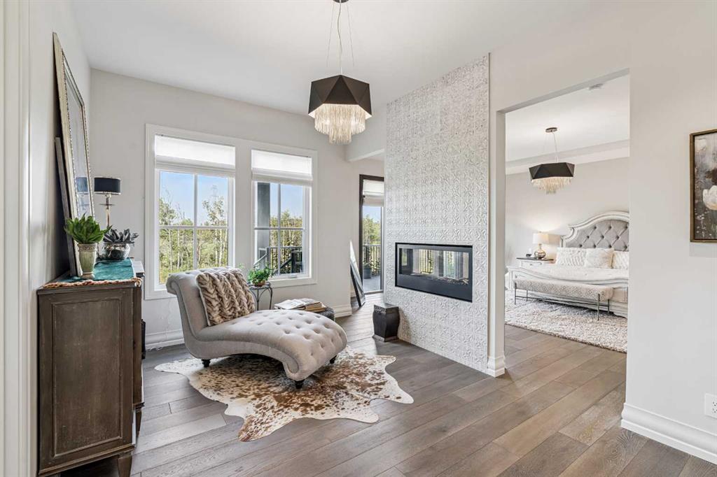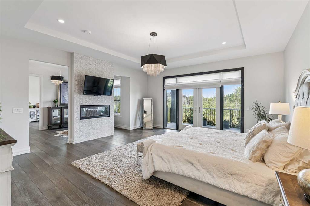 The stunning primary retreat offers the ultimate in privacy and relaxation, complete with a gas fireplace, private office, direct deck access, and a spa-inspired ensuite featuring a soaking tub, dual vanities, heated floors, and a spacious walk-in closet with custom built-ins and makeup vanity.