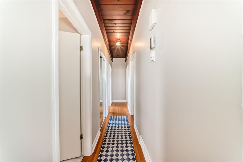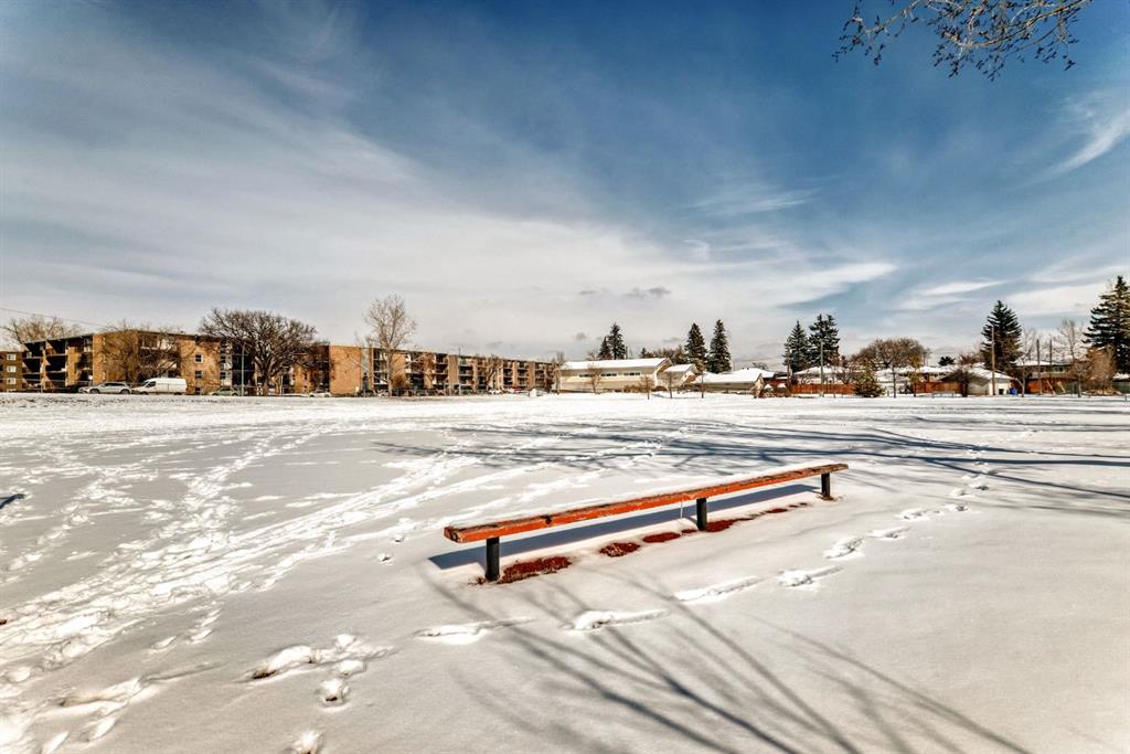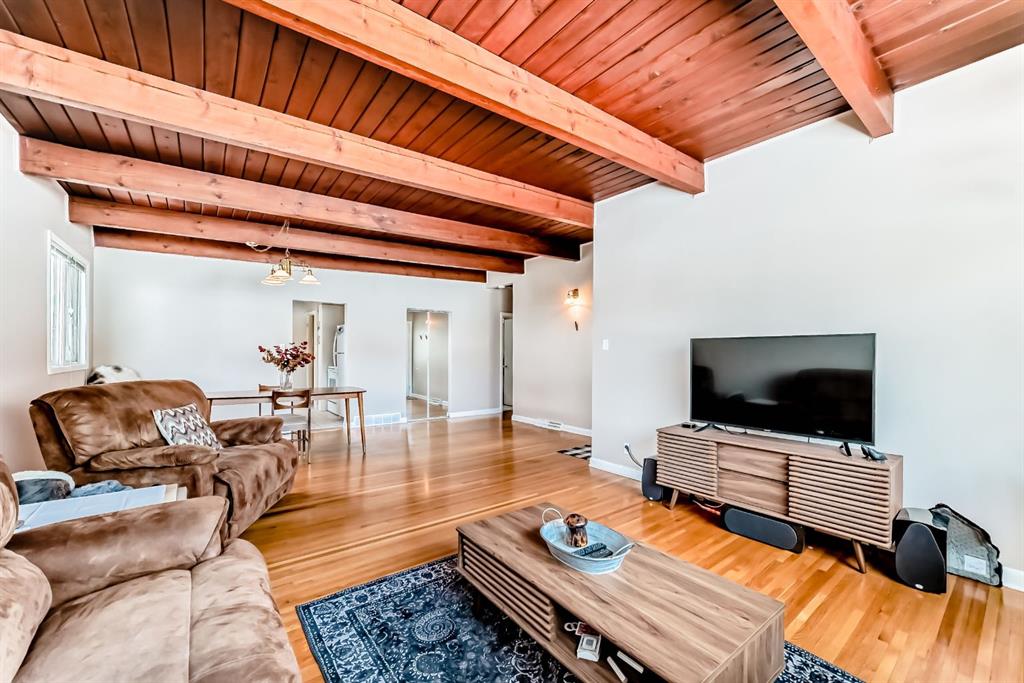 Welcome to this exceptional mid-century modern style bungalow, perfectly positioned across from a park and green space and zoned R-CG.. Showcasing timeless design, this home features stunning cedar plank ceilings with exposed beams and original hardwood flooring throughout the main level, creating warmth and architectural interest rarely found. Offering 4 bedrooms, a den, and 3 full bathrooms, the layout is both spacious and functional. The bright living and dining areas flow seamlessly, while the character-filled kitchen offers great potential and includes a charming eating nook. The primary bedroom is generously sized with large windows and a private 3-piece ensuite, complemented by two additional bedrooms and a full bathroom on the main floor—all bedrooms are bright, sun-filled spaces with oversized windows. The fully developed lower level features a separate entrance, a large family and recreation space, an additional bedroom, and a second room currently used as a bedroom (window does not meet egress requirements), plus a full bathroom and extensive storage. The large fenced yard, front patio for outdoor entertaining, and double detached garage complete this unique property. A rare opportunity to own a home with this much character and potential in an unbeatable location