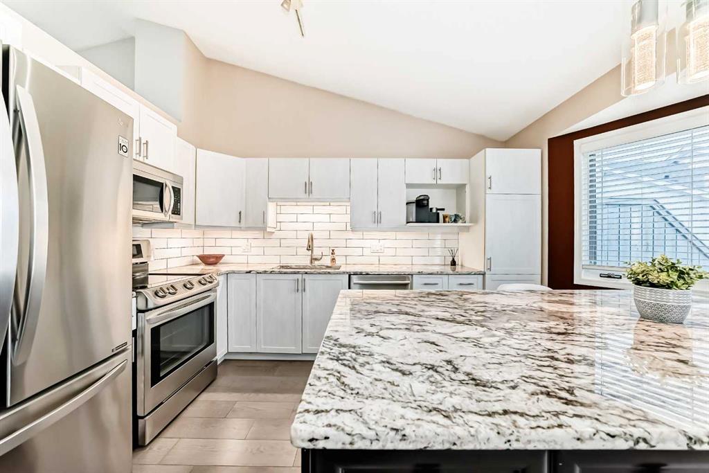 It’s time to BREAK IT TO THE KIDS (and grandkids)–YOU’RE ‘DOWNSIZING!’, BUT… NOT… to some BORING SENIOR HOME (MILES AWAY) with SING-A-LONGS, Parcheesi and Bridge mixture…NO!– YOU’RE TOO YOUNG FOR THAT!– You’re moving to ‘THE CLASSICS OF LAKE SUNDANCE,’ just down the street, where you can keep your INDEPENDENCE AND YOUR LAKE PRIVILEGES! This BRIGHT UPDATED, 3 Bdrm (2+1), 2 full bath, 1535 ft2 bare land condo has a SUPERIOR, INNER COURTYARD LOCATION–backing SUNNY SOUTH with a 29′ (2 tiered) deck!– Buyers will love the RENOVATED, WHITE ISLAND KITCHEN with ‘Black Forest’ granite countertops, newer stainless appliances (flat stove), European Bar Pulls, ingenious buffet counter, undermount & pendant lighting and extended seating for 4 (perfect for HAPPY HOUR). Vaulted ceilings, soft designer colors and wide plank flooring throughout the main floor. Open Dining/Living Room combinations with Electric Blinds. Spacious primary bedroom has access to private, upper tier sun deck. SPA INSPIRED 3pc has glass shower stall, RAIN shower head w/detachable wand, pebble tile, seating bench & granite countertops. Fully finished basement with vinyl flooring, a cozy gas fireplace, additional living space, and flexibility for guests/home office/media room. 4 pc bath down with SxS laundry area. Put the new E-BIKES (for Fish creek Park) and golf clubs (for Blue Devil) in the OVERSIZED ATTACHED GARAGE with work bench. This home has AIR CONDITIONING! Mature, stable condo board with healthy reserve fund — Come to LAKE Sundance (AFTER PICKLEBALL) this weekend and visit our Open Houses, April 18th+19th, 2-4PM.