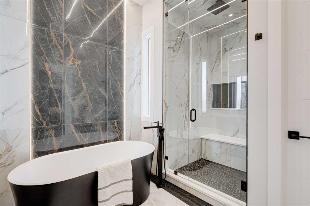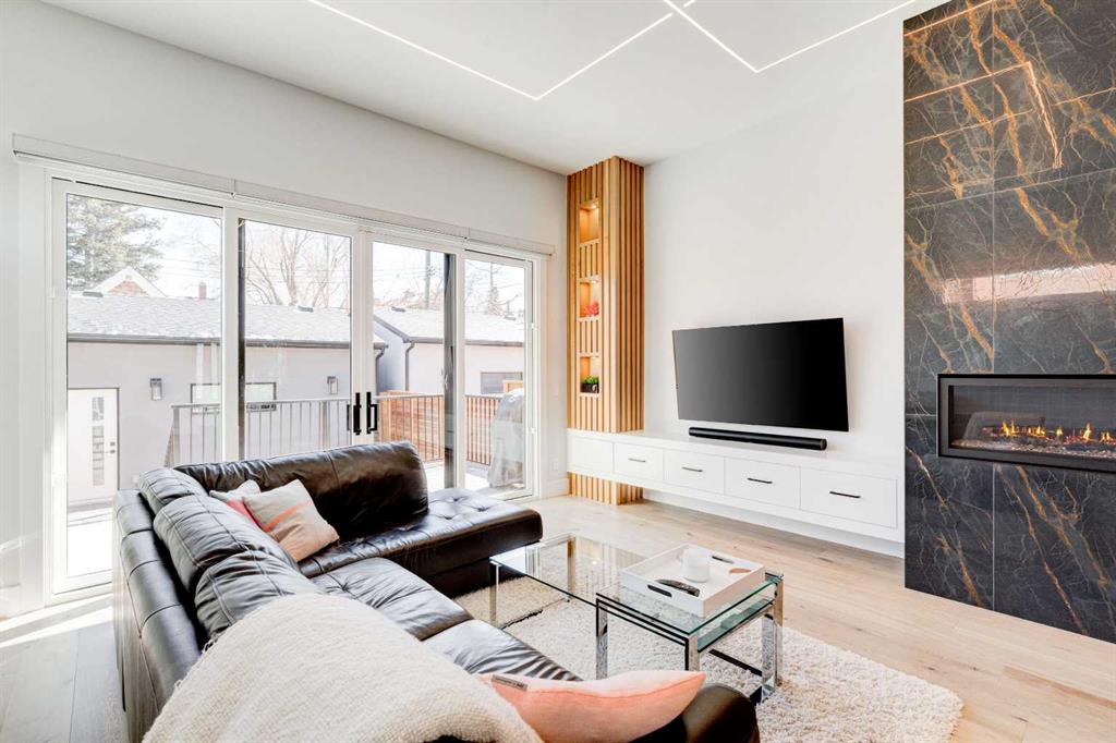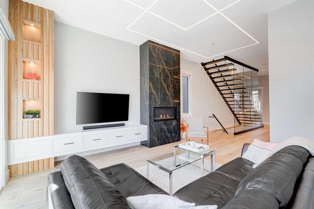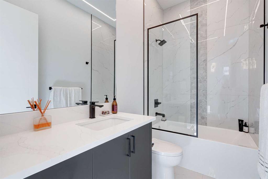 Step into refined luxury in this stunning modern home, perfectly situated in UPPER MOUNT ROYAL! Designed for effortless living, this 4-bed, 3.5-bath masterpiece offers endless impeccably crafted living space w/ high-end finishes and upgrades throughout! The striking brick exterior, lush artificial turf, and integrated lighting create an unforgettable first impression. Inside, the foyer welcomes you w/ soaring ceilings, wide-plank hardwood floors, and a stylish built-in bench w/ wood slat wall. A bright, open dining space w/ designer lighting and modern wood accented wall flows seamlessly into the high-end kitchen, a true showstopper w/ a massive waterfall quartz island, full-height flat panel cabinetry, and premium appliances. The sleek black and wood-accented cabinetry is complemented by under-cabinet lighting and island pendants that add a warm, inviting glow. The living room is anchored by a statement fireplace w/ floor-to-ceiling black marble w/ gold veining, creating a sophisticated yet cozy retreat. A wall of sliding glass doors extends the living space onto the deck, where extra-wide steps lead to the beautifully landscaped backyard featuring PRIVACY SCREENS, landscape lighting, and underground sprinklers for easy maintenance. An elegant powder room w/ a black vessel sink and a side mudroom w/ built-in storage round off the main level. A custom glass-enclosed staircase w/ open riser stairs and LED accent lights leads to the second floor, where the primary retreat is a true sanctuary. The spacious bedroom features modern ceiling lighting, arched windows, a sliding barn door, and a spa-inspired ensuite. The ensuite is a masterpiece w/ black and gold-veined marble, a freestanding tub, a glass-enclosed STEAM SHOWER w/ a rainfall head, and HEATED FLOORS for ultimate comfort. Two additional bedrooms, a sleek 4-piece bath w/ upgraded shower glass and heated floors, and a well-appointed laundry room w/ extra storage, a sink, and geometric tile flooring complete this level. The fully finished basement is the ultimate entertaining space, featuring a spacious media room w/ a built-in entertainment unit, a stylish wet bar w/ a full-height backsplash and wine storage, and an exercise area w/ rubber flooring and a mirrored wall. A fourth bedroom and another full bathroom w/ upgraded shower glass complete this level. This home is fully equipped w/ SMART HOME TECHNOLOGY, allowing you to control heating, cooling, lighting, security, and even the fireplace – all from your phone! The built-in sound system ensures seamless audio throughout, while Hunter Douglas AUTOMATED BLINDS add a touch of convenience. Additional features include A/C, security cameras, and an insulated DOUBLE GARAGE roughed-in for a gas heater. Located just steps from 17th Ave, this home offers unbeatable access to top restaurants, cafés, shopping, parks, and some of Calgary’s best schools. Enjoy the perfect blend of urban convenience and upscale living in one of the city’s most sought-after neighbourhoods!