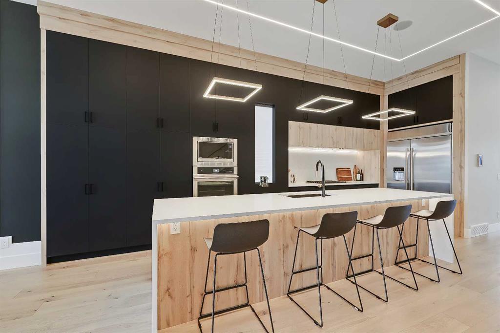 The open-concept main floor is built for connection. Host in the bright dining area and gather around the oversized waterfall quartz island. The kitchen showcases full-height flat-panel cabinetry, premium appliances, under-cabinet lighting, and statement pendants. Black and natural wood finishes feel contemporary yet enduring.