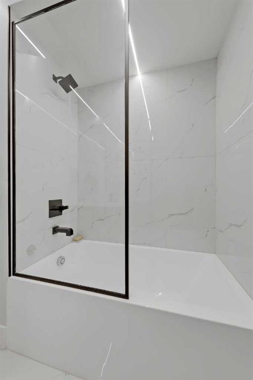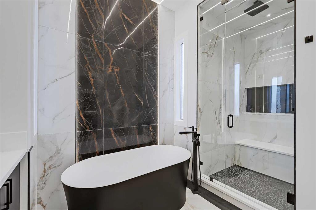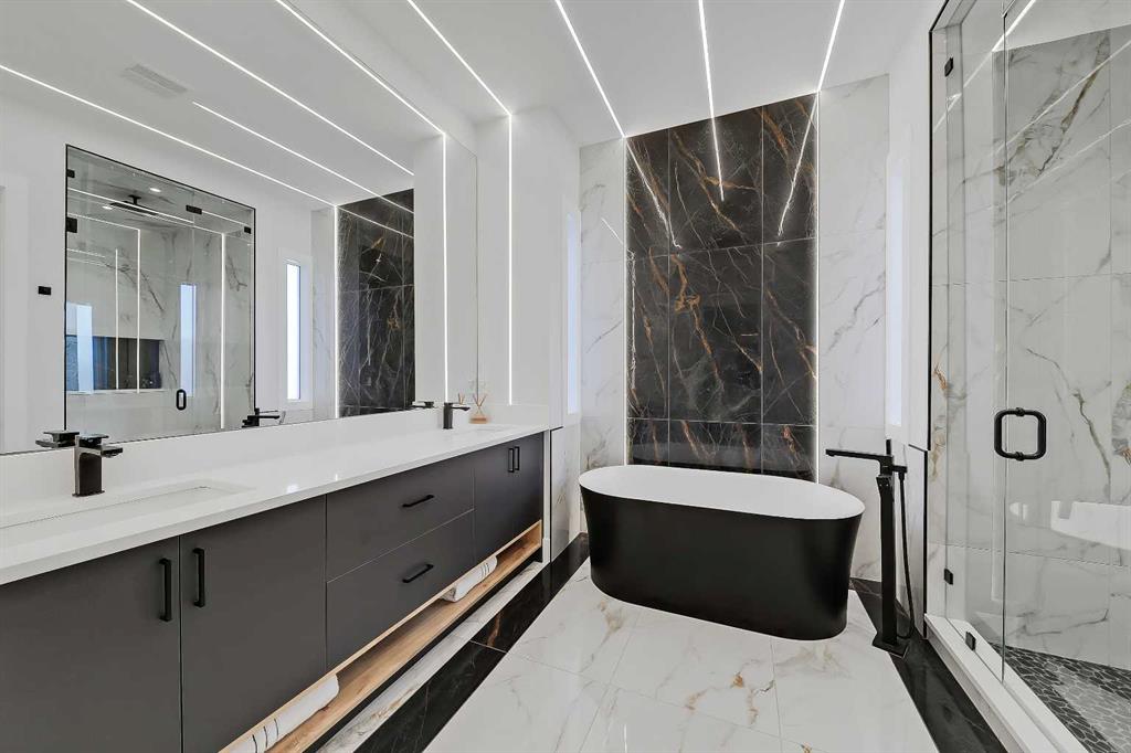 Upstairs, a glass-enclosed staircase with open risers and LED lighting leads to a stunning primary suite. Arched windows flood the space with natural light, while the spa-inspired ensuite features heated floors, a freestanding tub, a STEAM SHOWER with rainfall head, and striking marble finishes that feel straight out of a boutique hotel.