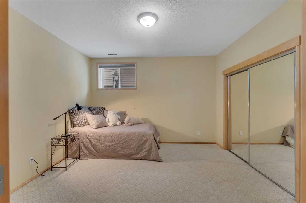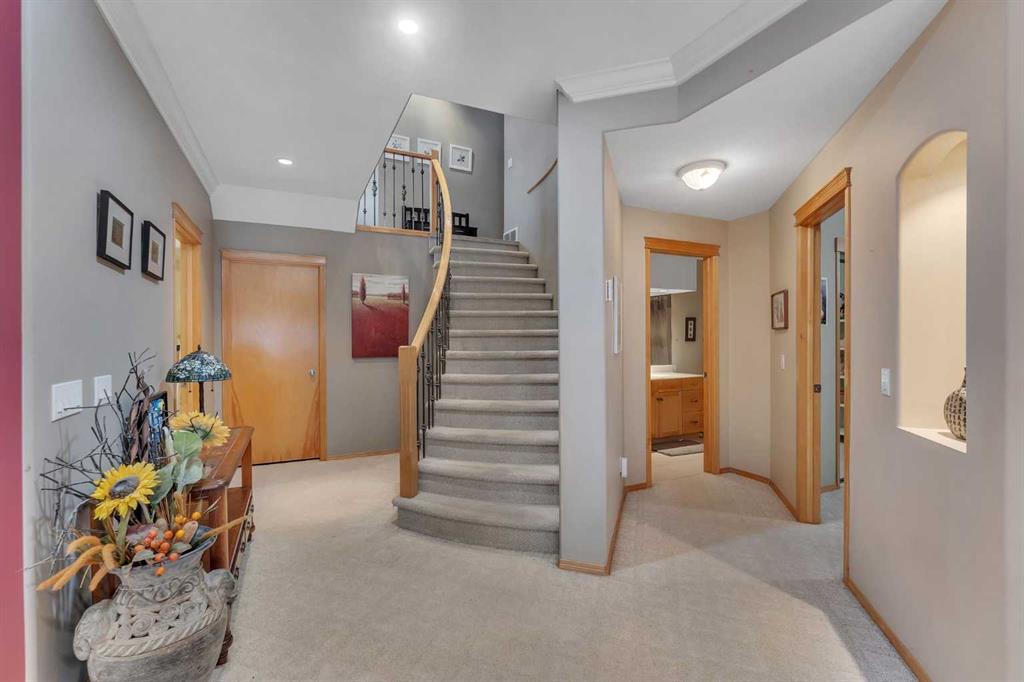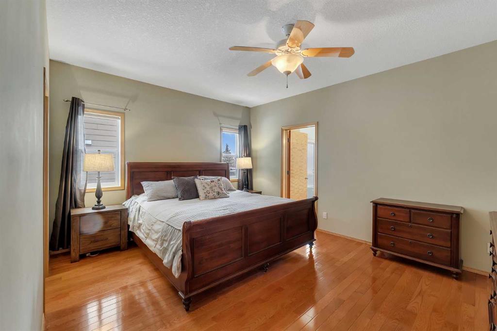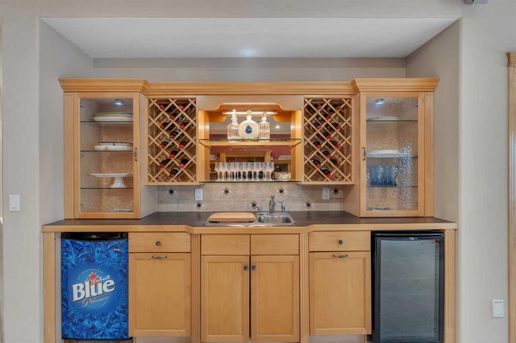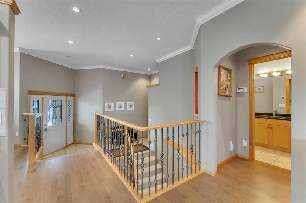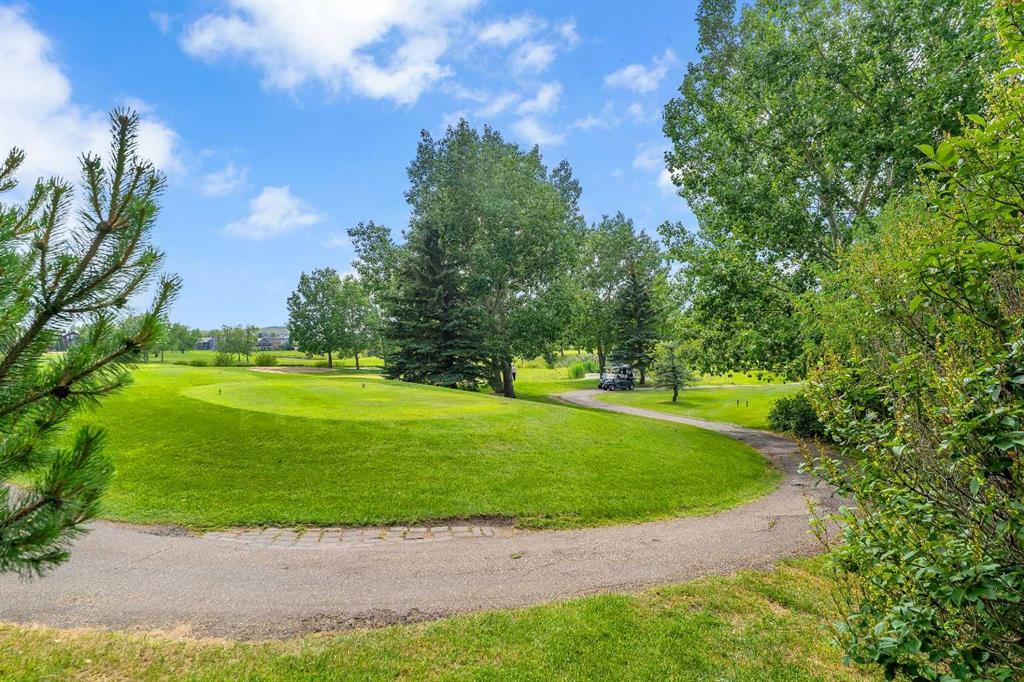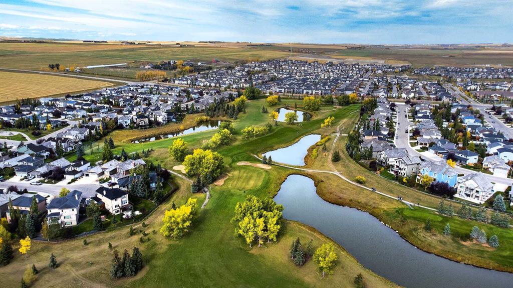 The walkout basement is fully finished with IN-FLOOR HEAT. A large family room is where the family will gather in front of the fireplace with built-ins. Another great feature of this lower level is the 9-foot ceiling height and the custom bar. THREE additional bedrooms & a 4-piece bath make this an ideal home for teenagers or grandkids. The backyard is exceptionally landscaped with mature trees, perennials, and irrigation. The lower patio is very private and is a great place to listen to the birds while enjoying a good book. Watch the golfers and enjoy the sunshine from your walkout deck or from your patio. This golf course location is well-protected from errant golf balls. This is a central Airdrie location, close to the golf course, shopping, and many schools.