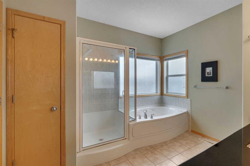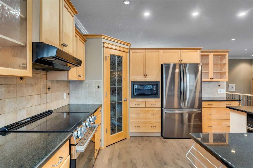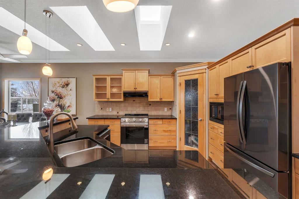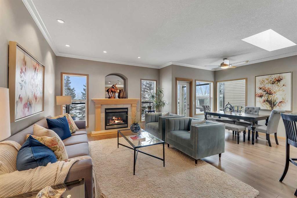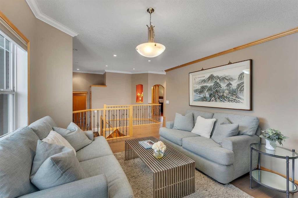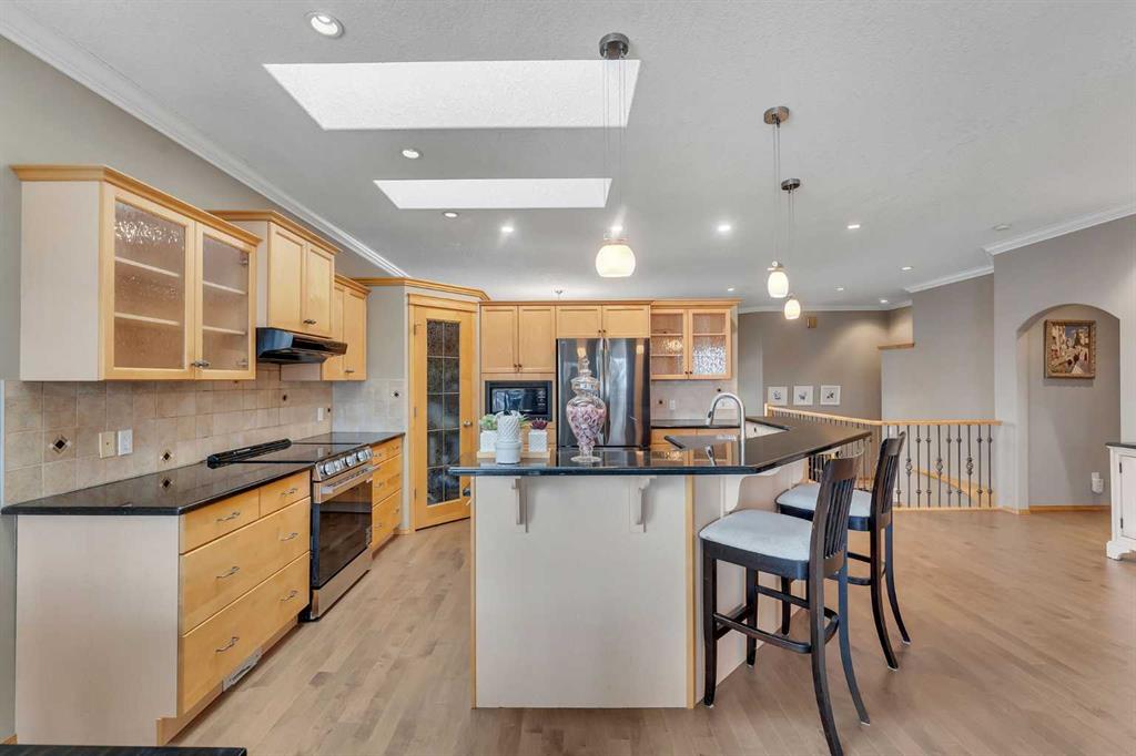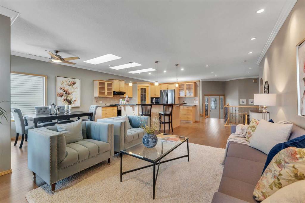The walkout basement is fully finished with IN-FLOOR HEAT. A large family room is where the family will gather in front of the fireplace with built-ins. Another great feature of this lower level is the 9-foot ceiling height and the custom bar. THREE additional bedrooms & a 4-piece bath make this an ideal home for teenagers or grandkids. The backyard is exceptionally landscaped with mature trees, perennials, and irrigation. The lower patio is very private and is a great place to listen to the birds while enjoying a good book. Watch the golfers and enjoy the sunshine from your walkout deck or from your patio. This golf course location is well-protected from errant golf balls. This is a central Airdrie location, close to the golf course, shopping, and many schools.