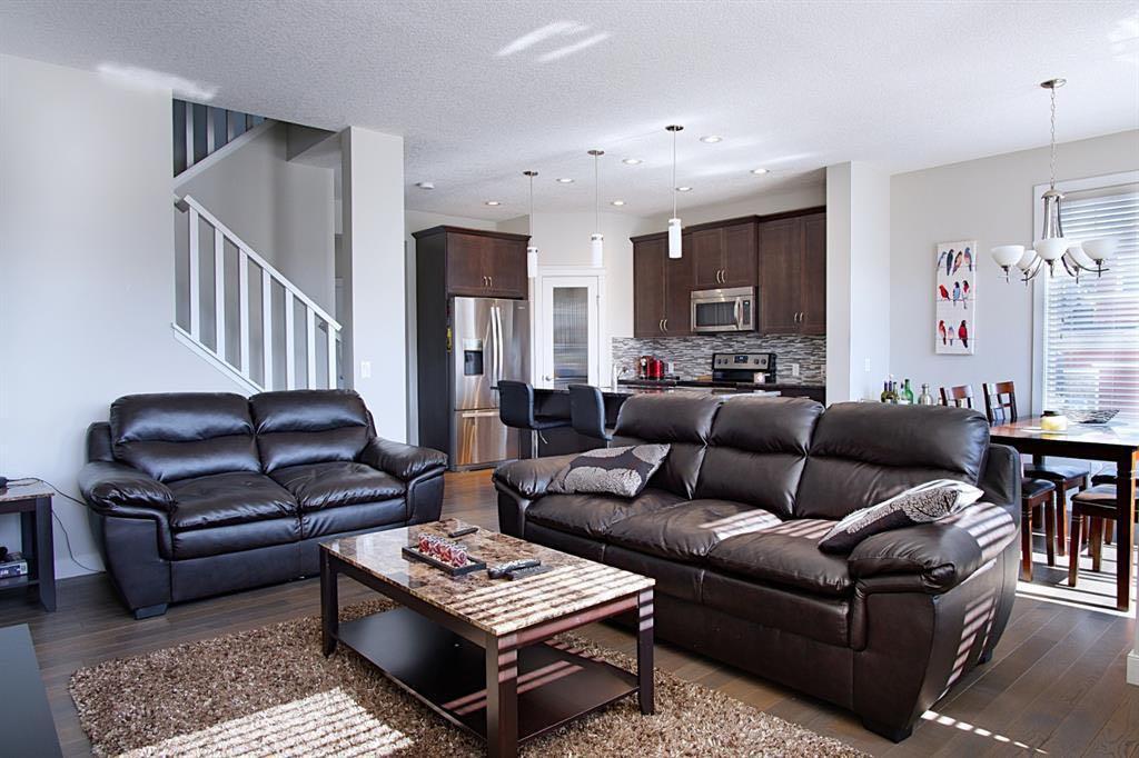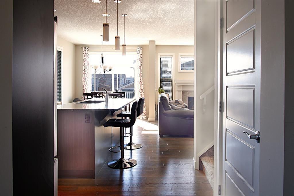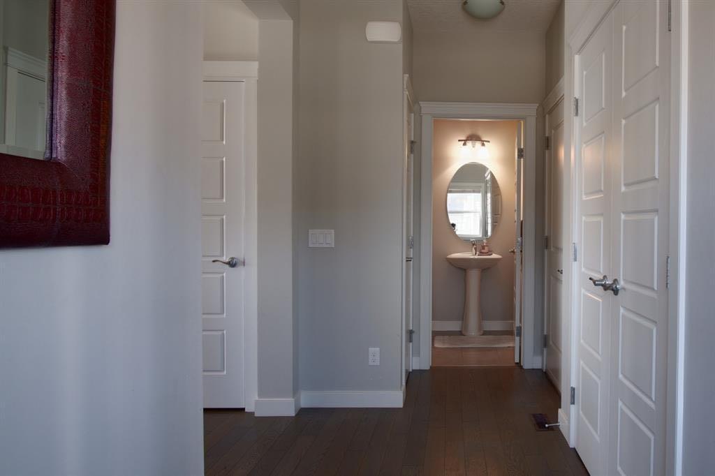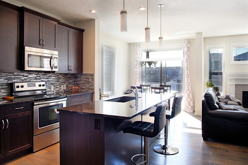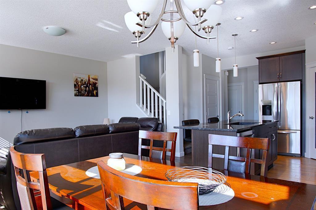 Welcome to this beautifully maintained front double attached garage semi-detached home in Redstone NE, offering space, functionality, and a family-friendly location just steps from parks and green space. Situated on a desirable corner lot, this property provides added privacy, abundant natural light, and enhanced curb appeal. Rich hardwood flooring flows throughout the main level, where the heart of the home is the spacious kitchen featuring granite countertops, a large breakfast bar island, stainless steel appliances, and a convenient walk-through pantry connecting directly to the mudroom and garage entrance. Central air conditioning ensures comfort during the summer months, and the home is also equipped with a water softener. Sliding patio doors lead to the deck for a seamless indoor-outdoor experience, while a cozy gas fireplace anchors the open-concept living and dining areas.
