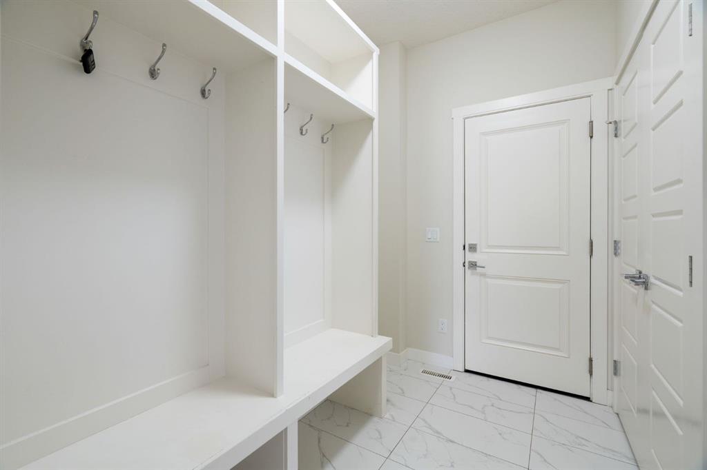 The main floor makes an immediate impression with a welcoming foyer and built-in sitting area. A main floor bedroom and full bathroom provide excellent versatility for guests, multi-generational living, or a dedicated home office. Everyday convenience is elevated with a mudroom featuring custom lockers and a walk-through pantry with MDF shelving, seamlessly connecting to the kitchen. The double attached garage ensures ample space for vehicles, storage, and all your gear.