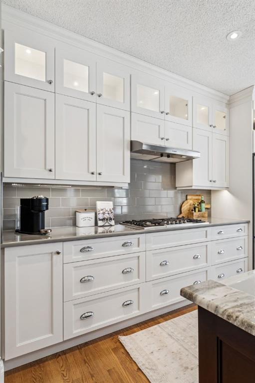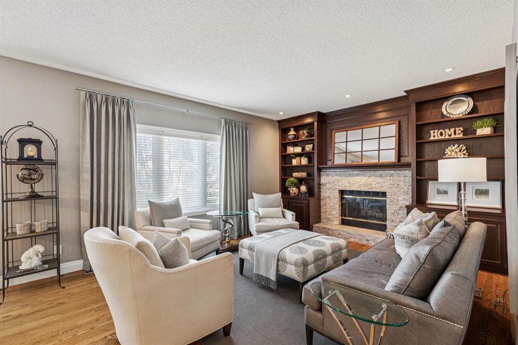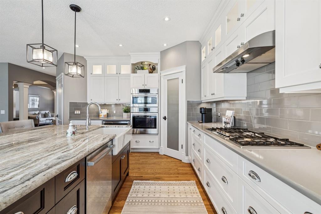 The layout flows seamlessly through the large formal living and dining areas into the warm and inviting family room with a classic gas wood-burning fireplace. The kitchen is truly exceptional — showcasing high-end custom cabinetry with thoughtful built-ins and storage throughout showcasing custom interior options for optimum entertaining, stainless steel wall unit appliances, a gas cooktop, and a large central island with large cast iron sink ideal for gathering. Hardwood floors add warmth and elegance across the main level.
