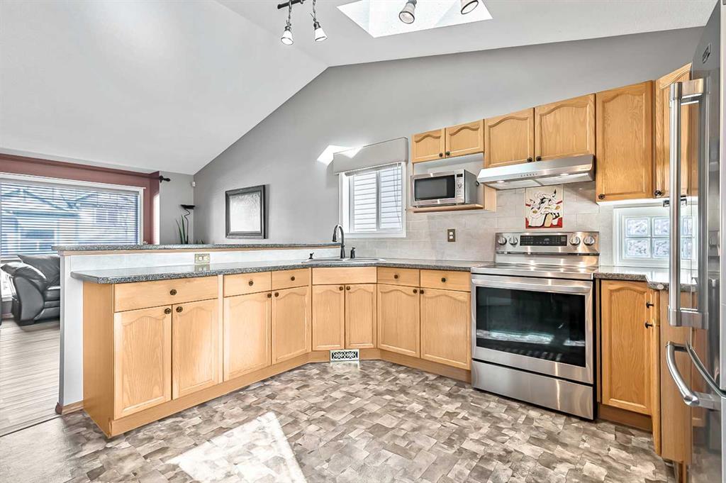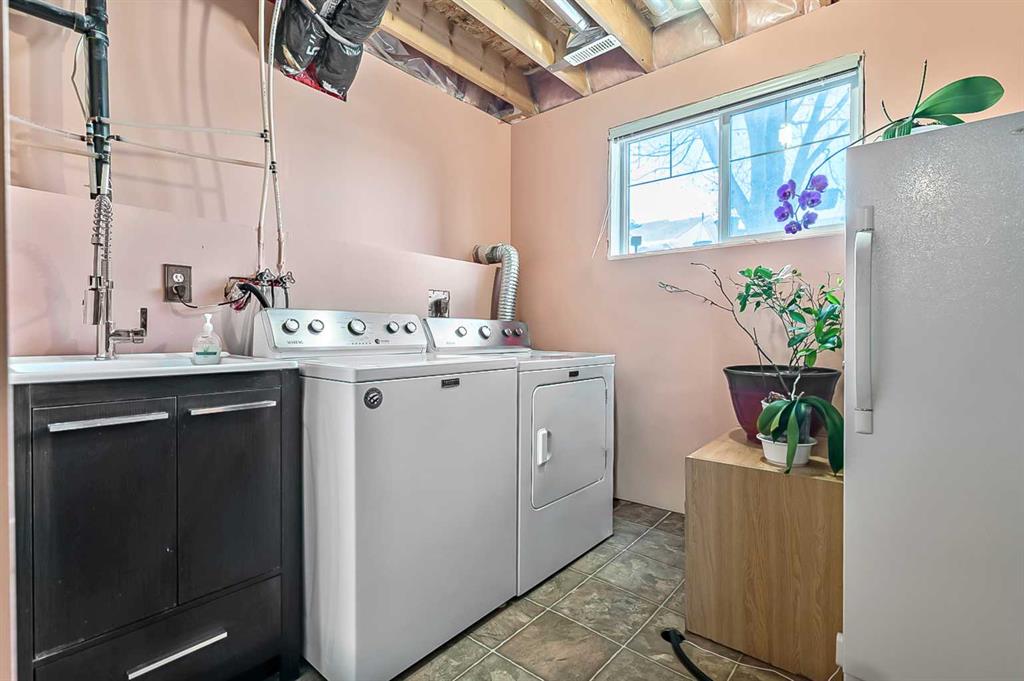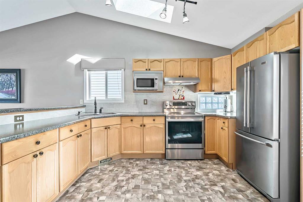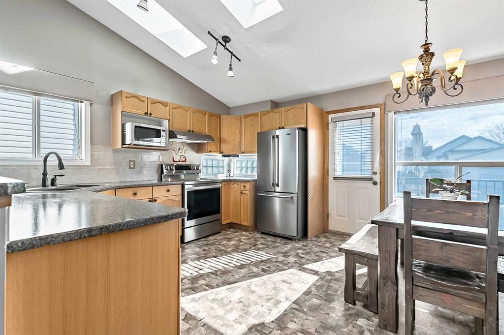 Welcome to this stunning, meticulously maintained home that truly showcases pride of ownership throughout. Presented in immaculate condition, every detail has been thoughtfully updated and carefully cared for. The inviting entry stairway opens into a bright, open-concept living room and kitchen, highlighted by vaulted ceilings and skylights that flood the space with natural light and create an airy, spacious feel. The dining area is conveniently located just off the kitchen and extends seamlessly to the refinished rear deck, making it perfect for both everyday living and effortless indoor-outdoor entertaining. The upper level features a generous primary bedroom with dual closets, a comfortable second bedroom, and a full bathroom, offering a functional and well-designed layout. The fully developed basement provides excellent additional living space with a large family room anchored by a beautiful natural gas fireplace, creating a warm and inviting atmosphere. This level also features a third bedroom, a full bathroom, a laundry room with sink, and a spacious storage area, making it ideal for guests, family members, or a home office.. Outside, the property is equally impressive. Enjoy a pergola with fire pit, a low-maintenance upgraded deck with cedar steps and aluminum railings, a redesigned front entry with concrete walkways, and rear lane access to a single paved parking pad. The beautifully maintained landscaping further enhances the home’s exceptional curb appeal. Don’t wait, book your showing now!