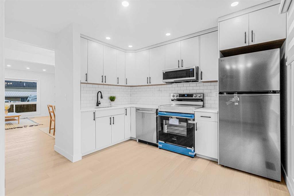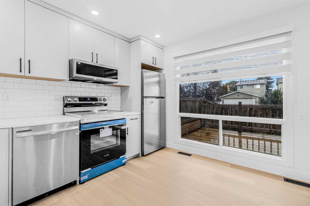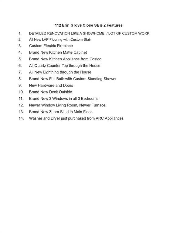 PRICE TO SELL | DETAILED RENOVATION LIKE A SHOWHOME | LOT OF CUSTOM WORK | All New LVP Flooring | Custom Electric Fireplace | Brand New Kitchen Matte Cabinet | Brand New Kitchen Appliance from Costco | All Quarzt Counter Top through the house | Custom Standing Shower | New Hardware and Doors | Brand New Deck | Brand New 3 Windows in all 3 Bedrooms | Newer Window Living Room | Newer Furnace | Brand New Zebra Blind in Main Floor. Welcome to #2, 112 Erin Grove Close SE, a 3 bedroom 1.5 bath two-storey townhome nestled in the heart of Calgary’s Erin Woods community. This home has been fully renovated from top to bottom with premium materials, exceptional craftmanship, functional and style. Luxury vinyl plank floor throughout the house, brand new bedroom windows, brand new kitchen cabinets brand new appliances and bathroom amenities, new deck. Back lane is accessible with one assigned parking slot, and lots of parking right in front of the house. On entering the main foyer, you will find a bright living room, with large windows and a stylish fireplace providing a cozy and modern feel. Kitchen has been fully renovated with quartz counter top, with a large windows overlooking the deck and backyard. Upstairs boasts 3 good sized bedrooms and a full bathroom with modern lights and standing shower. The basement is spacious and not finished, awaiting your personal touch. Located in the tranquil Erin Woods neighborhood, this home is just minutes from schools, parks, shopping, and offers easy access to Deerfoot and Stoney Trail, making commuting a breeze. The area is known for its quiet streets and abundance of green spaces—ideal for families and outdoor enthusiasts. Affordable and move-in ready, this house is a gem and can’t be missed. Book your showing today before it’s gone.