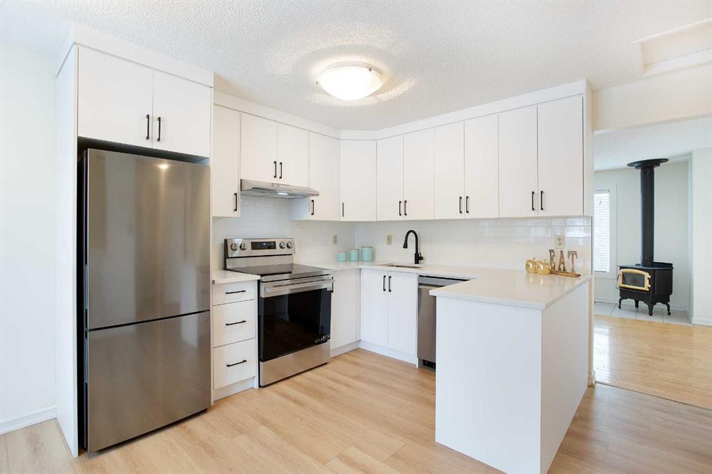 YOUR NEW HOME … is in the highly desired Marda Loop, located on a quiet street but one block off of the main street with every conceivable eatery, pub, specialty boutiques and beauty services. This rare offering is a row design 4 plex, giving every owner front view access with your parking directly out of you back door. Open the front door and notice the durable hardwood floors, cozy fireplace and how incredibly bright it is. Walk into the kitchen and be in awe, its gorgeous, with 42 in custom cabinets, quartz counters, modern stacked tile backsplash, and worry free (under warranty), brand new stainless appliances and new vinyl plank flooring. Off to the side is your convenient newly renovated power room. Down 4 stairs and you will find your convenient mud room, with access to the parking stalls and each of the common , private, back yards. Back inside, down 4 stairs and you will find the laundry room, and maintenance room (furnace is 10 years old, HWT 5 years old) 2 generous, very bright bedrooms, 4 piece bathroom and lots of under the stairs storage. The exterior has been exceptionally well maintained and updated: roof 2016, windows 2013, east side fence 2024, yard work (hedge) 2020 new landings and steps 2021. Be the envy of all of your friends with a Marda Loop address and a beautiful home. I almost forgot to mention … condo fees are only $200.00 a month! Hurry, this will sell fast.