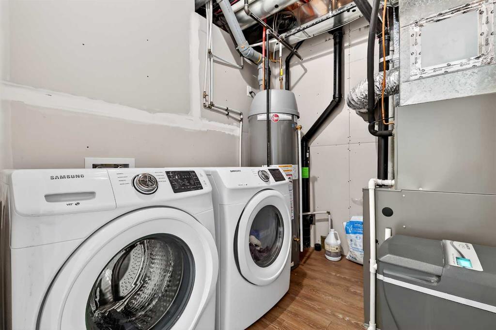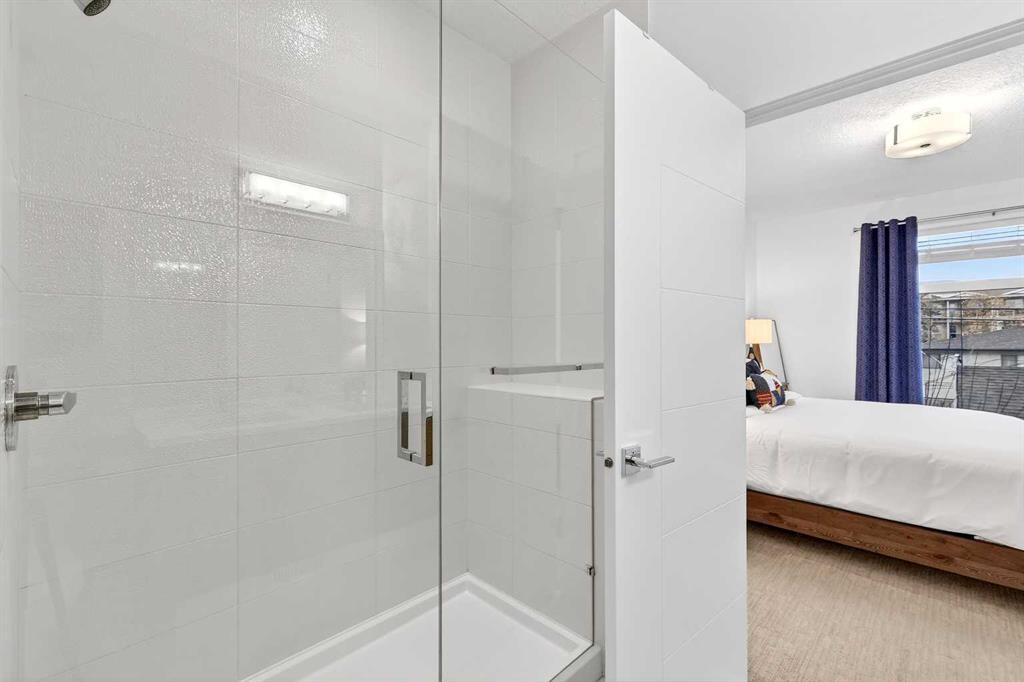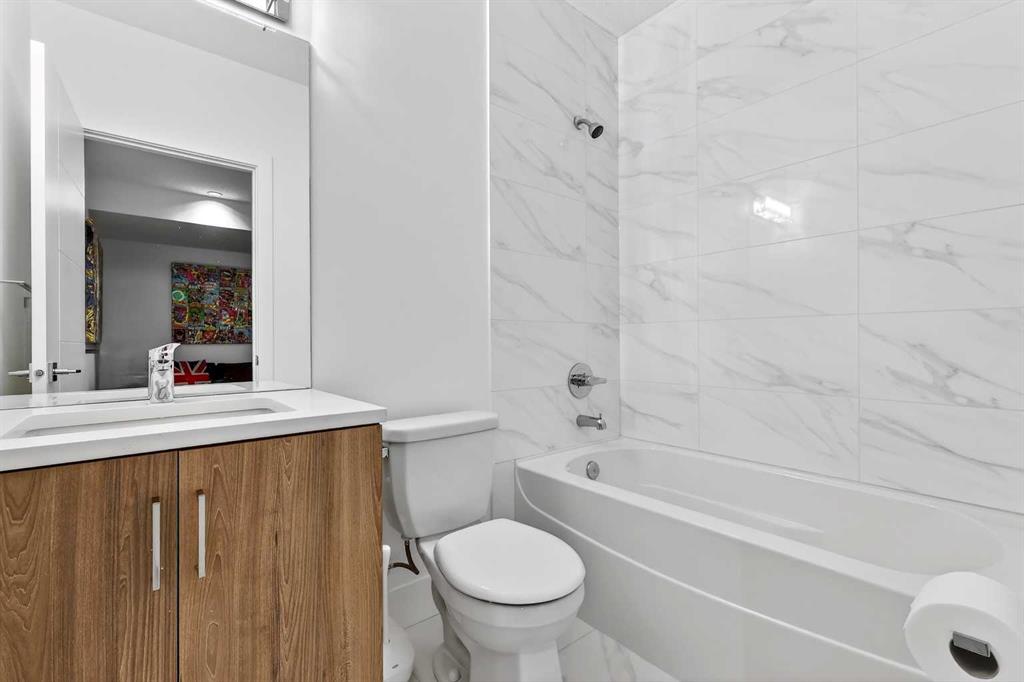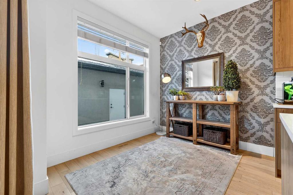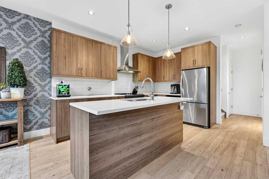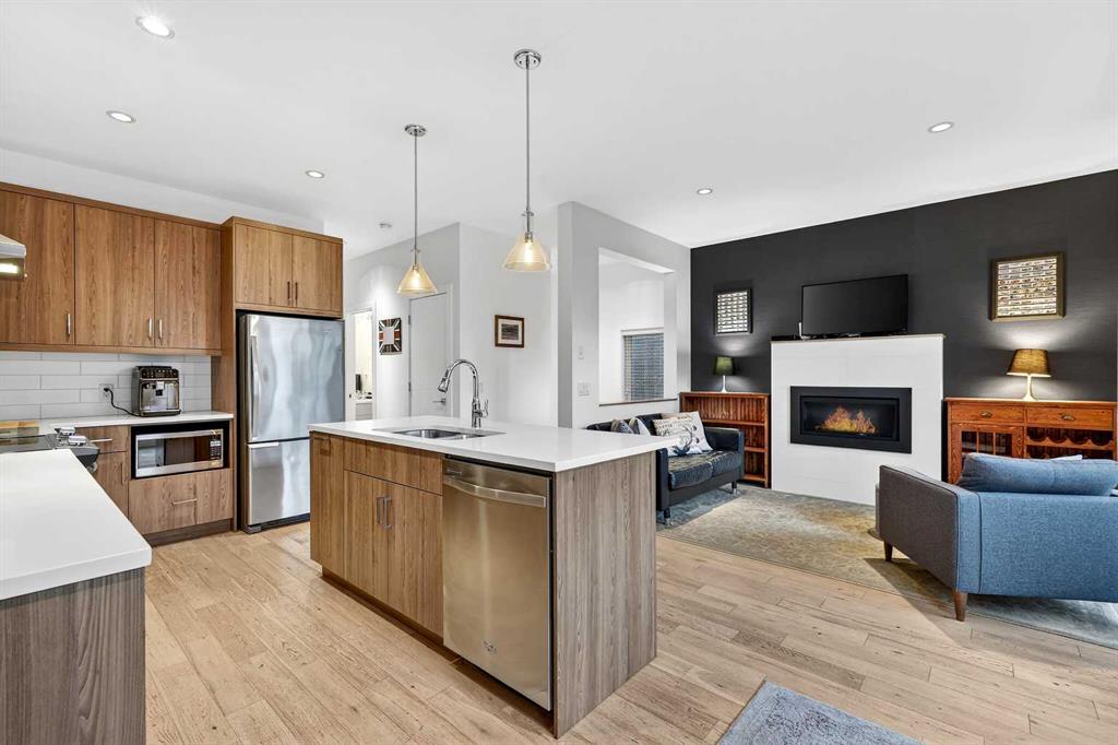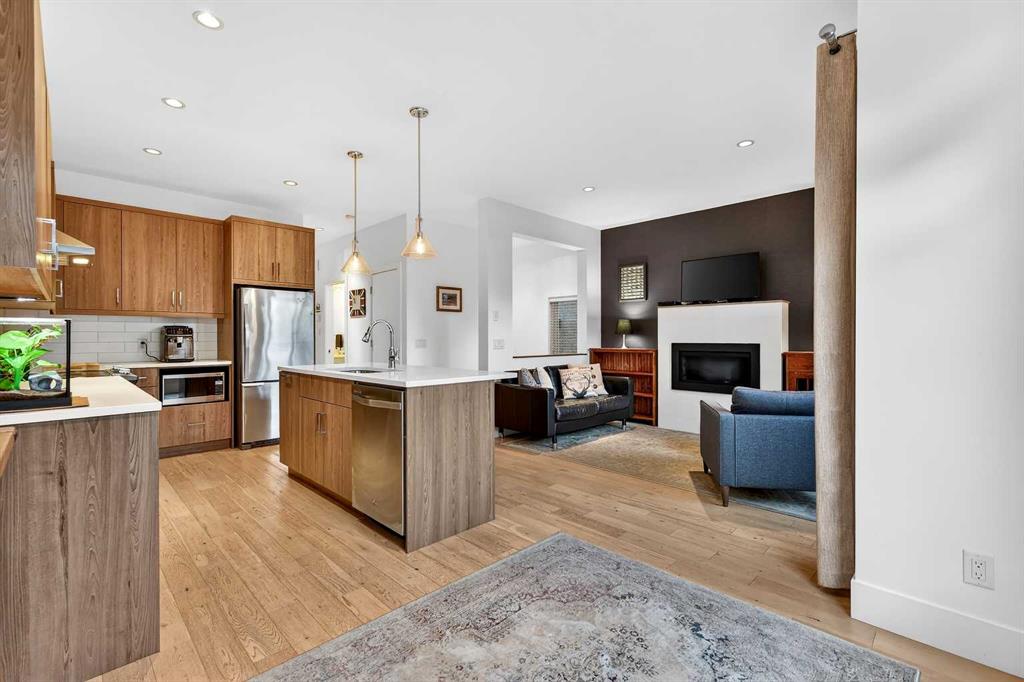 Perfectly positioned on a tree-lined street directly across from the Killarney Aquatics Center and park, this sophisticated rear-unit townhome offers a premium blend of privacy and urban convenience. The main level features soaring 9′ ceilings and quality engineered flooring throughout an inviting, open-concept floor plan. The centerpiece kitchen is designed for both style and utility, boasting quartz countertops, a central island, a full appliance package, and ample storage within extended-height cabinetry and a separate pantry. The living area, anchored by a cozy gas fireplace, flows effortlessly into the dining space, creating an ideal layout for daily living and entertaining.