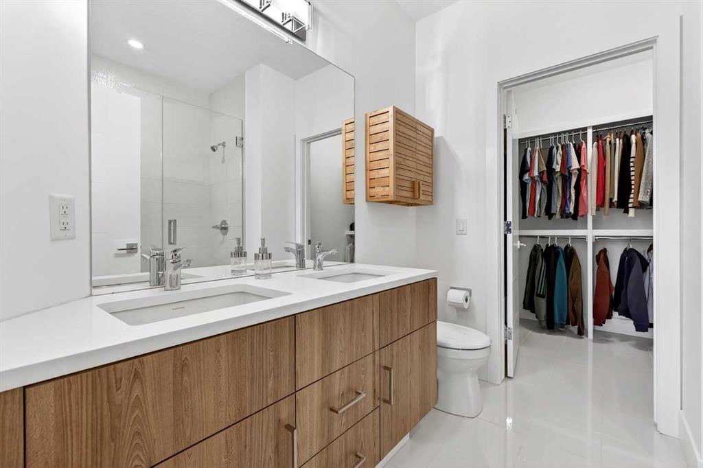 The upper level is thoughtfully configured with two primary bedrooms, each offering the convenience of its own private ensuite. The main primary suite includes a walk-in closet and a 4-piece ensuite with dual sinks. Downstairs, the fully developed basement provides valuable additional living space, featuring a large recreation room, a quiet private office, a well-appointed 4-piece bath, and dedicated laundry and storage area.