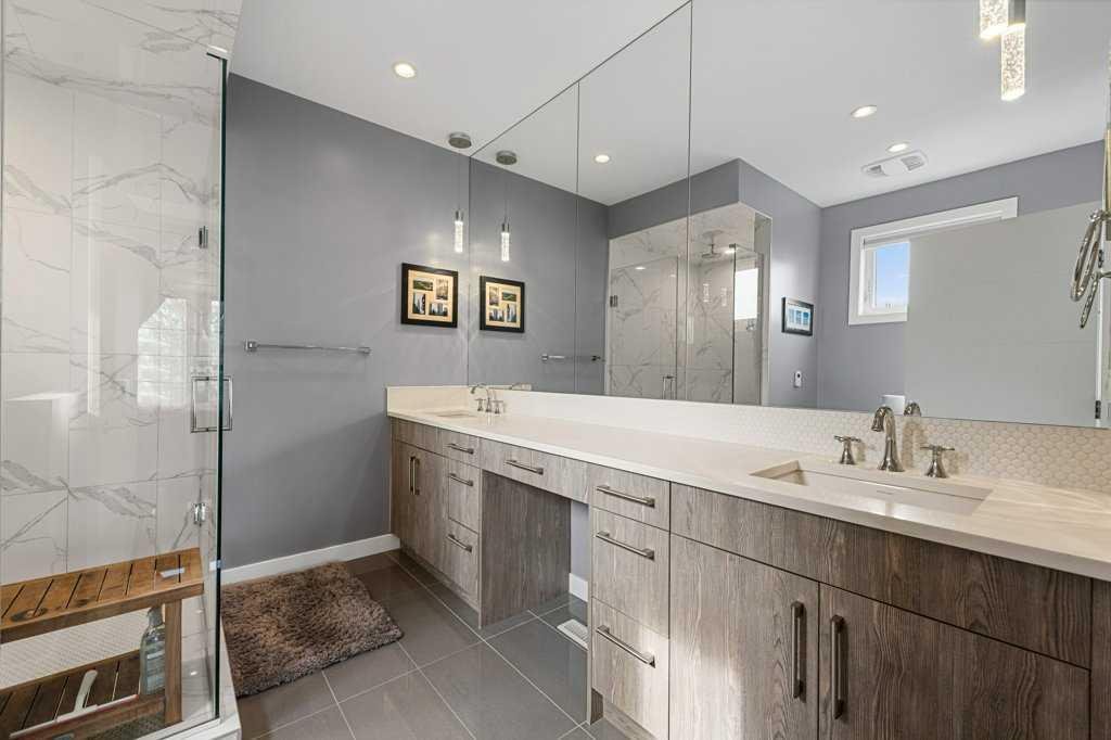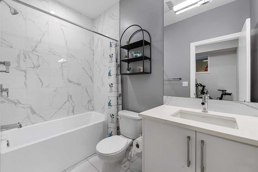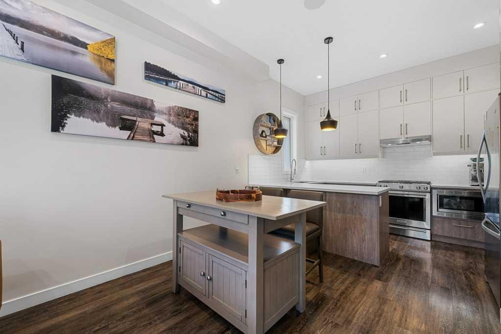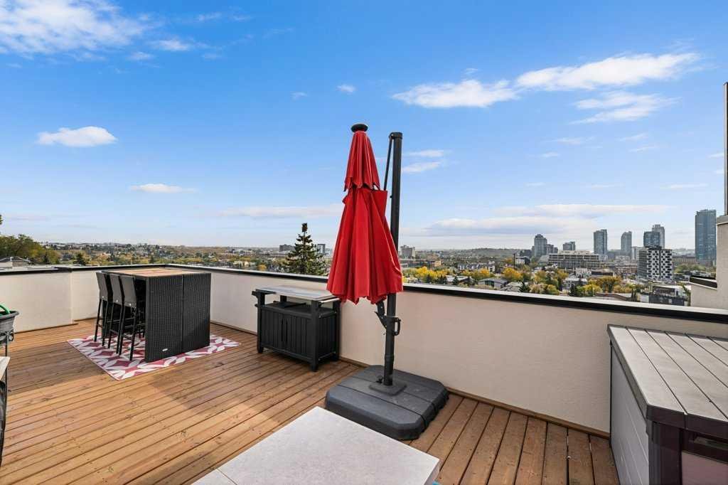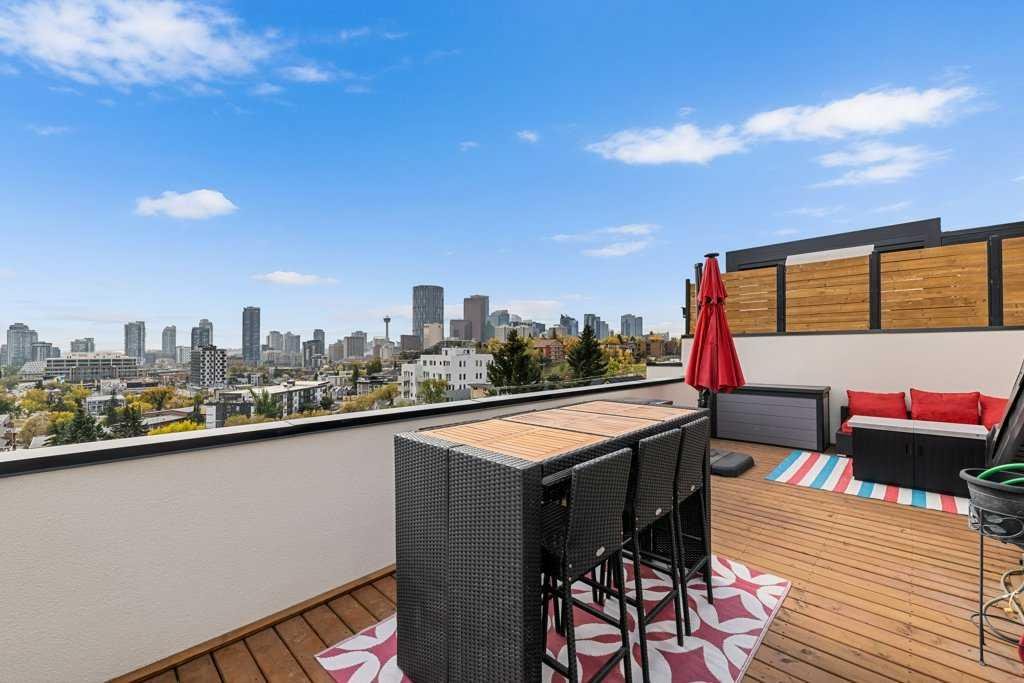 There are three bedrooms and three and a half baths, including a top-floor primary with a walk-in closet and a double-sink ensuite. But the real star is the rooftop patio, a huge private deck with some of the best views in Calgary. It’s the kind of space that’s perfect for dinner parties, late-night drinks, or just stretching out and watching the skyline.