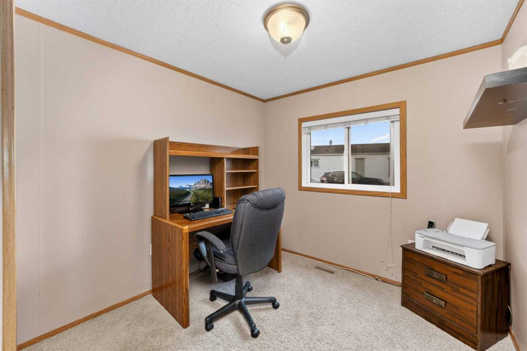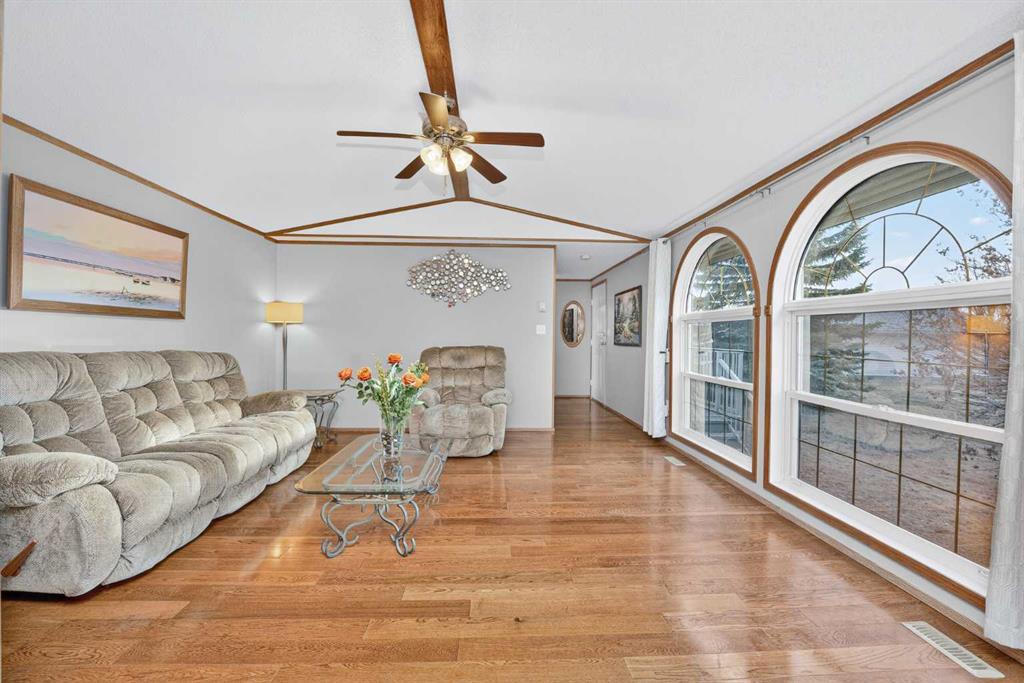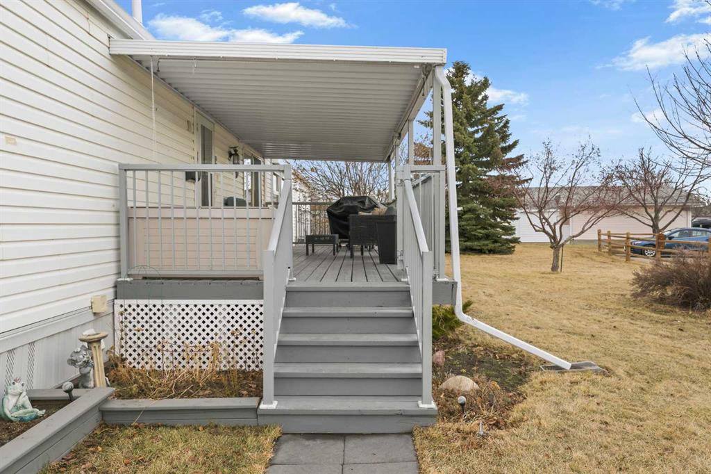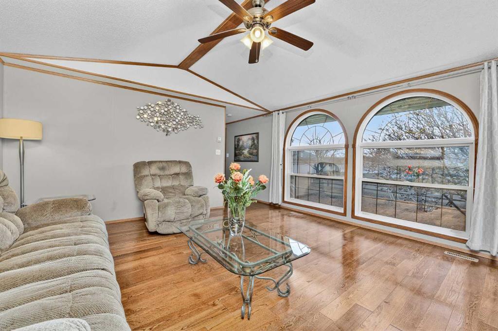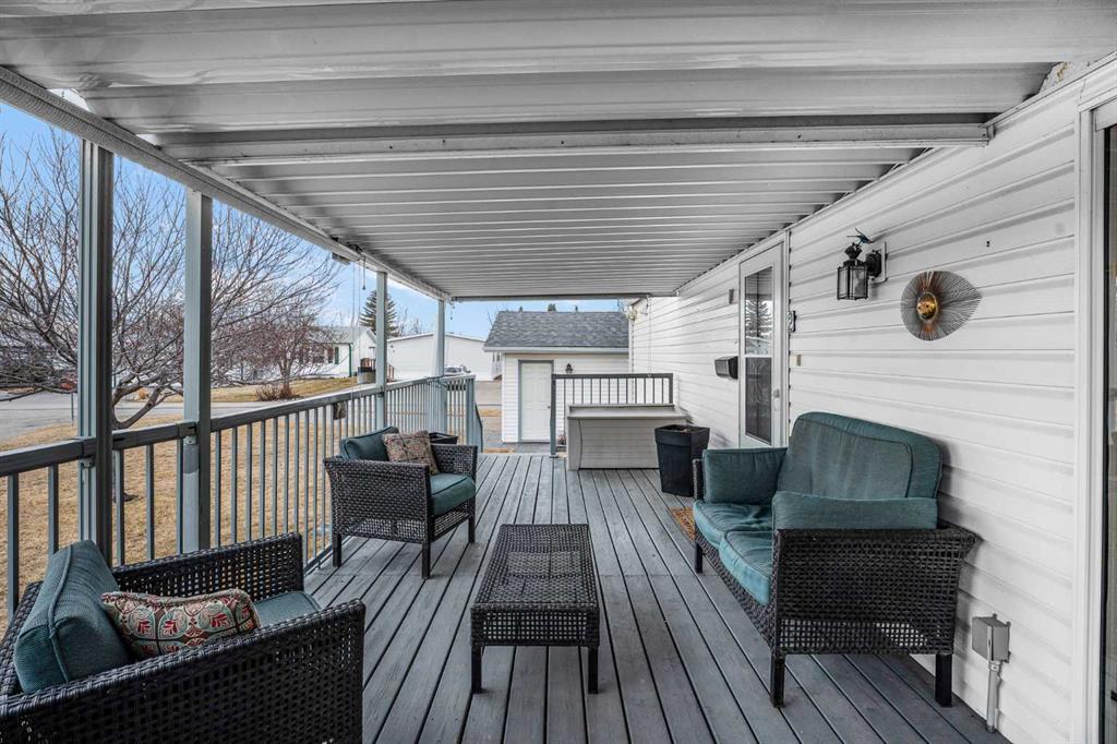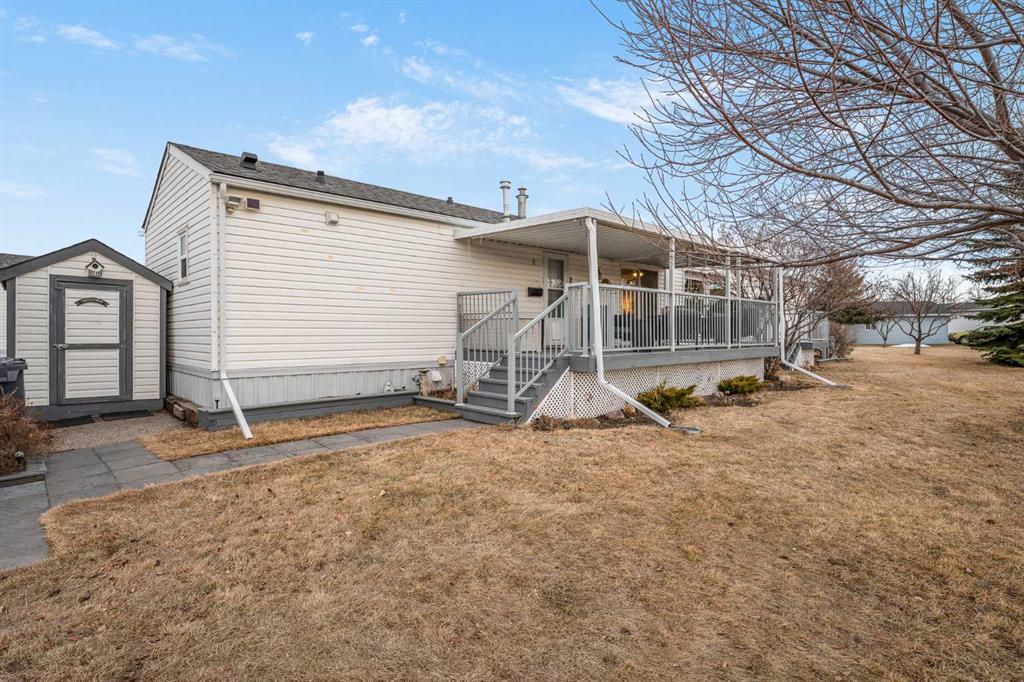 Located in Strathmore’s Ranch Estates, a premier adult living community. This well-maintained 3-bedroom, 2 full-bath home, including an ensuite walk-in shower and walk-in closet, offers comfortable, low-maintenance living, with landscaping included in the park fees. The open-concept design features a bright kitchen area with stainless steel appliances and a skylight. It flows seamlessly into an inviting, bright living space accented with hardwood flooring and large windows with shutters—step outside to a spacious west-facing covered deck with rolling shades and a gas BBQ—perfect for entertaining guests. Practical highlights include an insulated garage finished with drywall, an attached workshop, and a 6′ x 8′ garden shed for additional storage. Recent exterior updates include the roof and eavestroughs. Located near many amenities like shopping, restaurants, walking paths and Kinsmen Park—an excellent opportunity for buyers seeking convenience, comfort, and a community-focused lifestyle.
