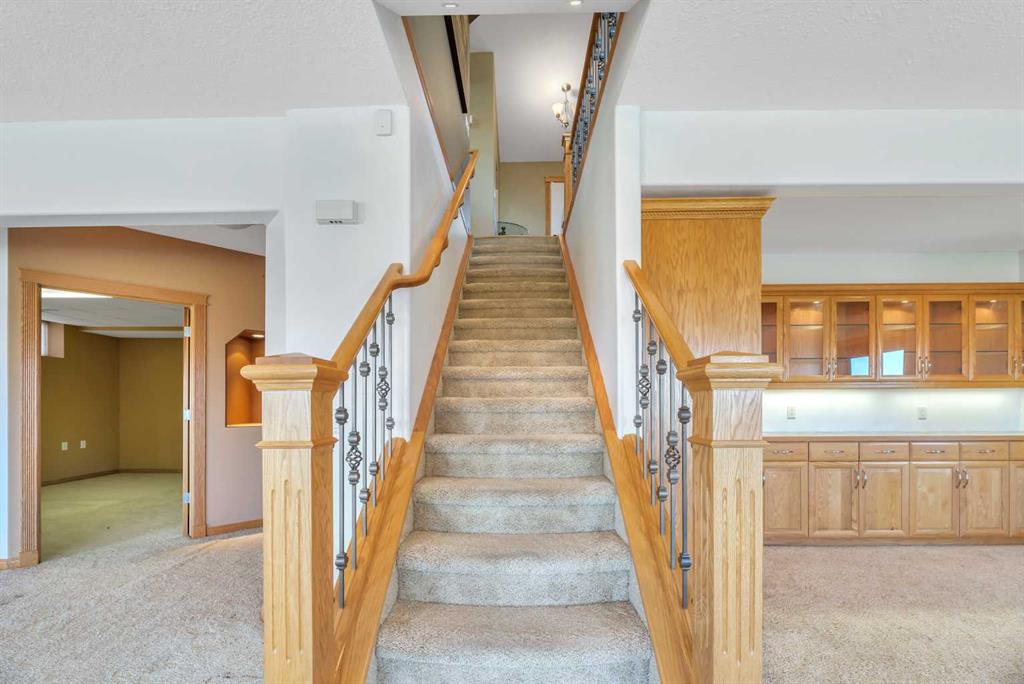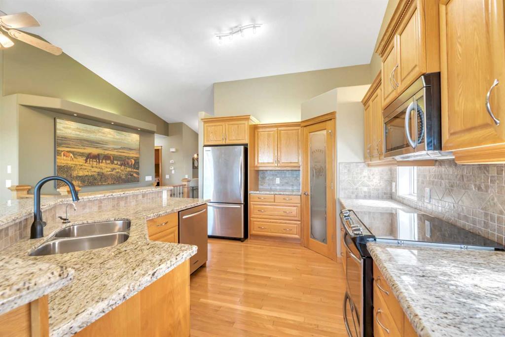This beautifully designed walkout bungalow combines comfort, style, and an unbeatable setting. Enjoy peaceful mornings on the inviting front porch and take in the serene views of the green space behind, all with low-maintenance landscaping to keep life simple. Step inside to a spacious main floor with vaulted ceilings and gleaming hardwood floors. A French door leads to the den, perfect for a home office. The living room features a cozy gas fireplace, while the bright kitchen offers a breakfast bar, granite countertops, pantry, and flows seamlessly to the dining area with custom built-ins. The primary suite includes a walk-in closet and a spa-like ensuite with a corner soaker tub. Main floor laundry is a bonus, complete with sink and cabinets for added convenience. The fully developed walkout basement expands your living space with a wet bar, built-ins, large rec room, additional bedroom, and a 4-piece bath—ideal for entertaining or family gatherings. Stay cool year-round with air conditioning, and enjoy the practicality of a double attached garage. This home offers the perfect blend of elegance and easy living in a prime location.