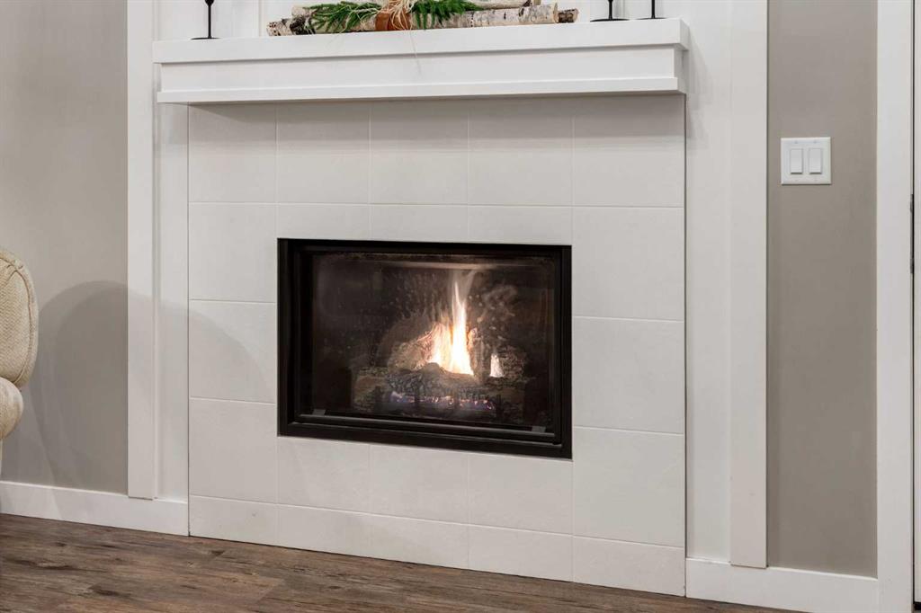 Inside, the home welcomes you into a SPACIOUS LIVING ROOM w/VAULTED CEILINGS + expansive TRIPLE-PANED WINDOWS that flood the space w/natural light + capture BEAUTIFUL morning/evening views. NEUTRAL TONES, RICH LVP FLOORING, + a STRIKING GAS FIREPLACE create a cozy yet refined atmosphere, while the open layout offers plenty of room for comfortable seating.