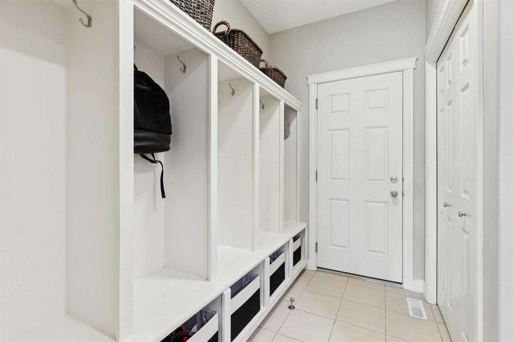 The dramatic two-storey living room showcases a striking stone fireplace to the ceiling, offering a stunning focal point and an inviting space to gather. Functionality is at the forefront with a walk-through pantry—complete with a custom chalkboard wall—leading to a well-designed mudroom outfitted with five individual lockers to keep busy family life effortlessly organized.