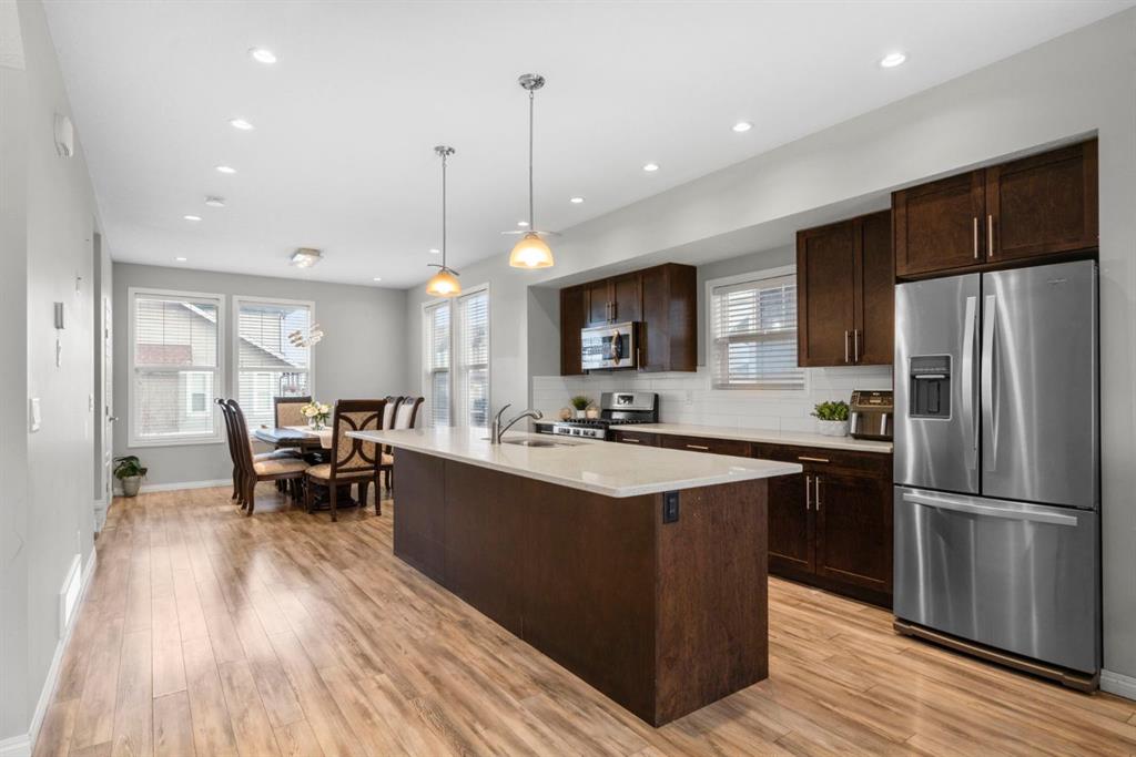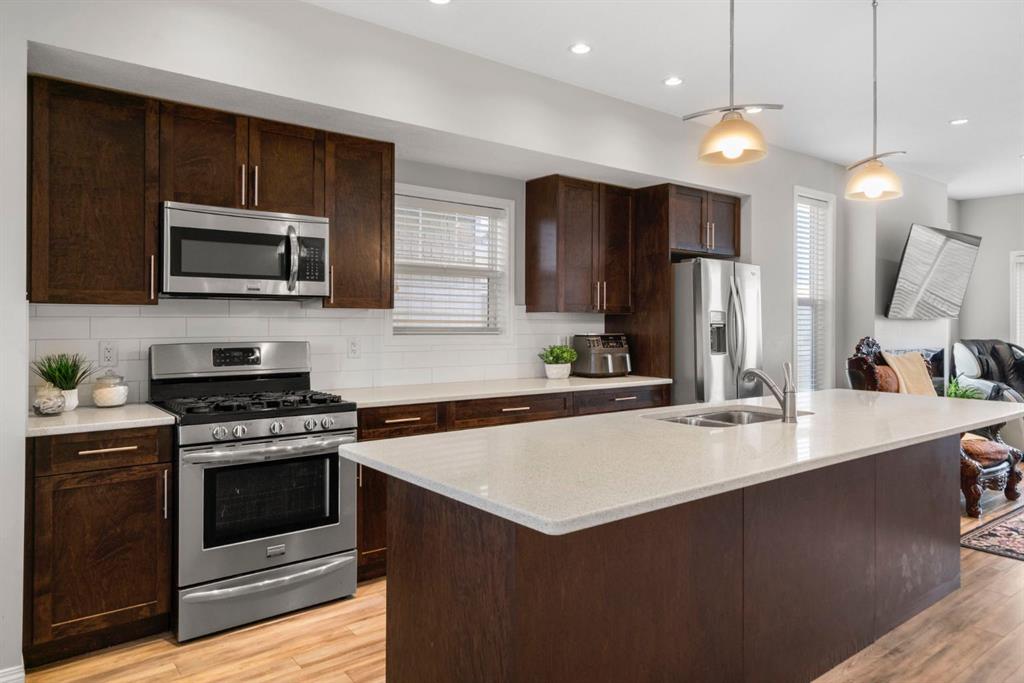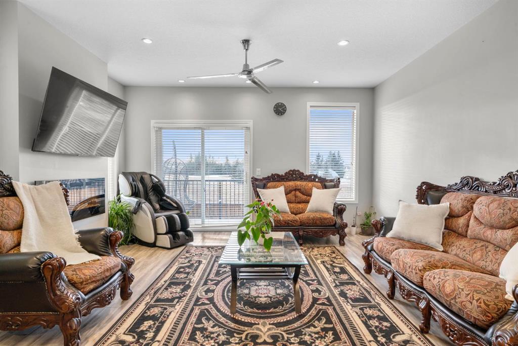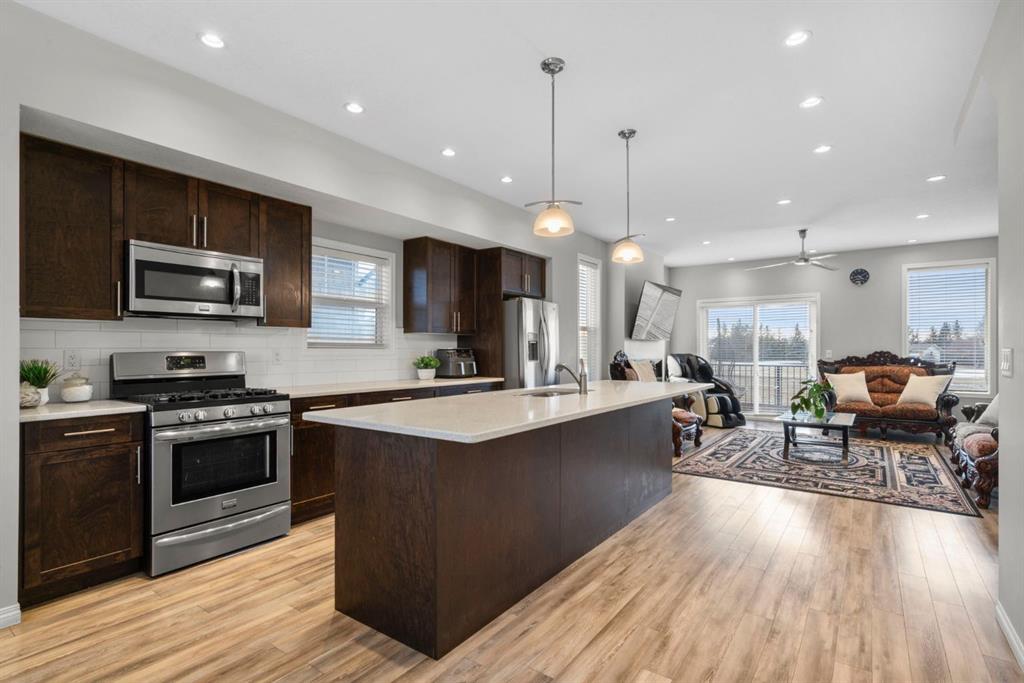 Welcome to this beautifully maintained three-level townhouse in the desirable community of Williamstown in Airdrie, offering 1,718.22 sq ft of well-designed living space, a functional layout, and a rare double attached garage. The ground-level entry provides a welcoming first impression with durable flooring and a bright, practical layout. This level features a spacious office space—ideal for guests, a home office, or multi-generational living—along with a full 3-piece bathroom, offering excellent flexibility and privacy. The main living level showcases an inviting open-concept floor plan designed for both everyday living and entertaining. The kitchen is the heart of the home, featuring quartz countertops, dark cabinetry, stainless steel appliances, a classic subway tile backsplash, and a large central island with seating. The kitchen flows seamlessly into the dining area and spacious living room, where a contemporary electric fireplace adds warmth and style. Large windows flood the space with natural light, and sliding doors lead to a private balcony—perfect for morning coffee or evening relaxation. A convenient main-floor powder room completes this level. Upstairs, the home continues to impress with three additional bedrooms, including a generous primary retreat featuring a 4-piece ensuite and ample closet space. A second full bathroom serves the additional bedrooms, while upper-floor laundry adds everyday convenience and efficiency. Outside, enjoy open sightlines and green space views, enhancing both privacy and lifestyle appeal. Located in a well-maintained complex, this home is close to walking paths, parks, schools, shopping, and offers easy access to major commuter routes. This move-in-ready townhouse delivers the perfect blend of space, comfort, and location—ideal for families, professionals, or investors seeking a low-maintenance lifestyle in one of Airdrie’s most welcoming communities.