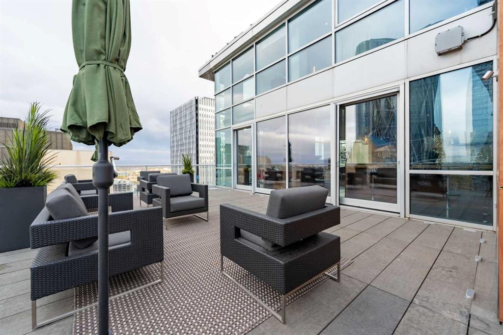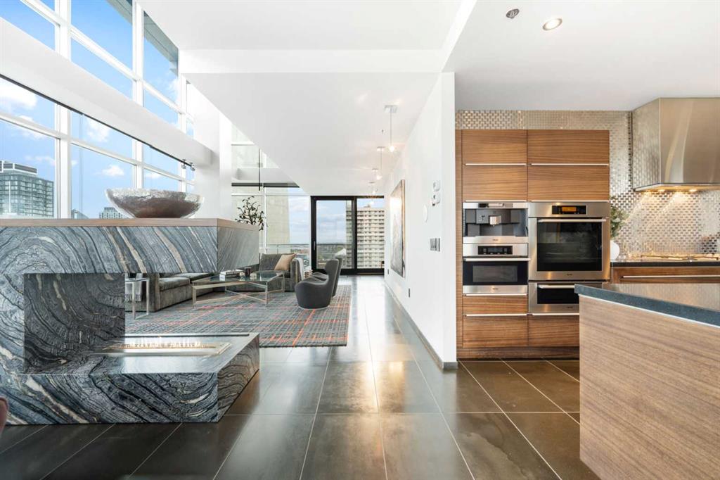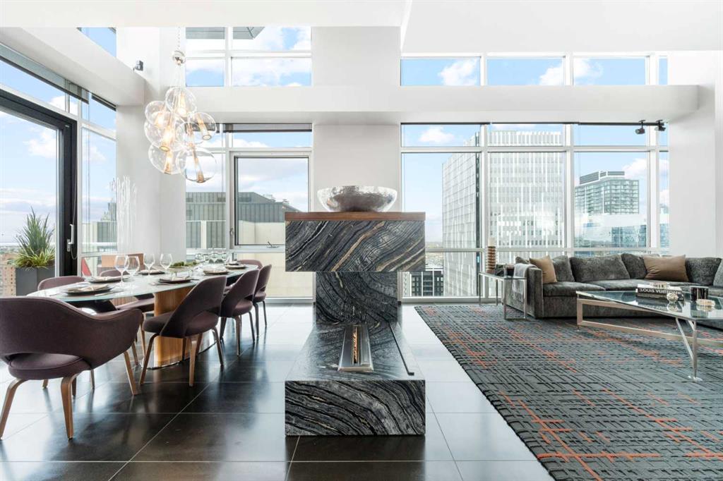 Executive Two-Story Penthouse with Expansive Downtown Views of Calgary and beyond. Showcasing breathtaking North, South and East exposure. Ideally located next to Calgary’s Arts Common Building, Glenbow Museum, Calgary Tower, the historical Palliser Hotel, as well as Stephen Avenue Street Mall with its endless restaurants, cafes, shops and lounges. The residence at the Le Germain offers a true elevated lifestyle with world-class amenities such as Concierge, Spa and Gym access, housekeeping services, dry cleaning services, 24/7 building surveillance, pet wash, car wash, maintenance, as well as a hotel account privileges and in-suite dining delivered to your door from the award winning Charcut Restaurant all at your fingertips. With two elevators taking you to the 20th floor, you will enter 2,399 sq.ft. of luxury living with soaring ceilings through out including a vaulted living room, custom fireplace featuring leathered silver wave marble and Zebra Walnut built in cabinetry through out. The chef-inspired kitchen offers Miele appliances including built-in oven, 5 burner gas cook top, warming drawer, microwave/convection oven, range hood, built-in coffee machine, dishwasher and refrigerator. Also featured is the stackable Asko Washer and Dryer and Cavavin by LG wine refrigerator. With black quartz countertops adorning the cooking space as well as the expansive island. With endless built in storage along the West wall including the Concierge closet to receive your deliveries and dry cleaning. Across from the Concierge closet enjoy the separate laundry room where the custom cabinetry continues, including a convenient laundry chute from the second floor down. Under the stairwell you will find in-suite storage. Expand your living space through the nine-foot doorway leading to a 630 sq.ft. (approx.) terrace, one of three balconies enhancing the skyline views, from the second 39-ft. long (approx.) south facing balcony enjoy spectacular views of the Calgary Tower and beyond. Upstairs, the primary suite offering stunning north facing views, a five-piece ensuite including an oversized shower, dual vanities and soaker tub. Following through with the custom Zebra walnut wood cabinetry into the walk-in closet, with built-in safe and enjoy your private deck with hot tub, overlooking the lively Stephen Avenue Street Mall. The guest suite features south-facing views providing comfort and privacy with its own three-piece ensuite. Across from the guest suite find a coinvent office or study area with a custom desk. Enjoy three separate air conditioning units, one for each level of the suite. Included are two assigned parking stalls, with use of a third and one storage unit. Truly sophisticated urban living at its finest.