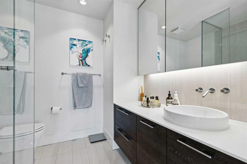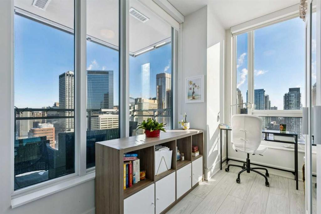 Live, work and play at The Mark on 10th. Perched on the 20th floor, this bright and spacious corner unit offers breathtaking panoramic views of Calgary’s downtown core and the vibrant Beltline. Featuring 2 bedrooms, 2 bathrooms and a private den with sliding glass doors, the thoughtfully designed 909 sq ft layout blends style and function. The contemporary kitchen is appointed with premium German appliances/cabinetry, Kohler fixtures and sleek quartz countertops. A custom walk-in closet, blackout blinds in both bedrooms and a private balcony create a sophisticated retreat above the city.