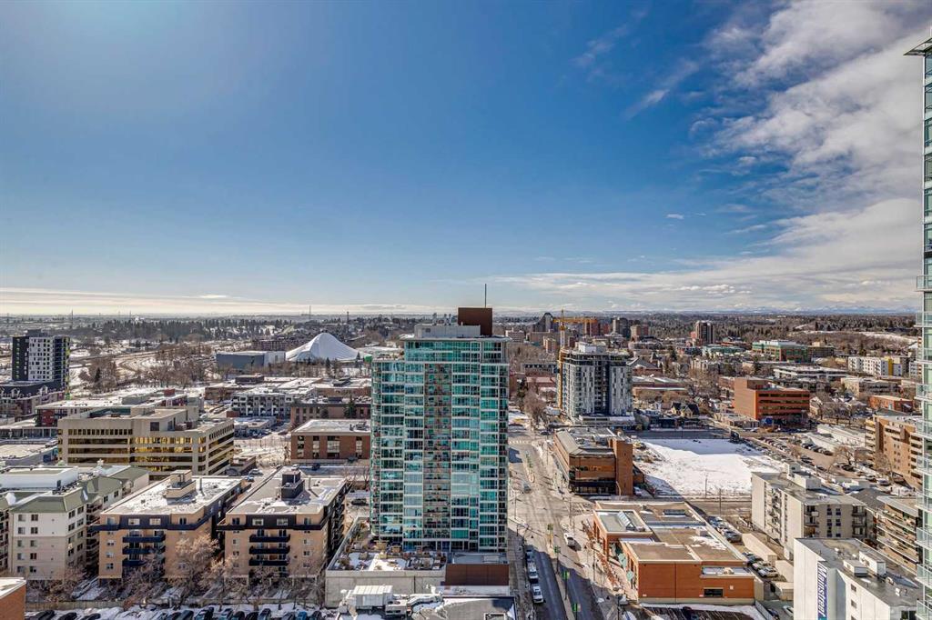 Perched high above the city on the 20th floor of Colours, this one bedroom, SW facing corner apartment offers a front row seat to some of Calgary’s most striking skyline views. With Stampede Park below, the downtown towers to the north, and the Rocky Mountains visible on clear days, the outlook feels more like a big city skyline than typical condo living. The unit offers approximately 635 square feet with a practical, open layout and 9.5 foot ceilings that add to the sense of space. Polished concrete floors run throughout, complemented by floor to ceiling windows that frame the view and bring in excellent natural light. The kitchen features granite countertops, stainless steel appliances, custom cabinetry, and a breakfast bar that connects easily to the main living area. A small office or den area provides a convenient work from home option, while the living space opens to a private balcony that extends the living area outdoors. The bedroom also enjoys full height windows and connects to a walk-through closet with built in organizers. The bathroom includes a soaker tub, granite vanity, and marble tile backsplash. Additional features include in suite laundry, titled underground parking, bike storage, and professional management. Colours is open to Short Term Rentals, making for a great investment opportunity. With restaurants, entertainment, transit, and the energy of the Beltline and Stampede district just outside your door, this home offers a true urban lifestyle with views that are hard to match. Call your favorite realtor today to book your private tour.