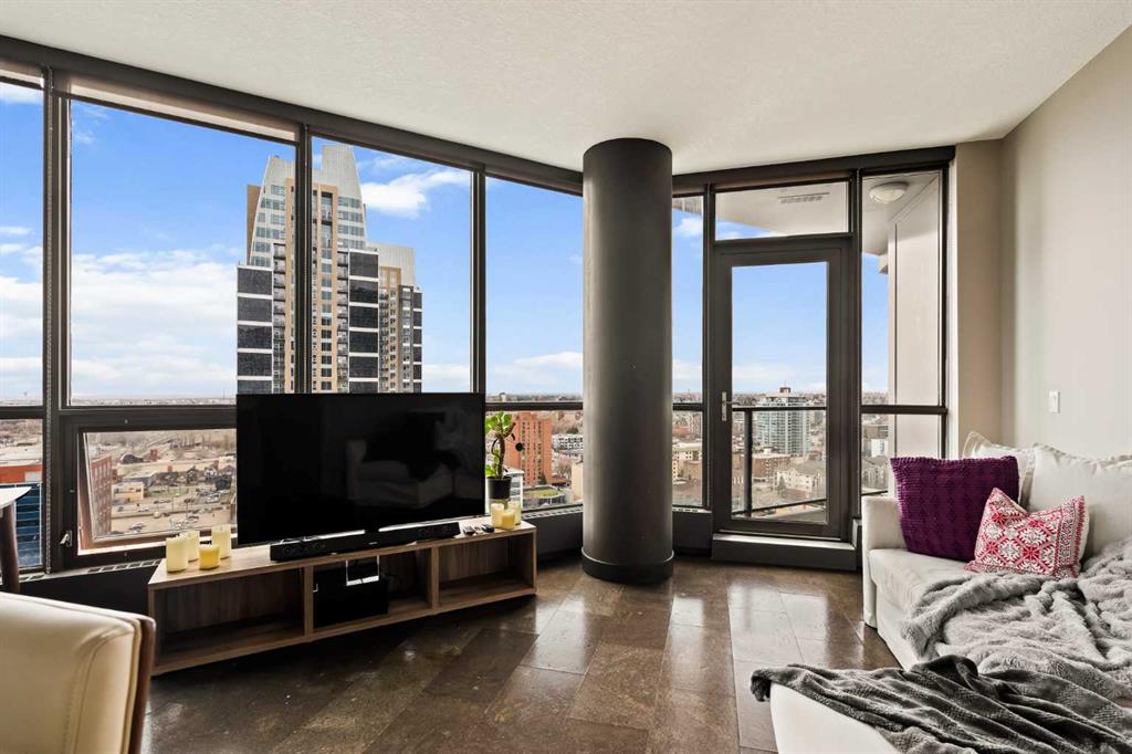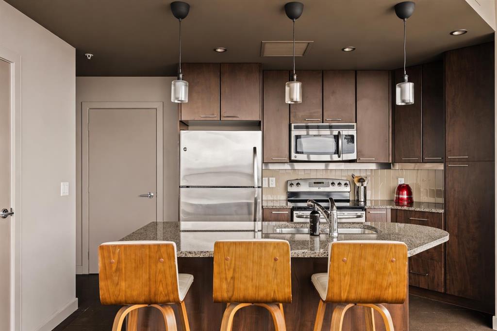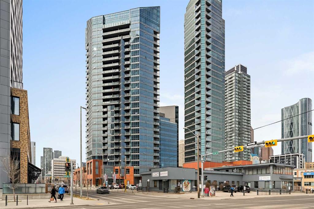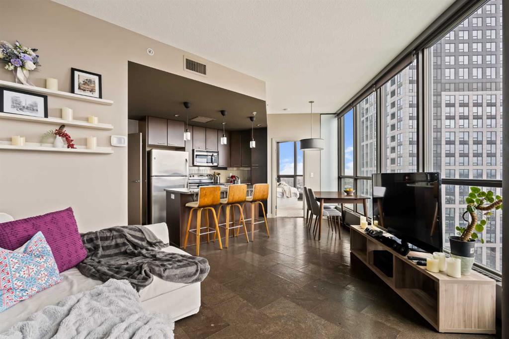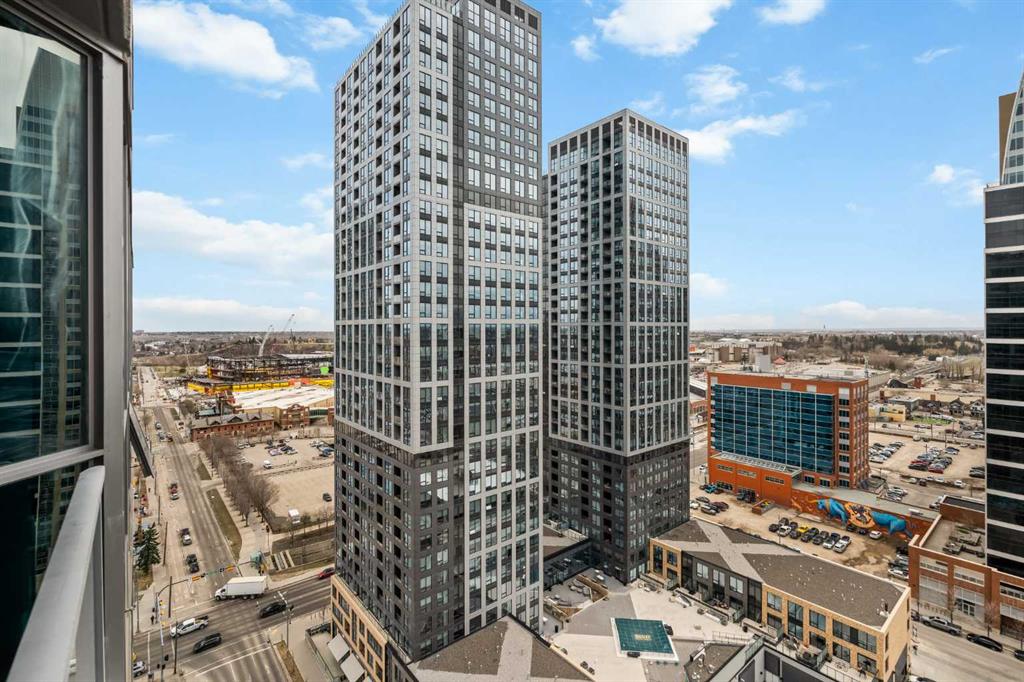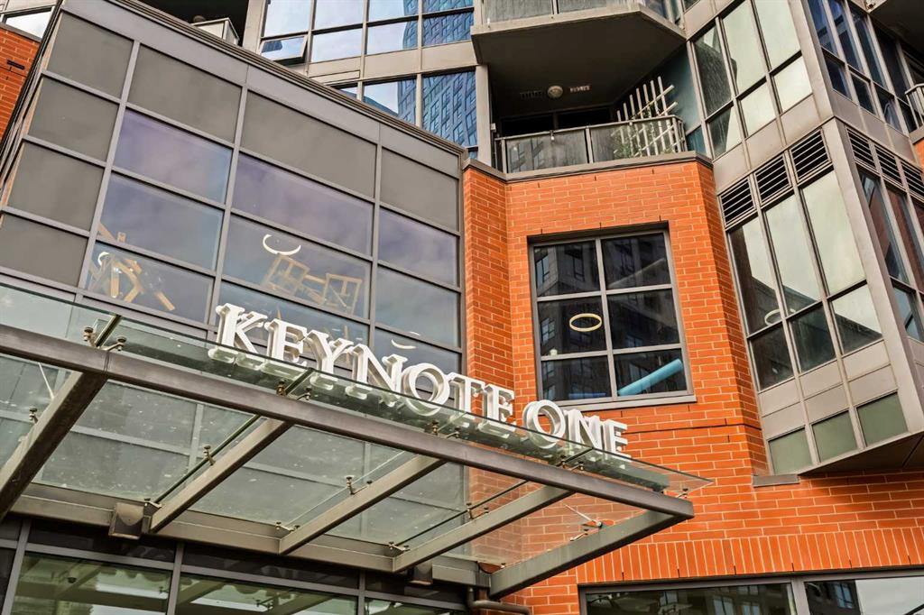 Welcome to Unit 2008, located in the highly sought-after Keynote 1 building in the heart of Calgary’s vibrant Beltline. Perched on the 20th floor, this beautifully appointed 1-bedroom, 1-bathroom condo offers over 560 sq. ft. of thoughtfully designed living space, with stunning south-facing views over the Stampede Grounds and sweeping west-facing views toward the Rocky Mountains. Floor-to-ceiling windows fill the home with natural light throughout the day, creating a bright and inviting atmosphere. The open-concept layout seamlessly connects the kitchen, dining, and living areas, making the space ideal for both everyday living and entertaining. The timeless kitchen features a functional layout with granite countertops, stainless steel appliances, ample cabinetry, and a convenient island with seating. The living area is framed by expansive windows and provides direct access to a private balcony, perfect for enjoying your morning coffee, evening sunsets, or taking in the energy of the city below. The primary bedroom offers a comfortable retreat with space for a king-sized bed. Its unique layout allows for natural light while maximizing the views. The bedroom connects to a walk-through closet and a well-appointed 4-piece bathroom, which is also accessible from the main living area for added convenience. In-suite laundry (new in December 2025) and additional storage complete the interior. Residents of Keynote 1 enjoy access to exceptional amenities, including a fully equipped fitness centre, guest suites, owner’s lounge, and outdoor courtyard space. The building also offers the convenience of secure underground titled parking and direct access to Sunterra Market, making day-to-day living effortless. Situated just steps from downtown offices, restaurants, cafes, transit, the Stampede Grounds, and the river pathway system, this location offers the perfect balance of urban convenience and lifestyle. Combining elevated views, modern finishes, and an unbeatable location, this is downtown living at its finest.