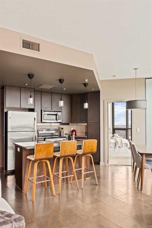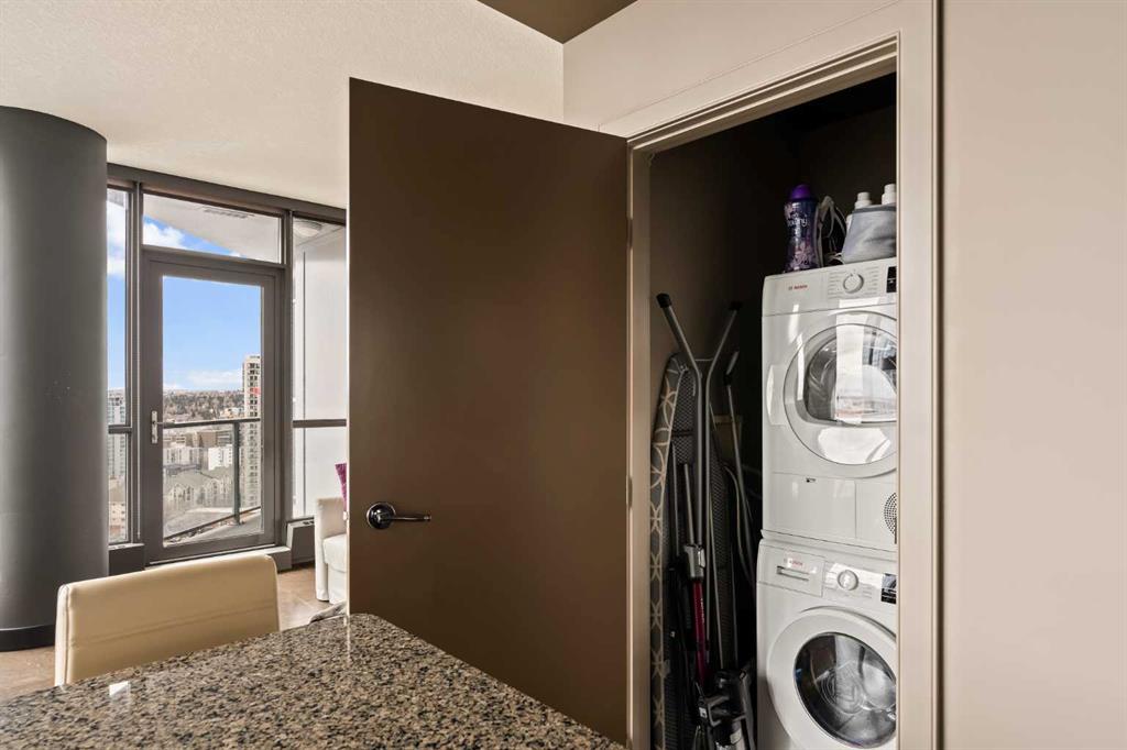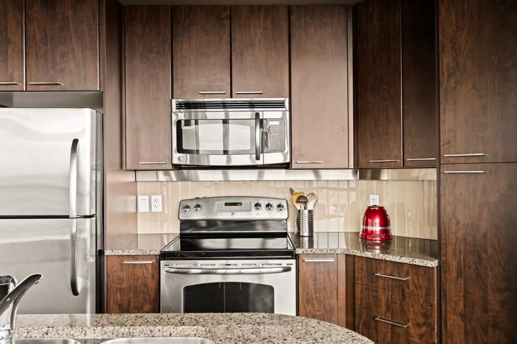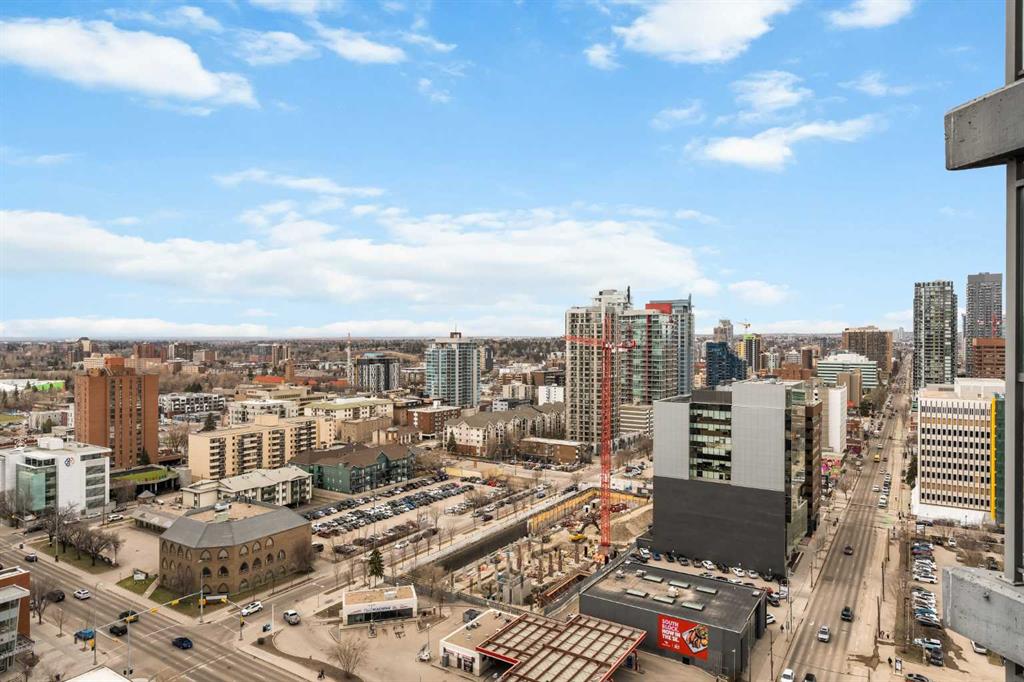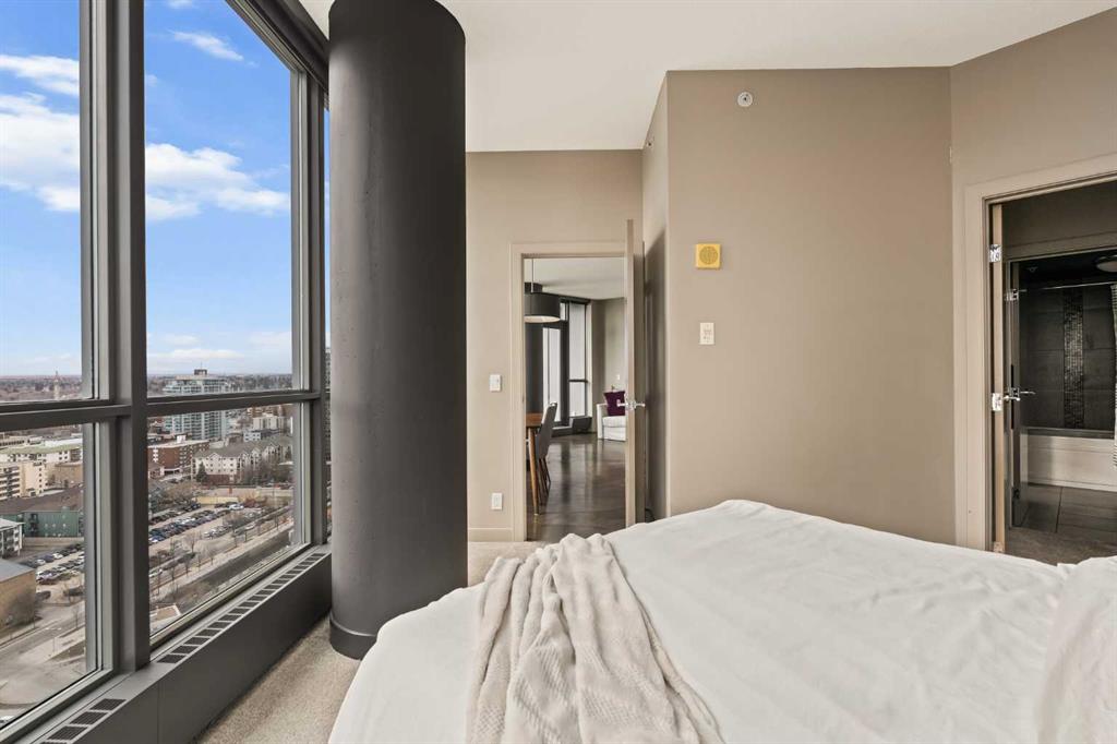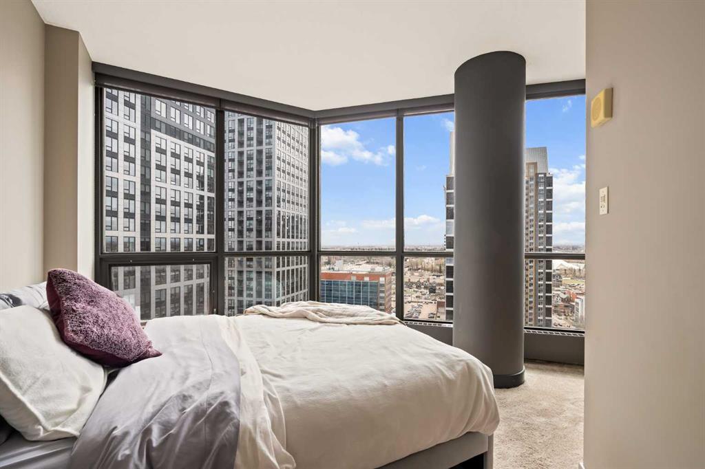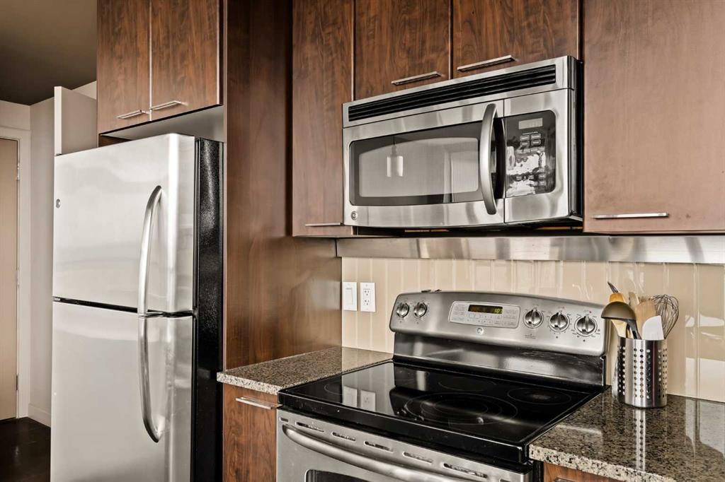Welcome to Unit 2008, located in the highly sought-after Keynote 1 building in the heart of Calgary’s vibrant Beltline. Perched on the 20th floor, this beautifully appointed 1-bedroom, 1-bathroom condo offers over 560 sq. ft. of thoughtfully designed living space, with stunning south-facing views over the Stampede Grounds and sweeping west-facing views toward the Rocky Mountains. Floor-to-ceiling windows fill the home with natural light throughout the day, creating a bright and inviting atmosphere. The open-concept layout seamlessly connects the kitchen, dining, and living areas, making the space ideal for both everyday living and entertaining. The timeless kitchen features a functional layout with granite countertops, stainless steel appliances, ample cabinetry, and a convenient island with seating. The living area is framed by expansive windows and provides direct access to a private balcony, perfect for enjoying your morning coffee, evening sunsets, or taking in the energy of the city below. The primary bedroom offers a comfortable retreat with space for a king-sized bed. Its unique layout allows for natural light while maximizing the views. The bedroom connects to a walk-through closet and a well-appointed 4-piece bathroom, which is also accessible from the main living area for added convenience. In-suite laundry (new in December 2025) and additional storage complete the interior. Residents of Keynote 1 enjoy access to exceptional amenities, including a fully equipped fitness centre, guest suites, owner’s lounge, and outdoor courtyard space. The building also offers the convenience of secure underground titled parking and direct access to Sunterra Market, making day-to-day living effortless. Situated just steps from downtown offices, restaurants, cafes, transit, the Stampede Grounds, and the river pathway system, this location offers the perfect balance of urban convenience and lifestyle. Combining elevated views, modern finishes, and an unbeatable location, this is downtown living at its finest.