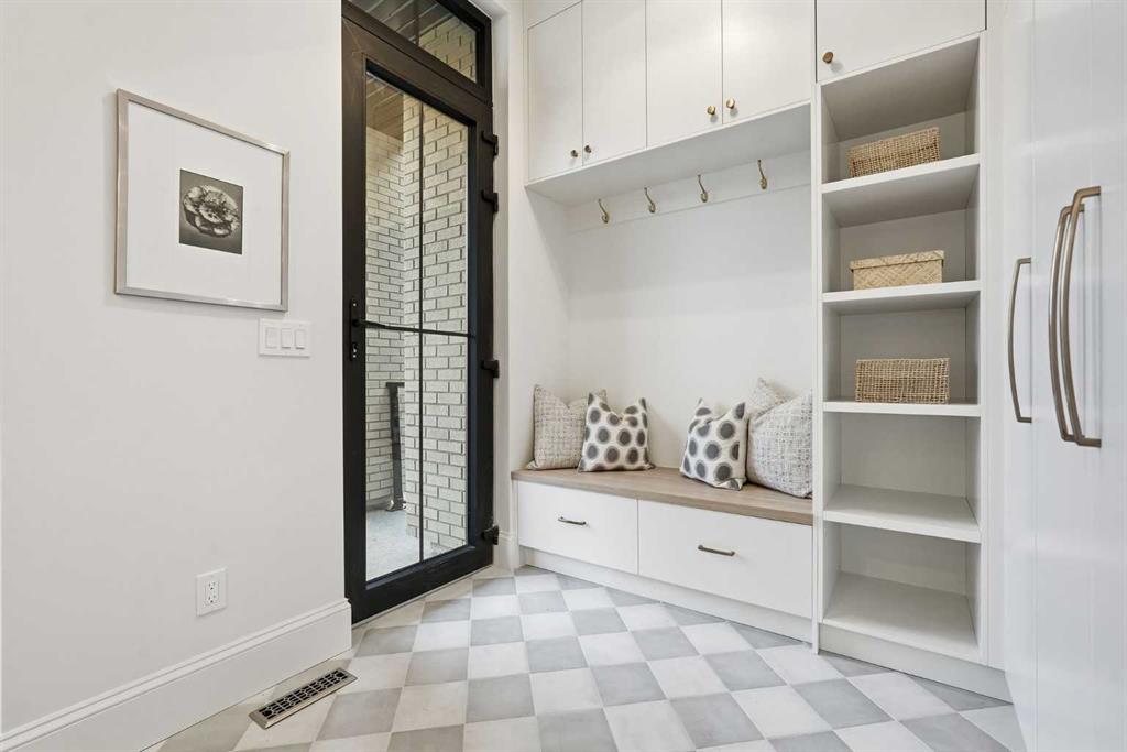 At the heart of the home, the chef’s kitchen is a true masterpiece. It features a 14-foot island with quartz from Hanstone (made in Canada), a quartz backsplash, plaster textured hood fan, pot filler, and oversized premium appliances including a 48” dual oven gas range and a 66” built-in fridge/freezer. There is a butler’s pantry with sink and cabinetry, mud room, coffee bar, and tons of storage including under the island. The kitchen is set up to be not only beautiful but also functional and includes a garbage drawer, bar cooler, and spice racks/cabinetry.
